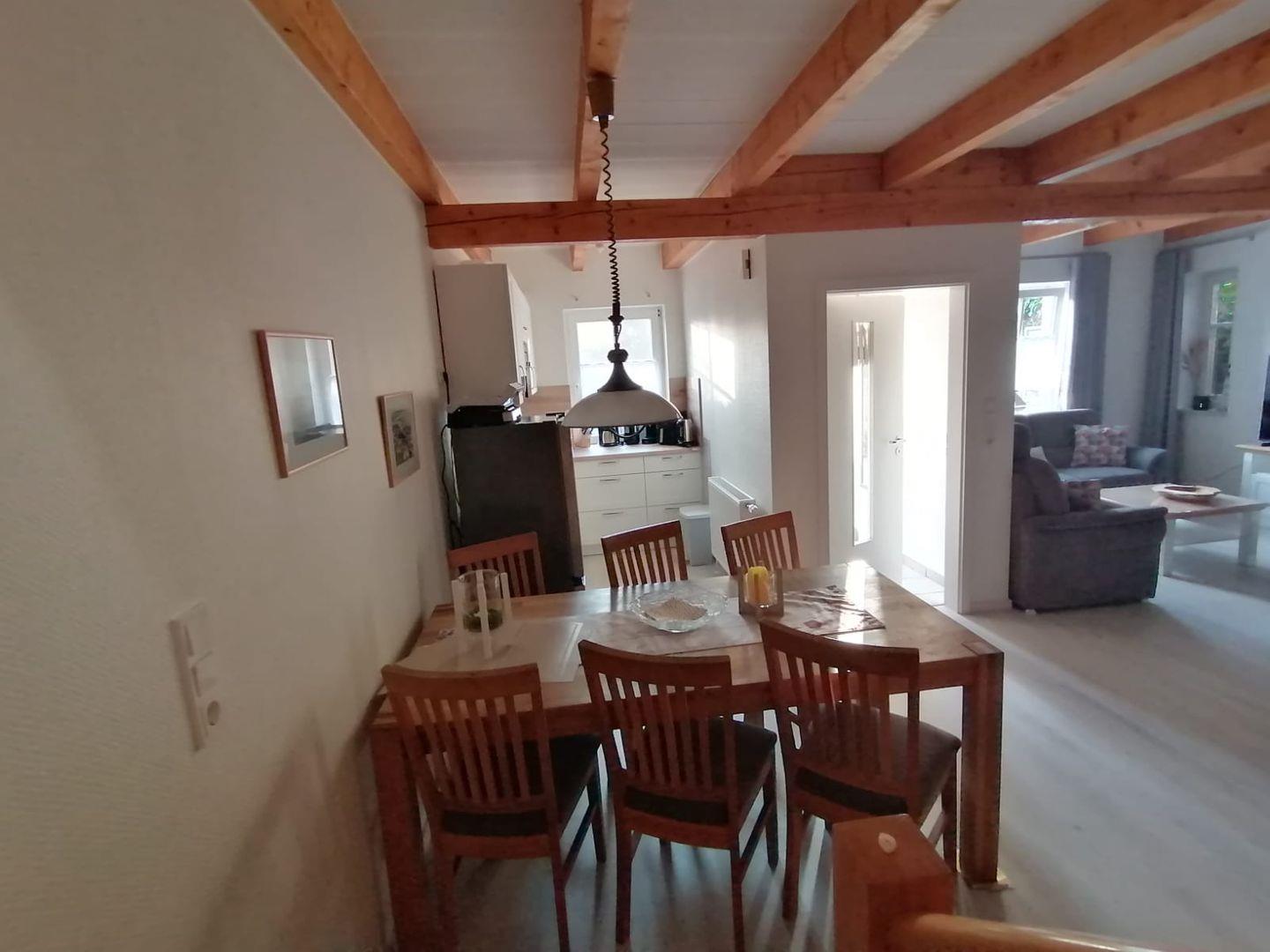 Das gemütliche Ferienhaus Tenne befindet sich im Alten Gulfhof, ruhig aber zentral gelegen. Hier findet die ganze Familie Platz und Ihr Vierbeiner ist auch herzlich willkommen. Kommen Sie herein! Das Objekt wurde Anfang 2025 komplett renoviert. Der große Wohn-Essbereich und Küche mit Balkenlage lädt zu einem Wohlfühlurlaub ein. Der gemütliche Wohnbereich verfügt über 2 bequeme Sofas und einen Sessel. Genießen Sie hier schöne Abende. Der große Flachbild-Fernseher sorgt für Unterhaltung. Am großen Esstisch hat die ganze Familie Platz. Angrenzend befindet sich die vollausgestattete neuwertige Küche. Hier können regionale Gerichte zubereitet werden. Neben dem Wohnbereich finden Sie eine kleine abgetrennte Butze, wo ein weiteres ausziehbares Bett steht, das noch einmal Platz für max. 2 Personen bietet. Im Erdgeschoss befindet sich ebenfalls ein Gäste-WC und ein Abstellraum. Im Obergeschoss liegen die 2 Schlafzimmer, eines mit einem Doppelbett und eines mit 2 Einzelbetten. Ein Kinderbettchen ist vorhanden. Das helle Duschbad liegt ebenso im OG. Hier steht auch eine Waschmaschine. Alles ist hell und freundlich eingerichtet. Die Balken im ganzen Haus vermitteln viel Gemütlichkeit. WLAN und Magenta TV sind verfügbar! Genießen Sie die frische Nordseeluft auf der möblierten Terrasse, lassen Sie die Seele baumeln. Ein Parkplatz ist vorhanden. Mitgebrachte Fahrräder können unter dem zum Gulfhof gehörenden Carport untergestellt werden.