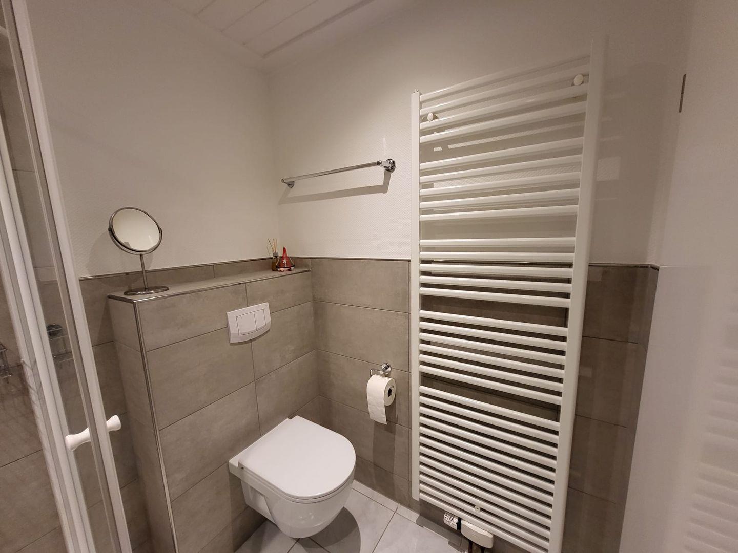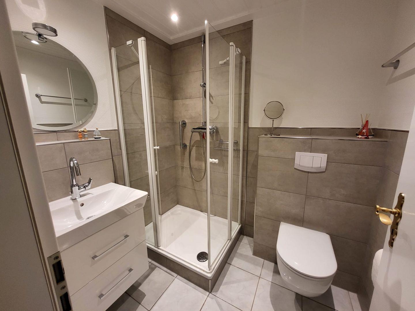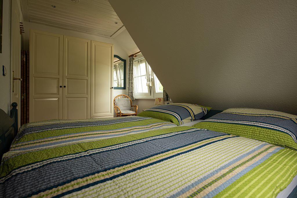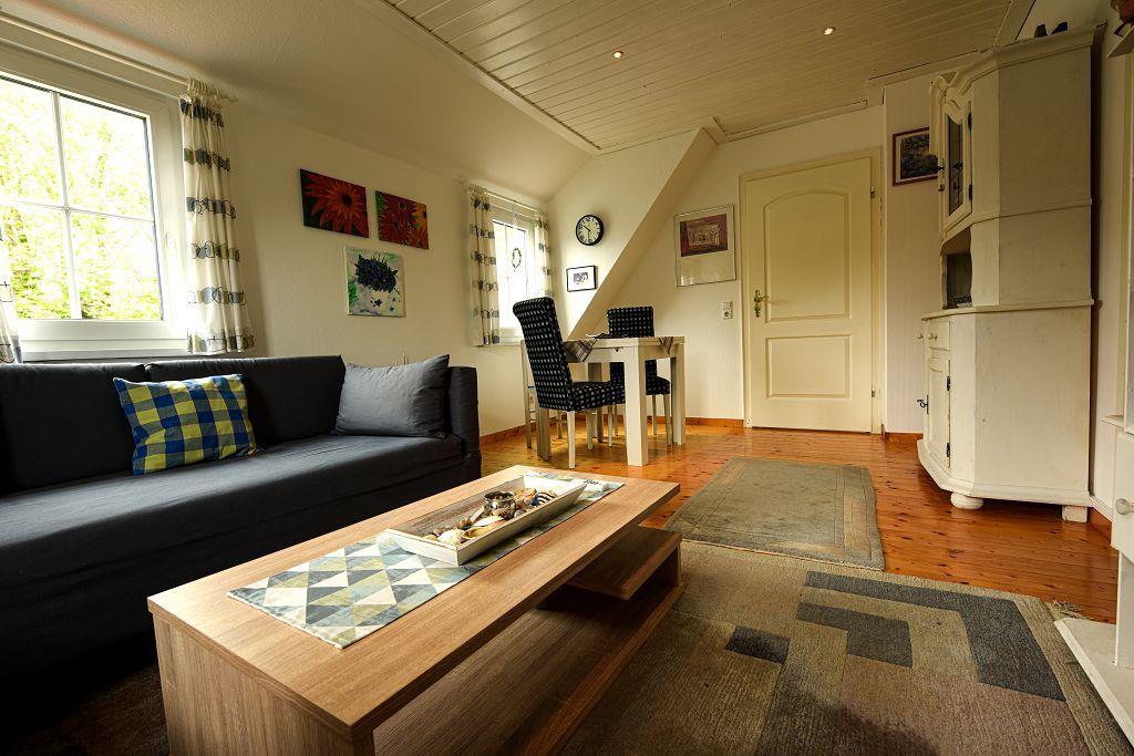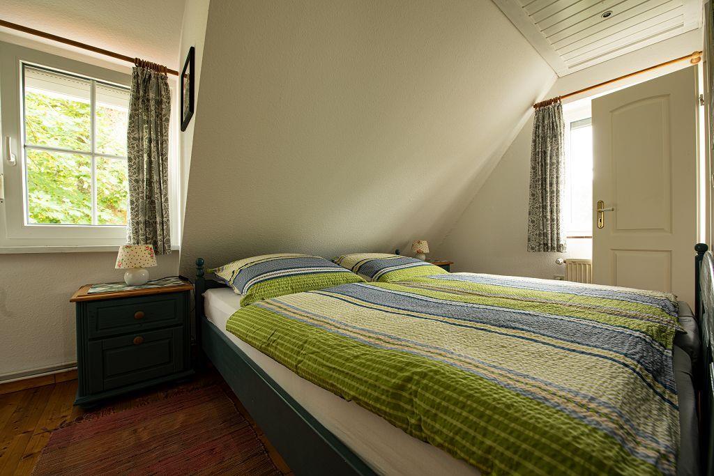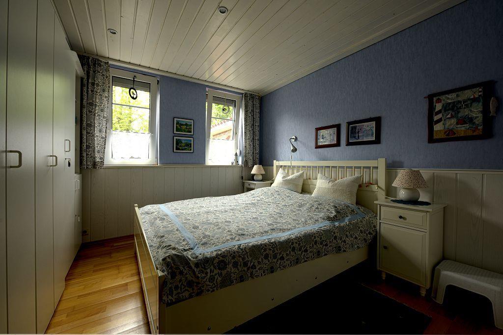 Im Obergeschoß erwartet Sie zuerst eine voll ausgestattete Küchezeile. Im Wohnzimmer mit Essecke steht das gemütliche Ecksofa zum Relaxen . HIFI und TV sind auch hier selbstverständlich. Auf dem Balkon mit Sicht in den Garten finden Sie Ruhe und Entspannung. Das Schlafzimmer ist mit einem Doppelbett ausgestattet. Das Duschbad vervollständigt den oberen Bereich.