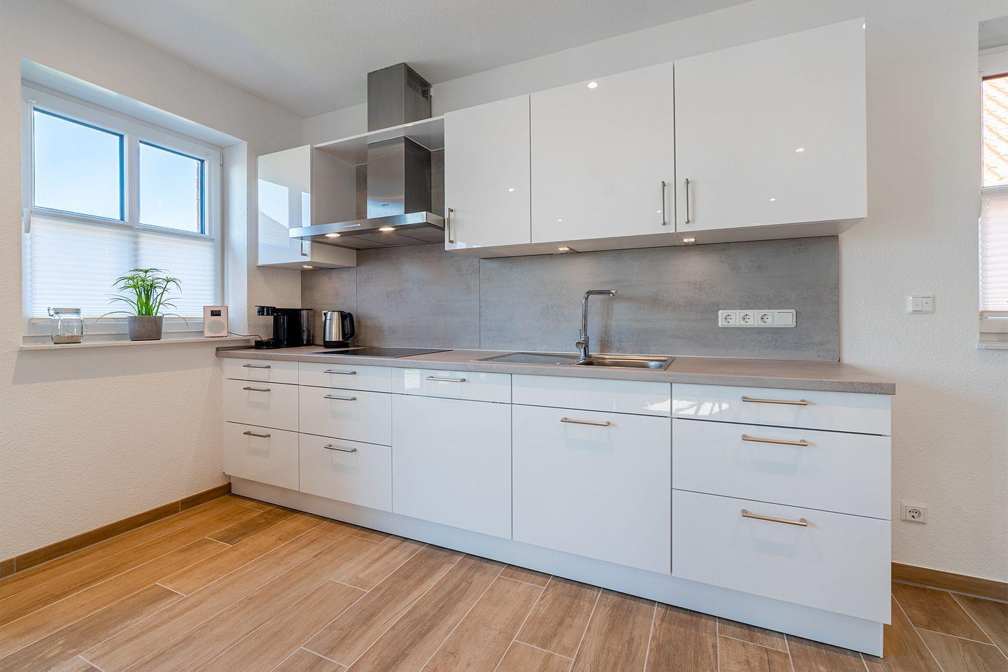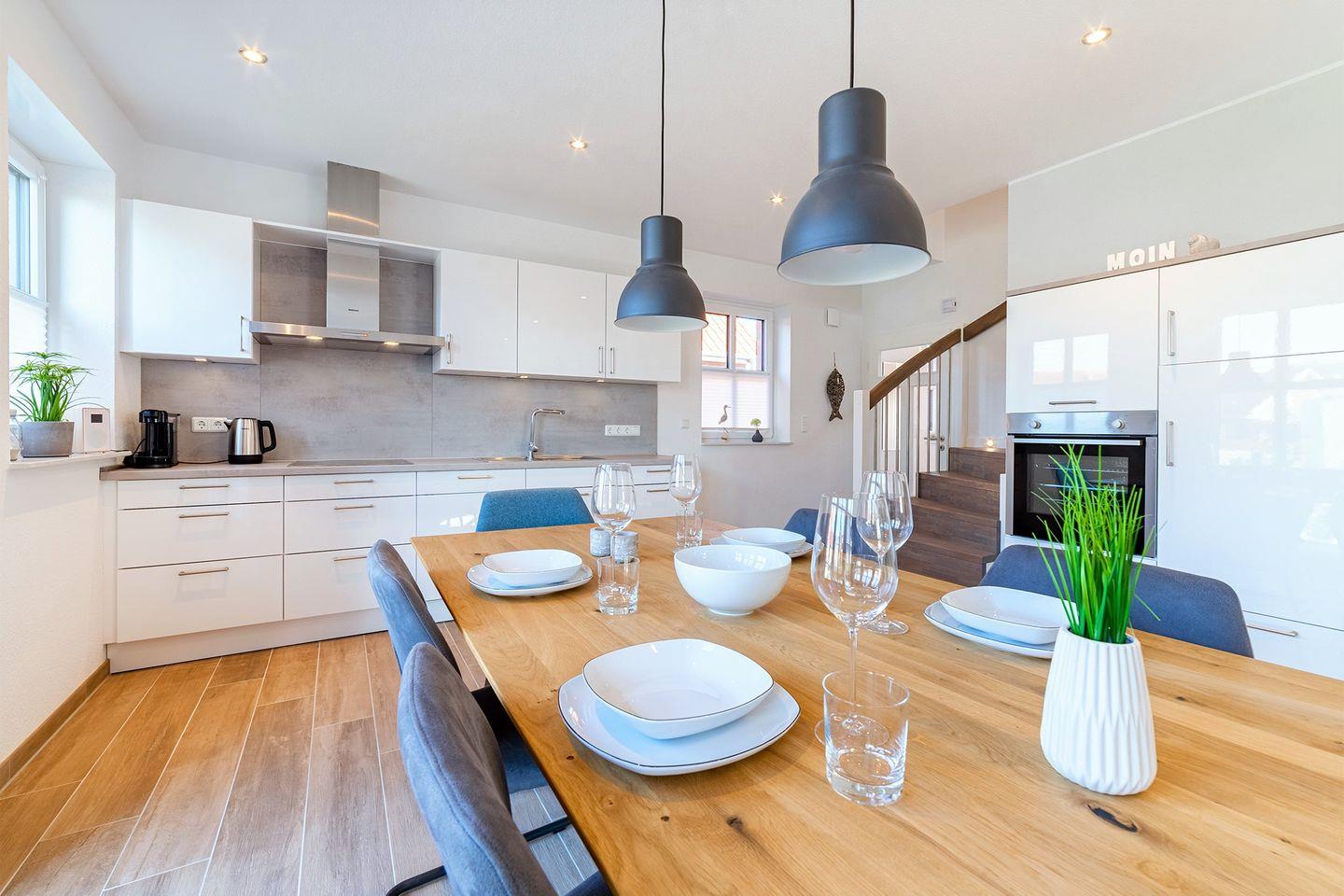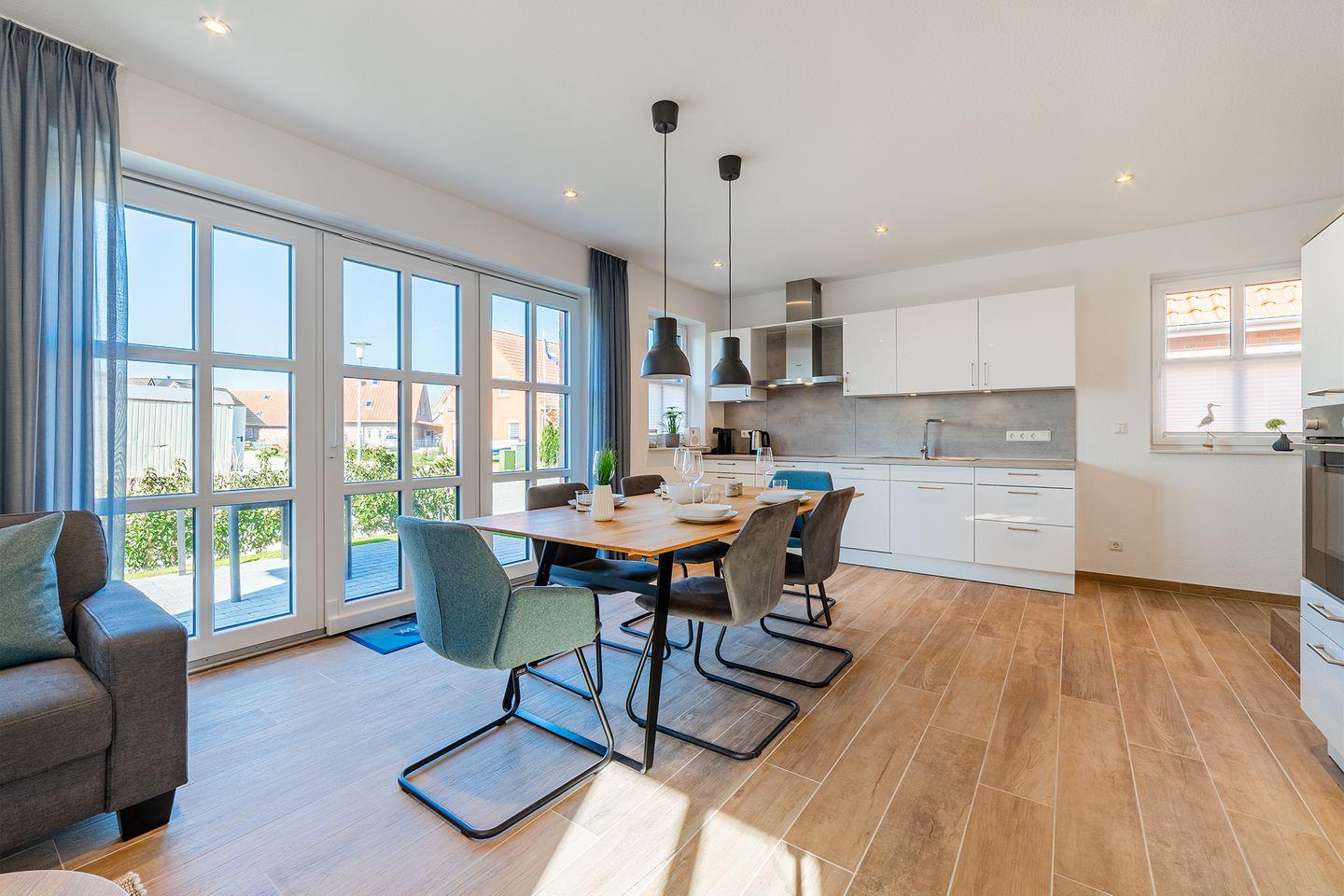 Ein großer Wohn- und Essbereich mit einer umfangreich ausgestatteten Küche bildet den Mittelpunkt des Hauses.
