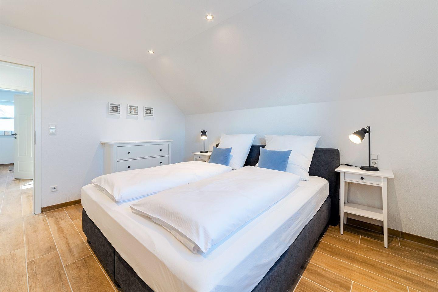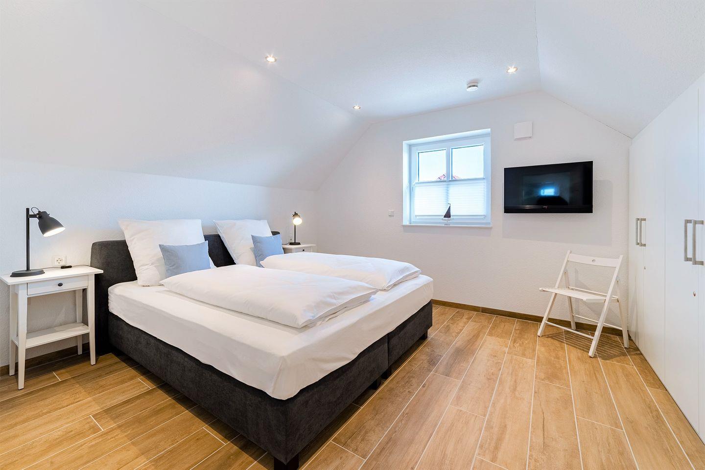 Schlafzimmer mit Boxspringbett (180x200 cm) und TV im OG