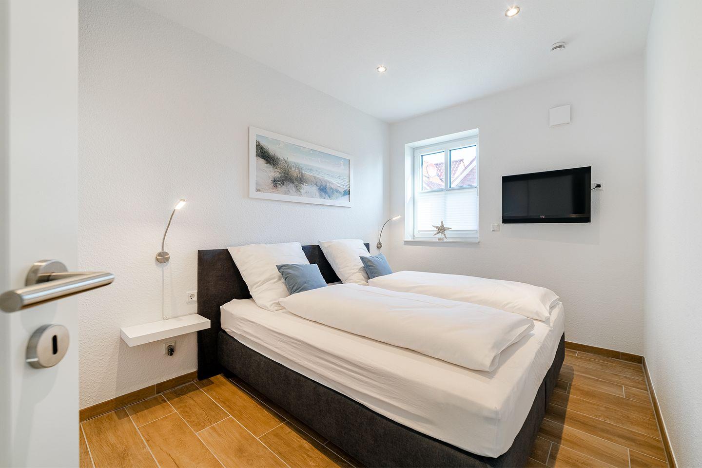 Schlafzimmer mit Boxspringbett (180x200 cm) und TV im EG