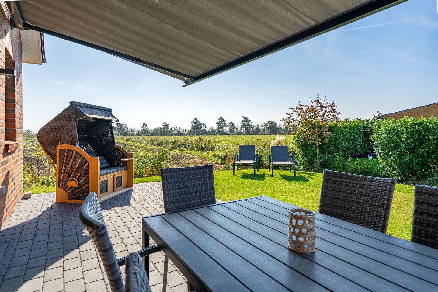 Ein schöner Gartenbereich mit einer Terrasse (südwestlich), die über eine elektrische Markise verfügt