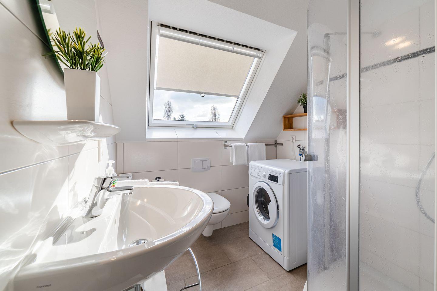 Das Badezimmer verfügt über eine Dusche mit niedrigem Einstieg sowie einen Wasch-/Trockner.