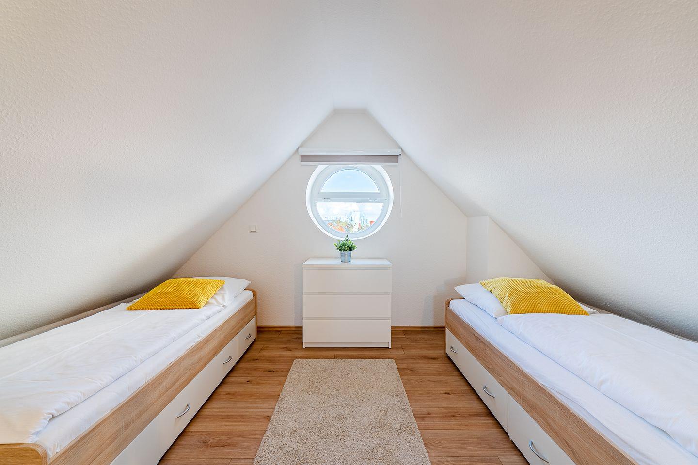 Zwei weitere Einzelbetten sowie ein Kinderbett stehen auf der großzügigen und hellen Galerie zur Verfügung.