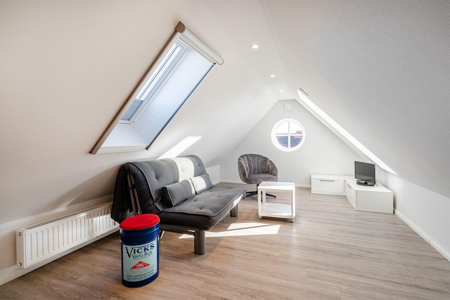 Das Dachgeschoss bietet einen zweiten Fernseher und lädt zu ruhigen Stunden ein.