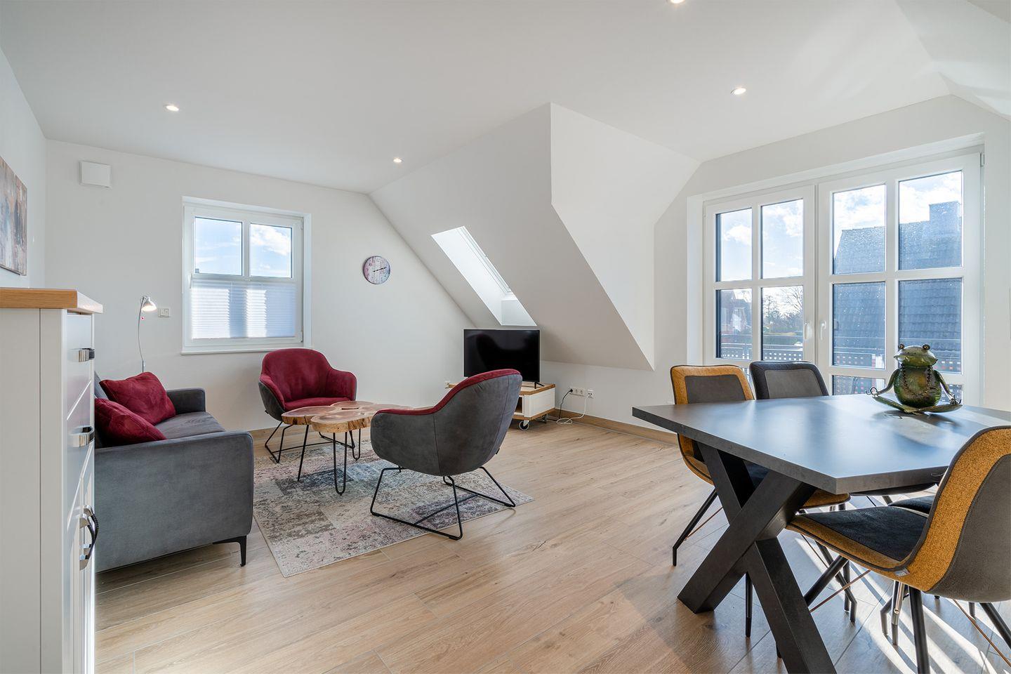 Die Ferienwohnung Eisvogel bietet modernen Komfort mit einem hellen Wohnbereich, voll ausgestatteter Küche, Schlafzimmer und stilvollem Badezimmer. Das Dachgeschoss mit zusätzlichem Fernseher und Funktionssofa bietet Platz für weitere Gäste. Genießen Sie die Nordseeluft auf dem Balkon mit elektrischer Markise. Ein PKW-Stellplatz, Fahrradraum und optionaler Wäschepaket-Service sorgen für einen sorglosen Aufenthalt. Ihr perfekter Urlaub an der Nordsee!