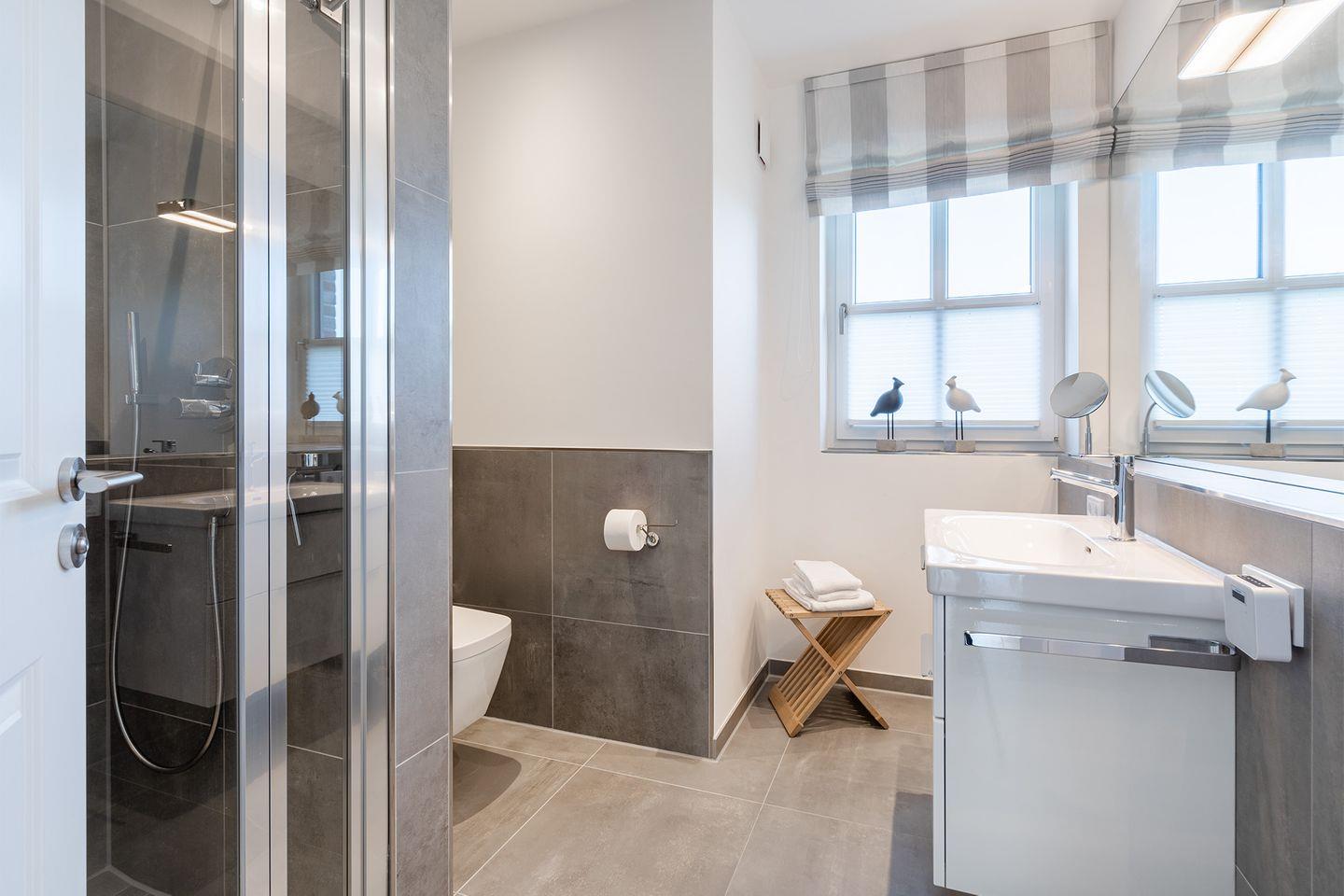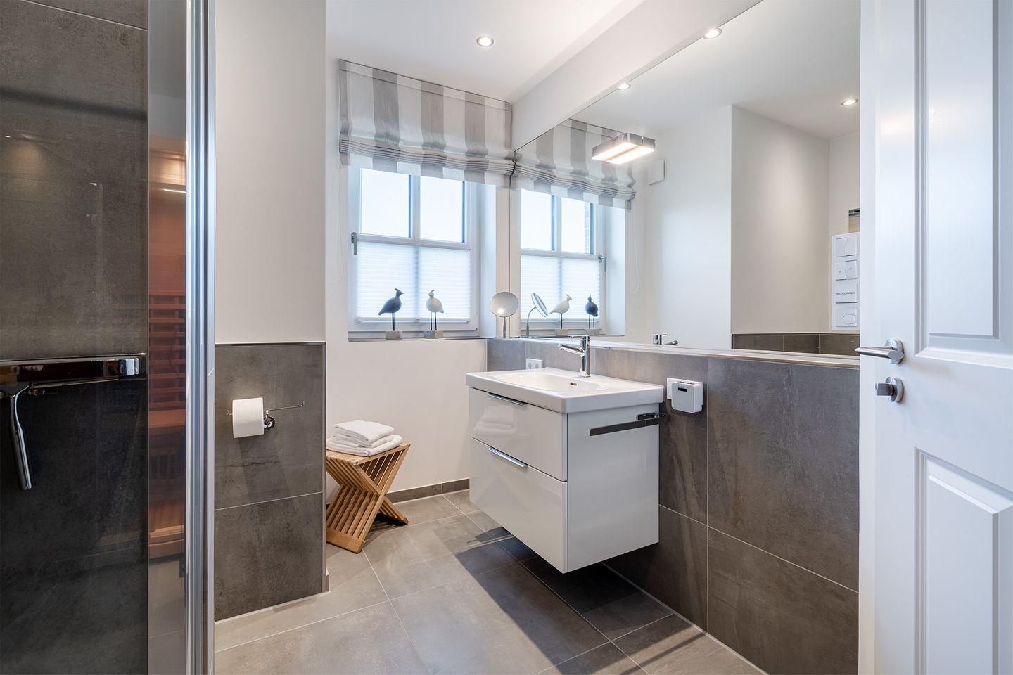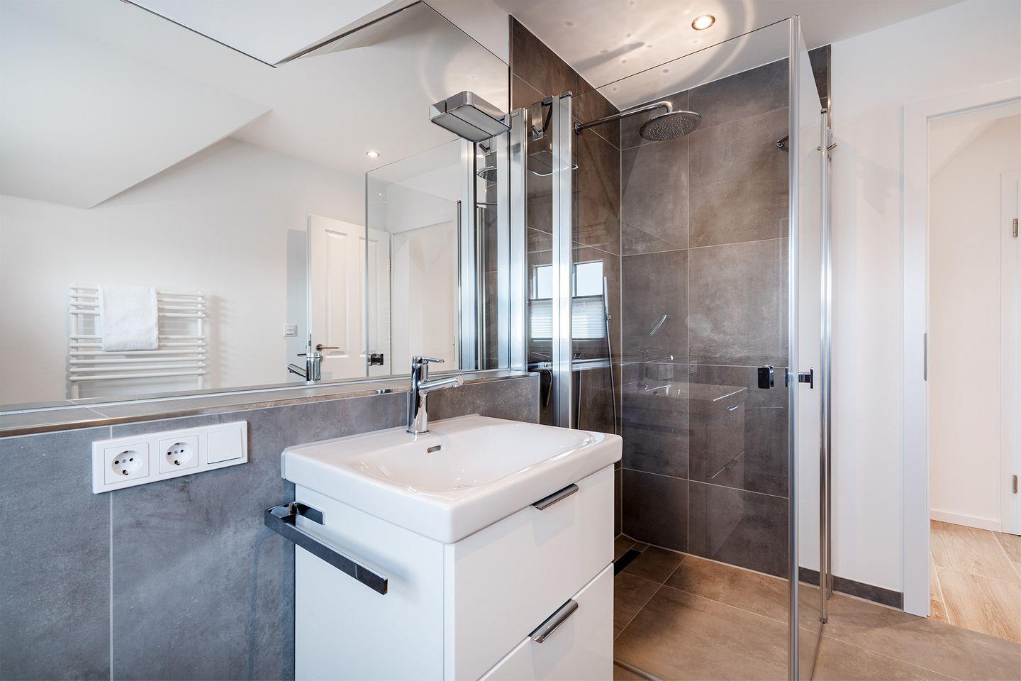 Beide Bäder sind mit Fußbodenheizung, Handtuchheizkörper, Großflächenspiegel, Kosmetikspiegel, Regendusche und TECE One Dusch WC ausgestattet.