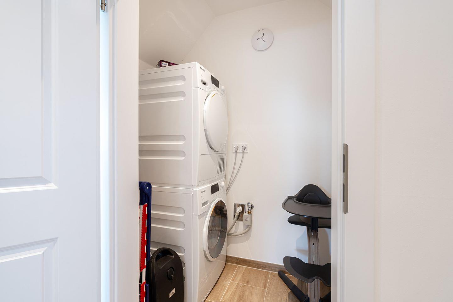 Hauswirtschaftsraum mit Miele Tower (Waschmaschine und Trockner)