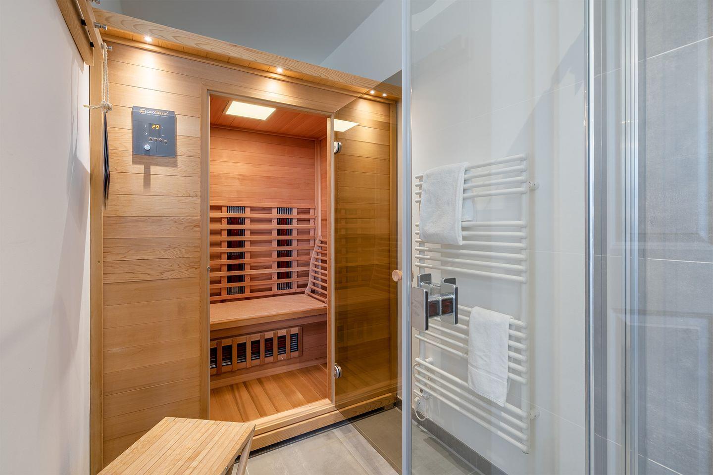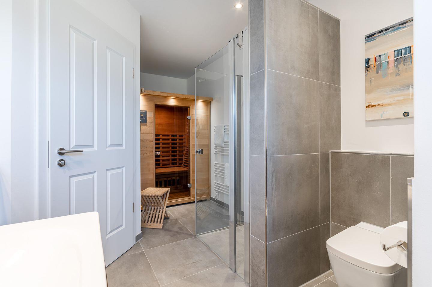 Infrarot-Tiefenwärmekabine im Erdgeschossbad mit fernbedienbaren Farblicht-LEDs, Bluetooth Körperschalllautsprechern und Bio-Ultraschall Salz-Solevernebeler