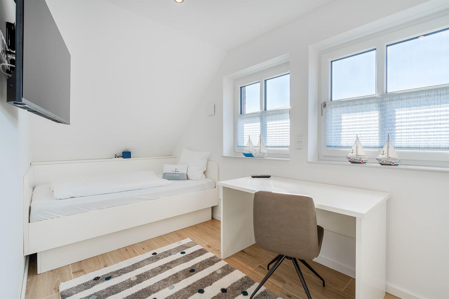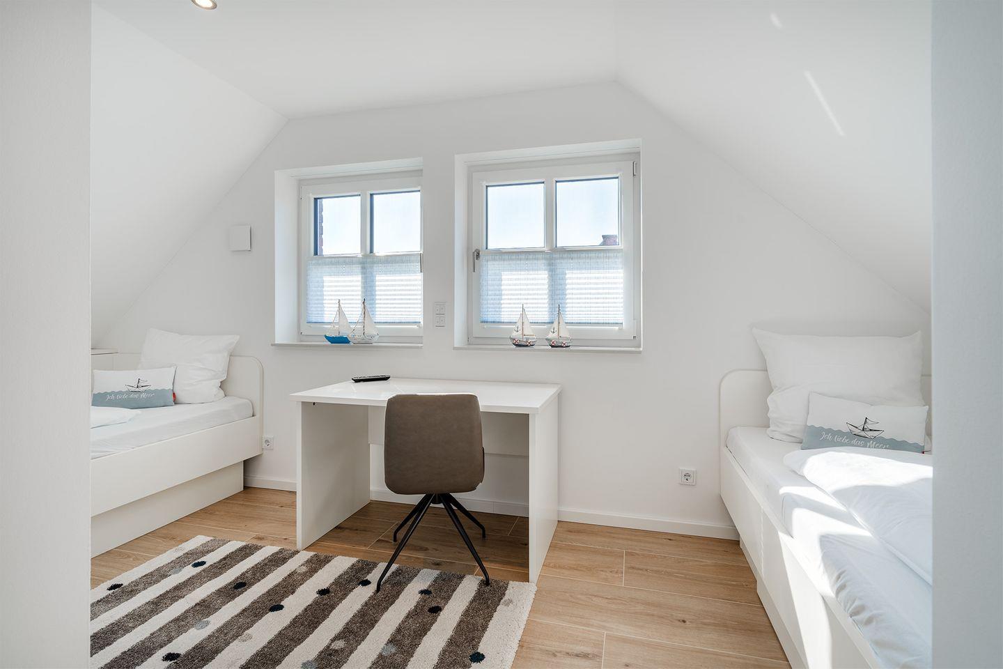 Kinderzimmer/Büro im Obergeschoss: Schreibtisch und zwei Kojenbetten (120x200 cm und 90x200 cm)