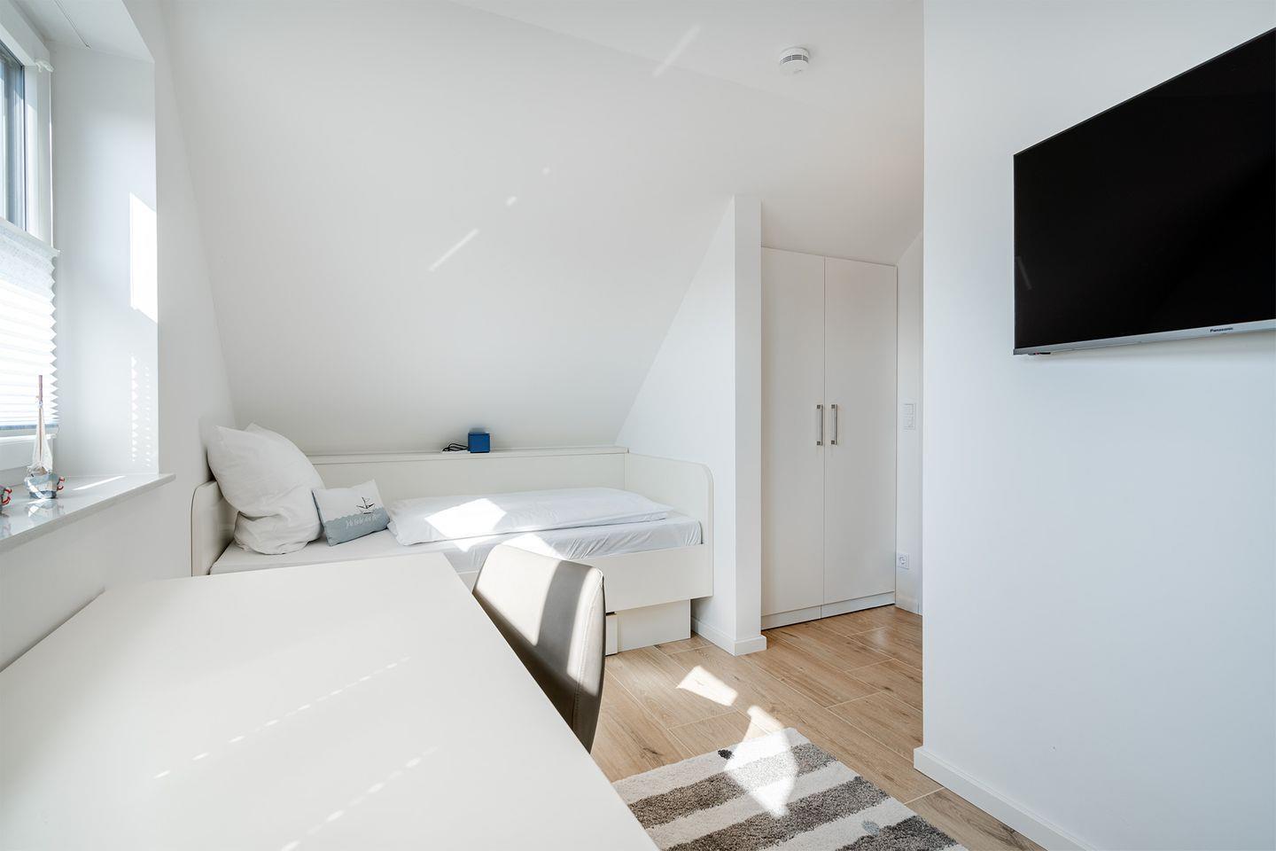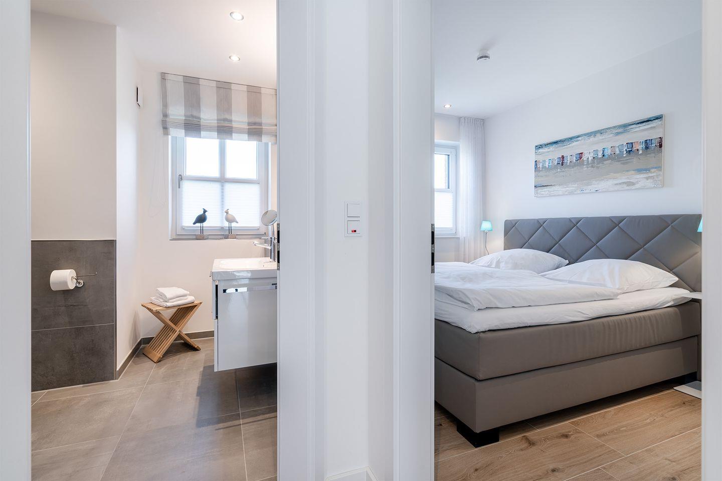 Die 'Meerliebe' ist ideal für 6 Personen. Für Kinder sind spezielle Annehmlichkeiten wie ein Kinderstuhl, Reisebett und Geschirr vorhanden. Die Schlafzimmer bieten Boxspringbetten, während die Bäder mit luxuriösen Details wie z. B. einer Infrarot-Tiefenwärmekabine ausgestattet sind. Der großzügige Garten mit Terrasse, Grill und Strandkorb lädt zum Entspannen ein. Weitere Annehmlichkeiten sind Fußbodenheizung, elektrische Rollläden und kostenfreie Fahrräder