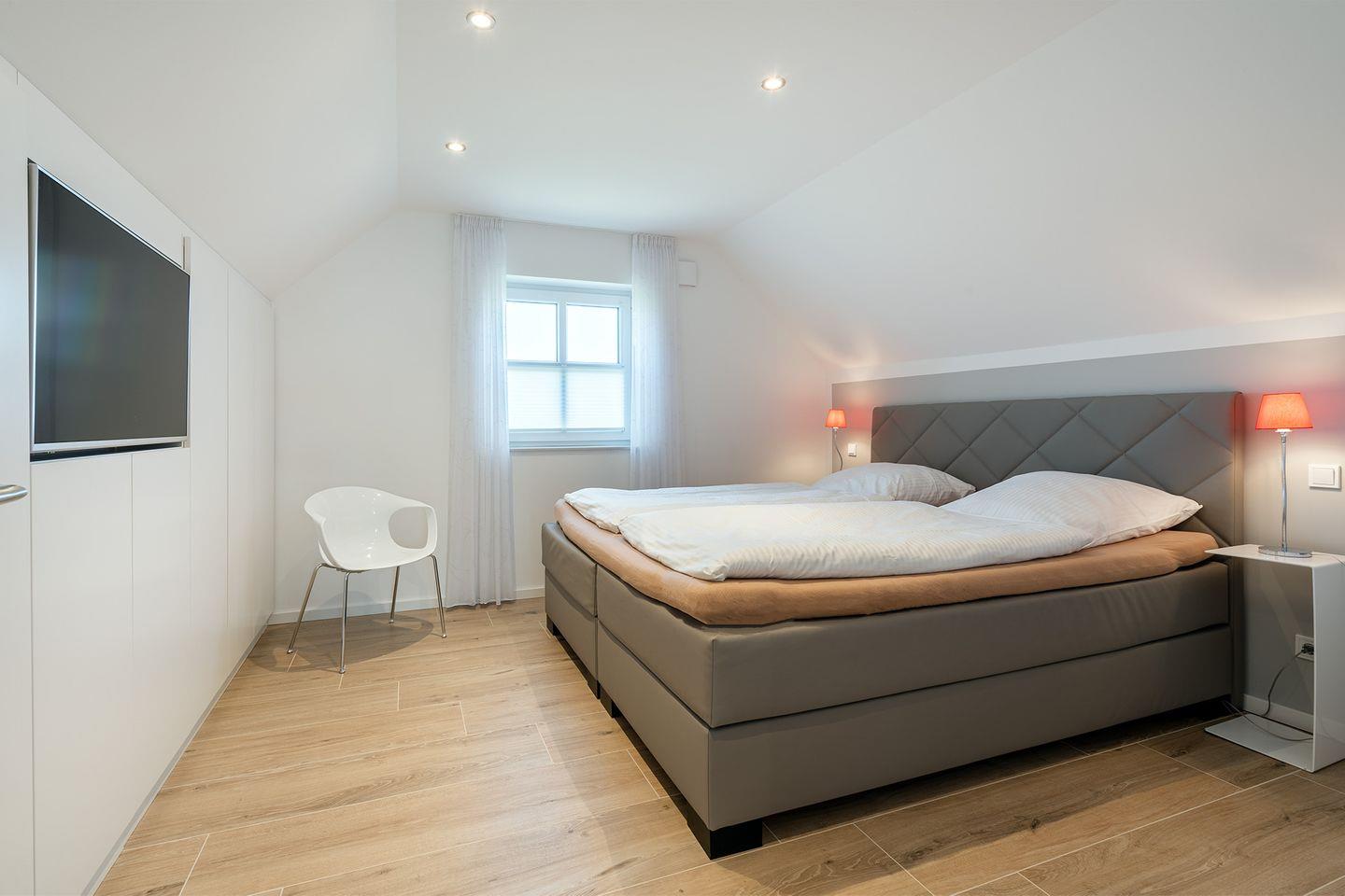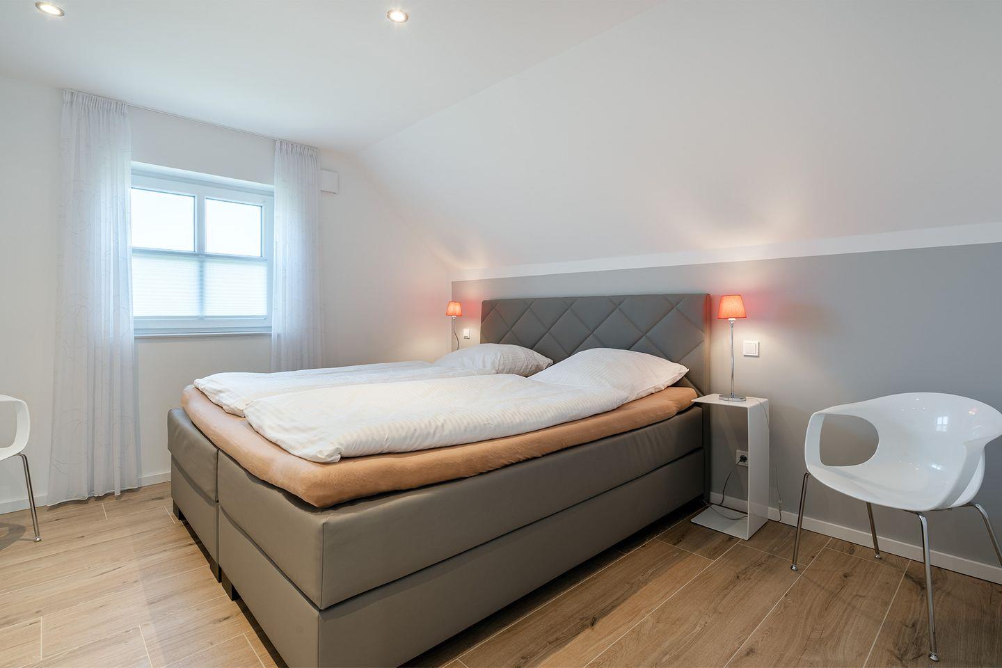 Schlafzimmer im Obergeschoss: Boxspringbett (200x220 cm) mit Viscoschaumtoppper