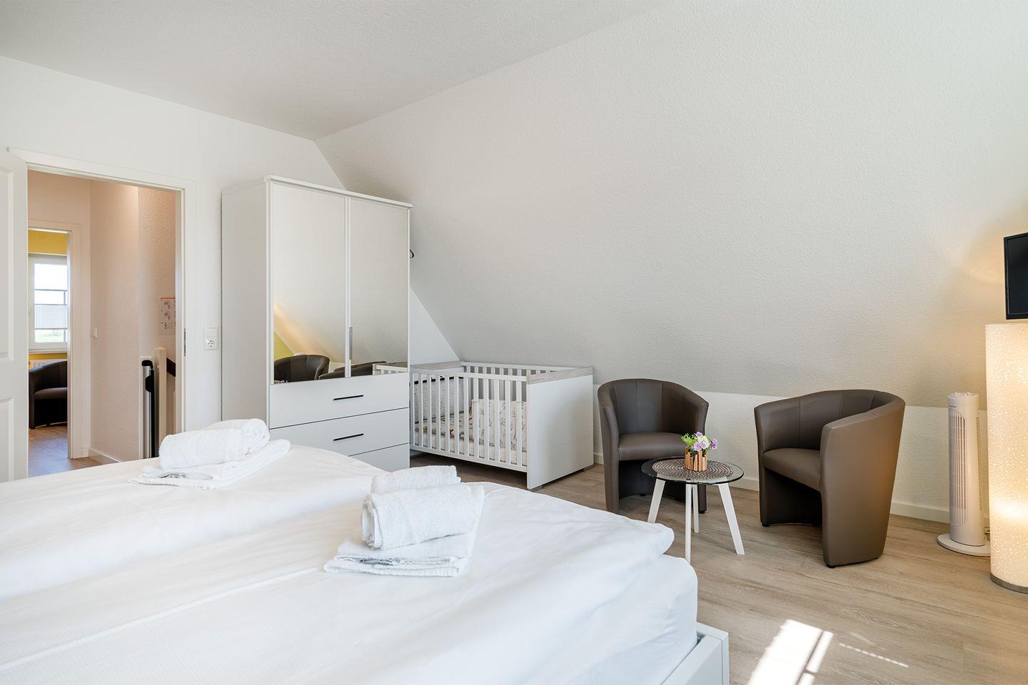 Ein Kinderbett, ein Reisebett sowie zwei Hochstühle stehen zur Verfügung.