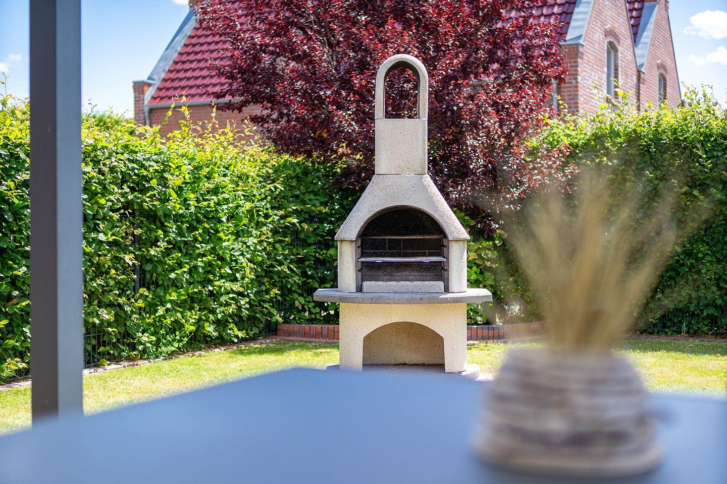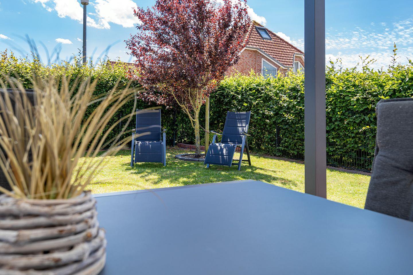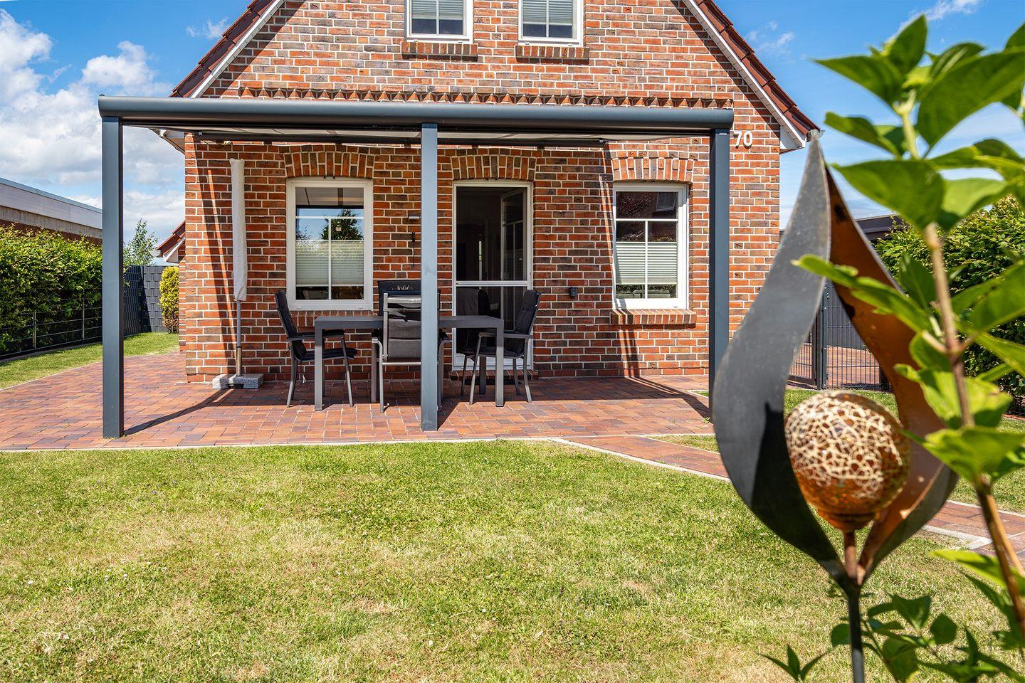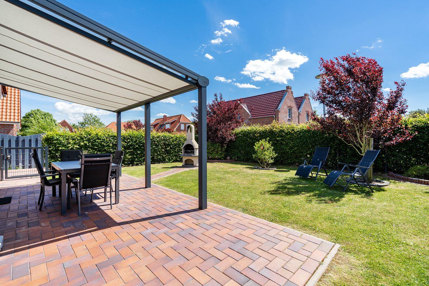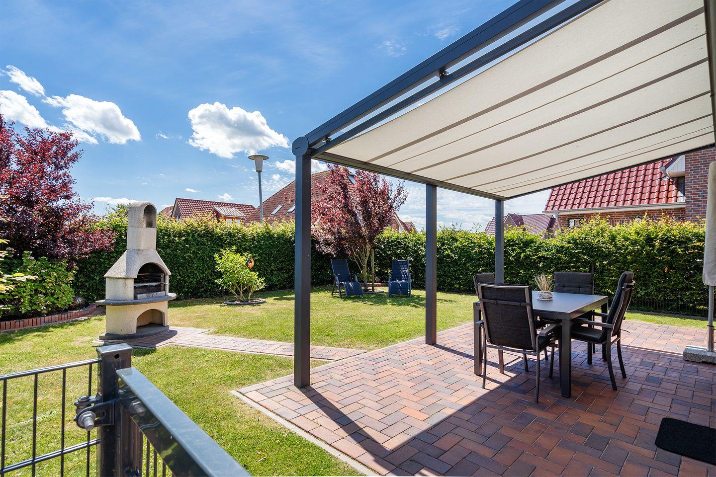 Auch draußen im Garten werden sich alle wohlfühlen. Auf dem eingezäunten Grundstück gibt es ausreichend Platz für Kinder und Hunde, die sich austoben können. Durch die nicht einsehbare Hecke bleibt Ihre Privatsphäre gewahrt, wenn Sie abends auf dem Kamingrill leckere Gerichte zubereiten oder an Sommertagen auf den Liegen entspannen möchten. Bei schlechtem Wetter sorgt die Terrassenüberdachung für Wind- und Regenschutz, während die Terrasse im Sommer elektrisch beschattet werden kann.