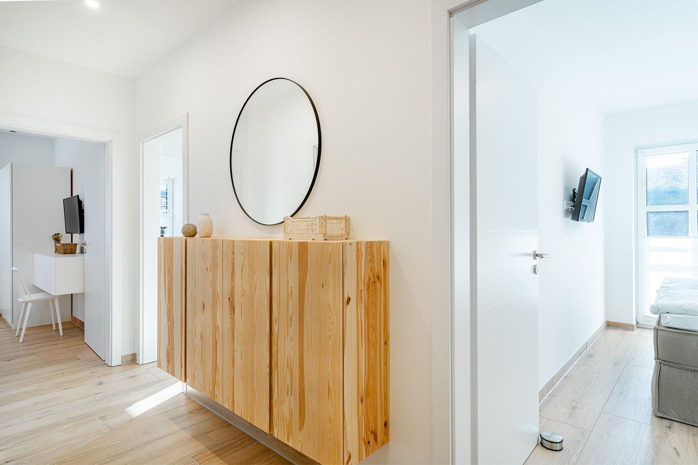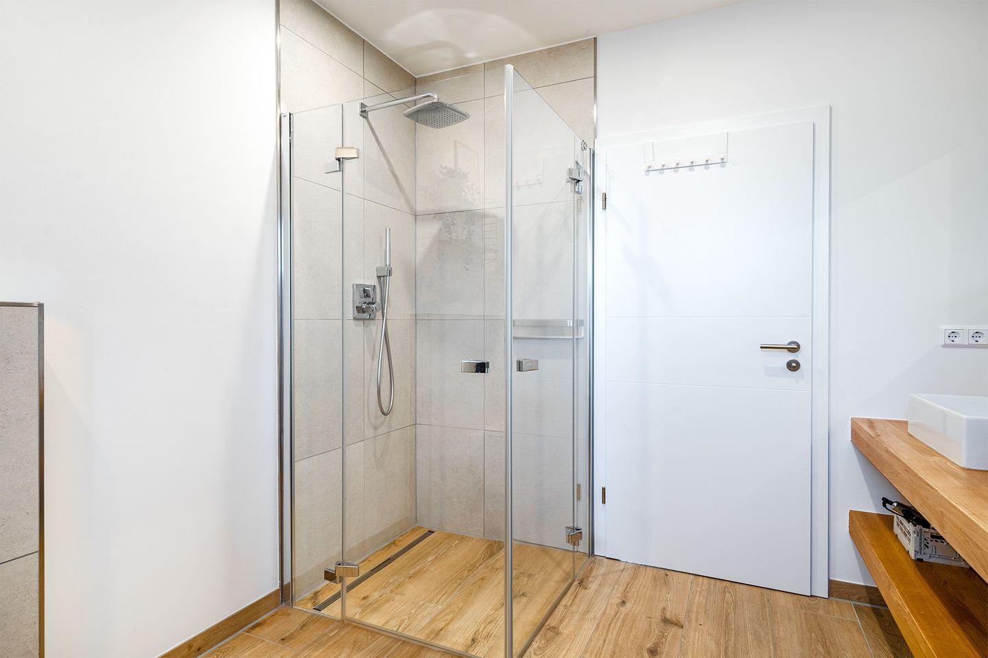 Badezimmer: Das Badezimmer ist mit einem Doppelwaschbecken ausgestattet und bietet ausreichend Platz für eine entspannte Auszeit.