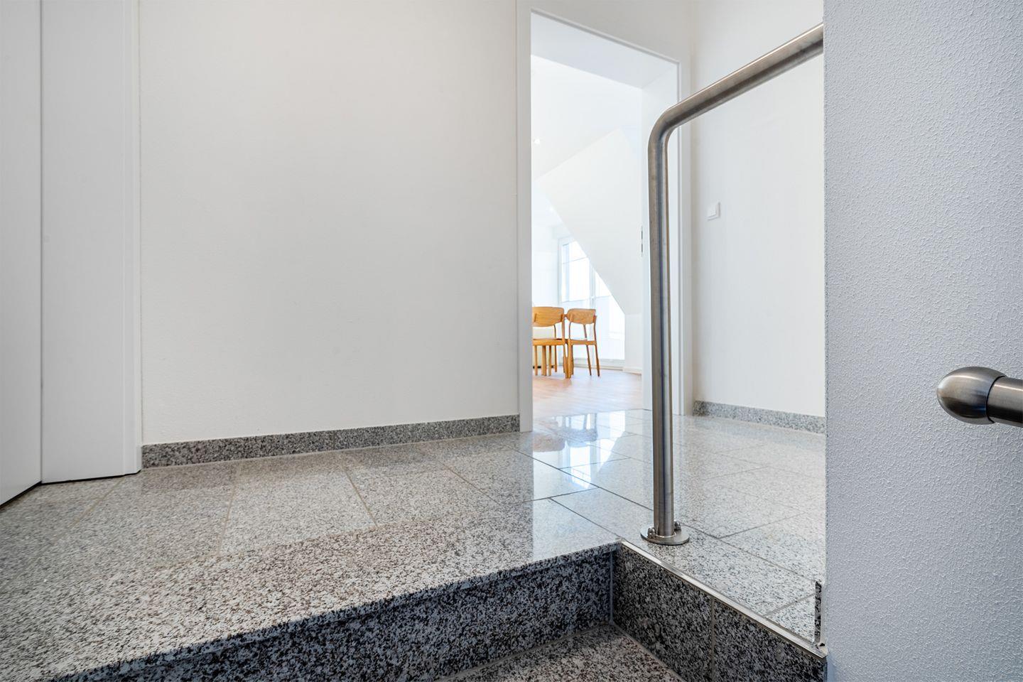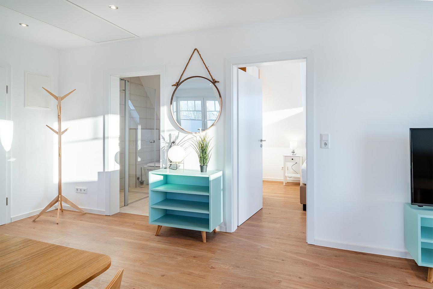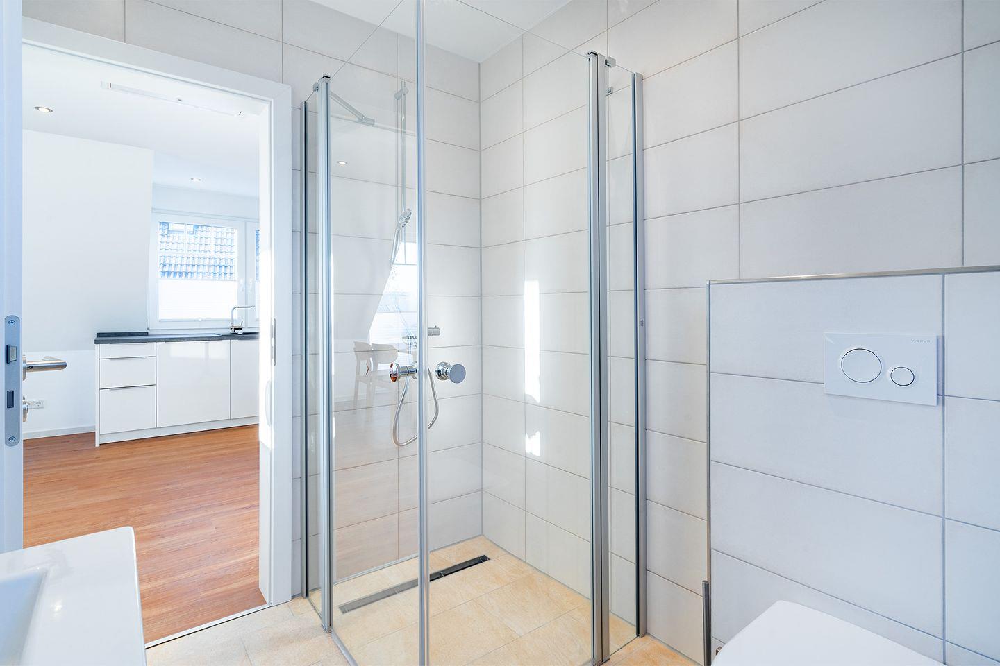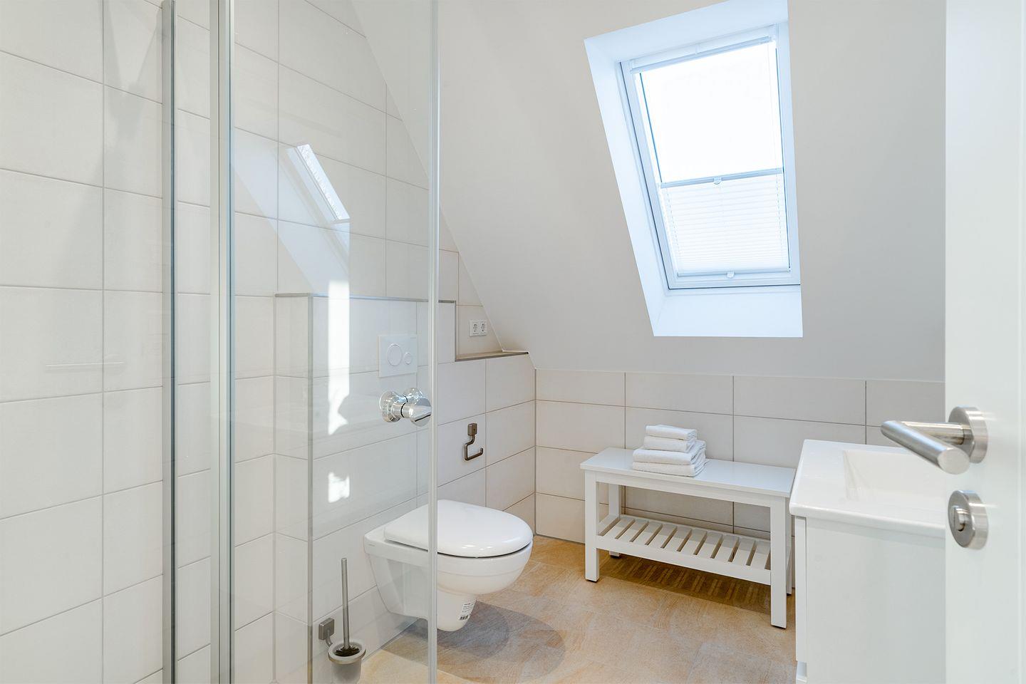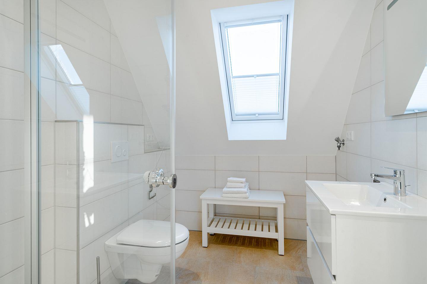Das Bad ist mit einer bodengleichen begehbaren Dusche ausgestattet und bietet alles, was Sie benötigen, um sich frisch und entspannt für den Tag vorzubereiten.