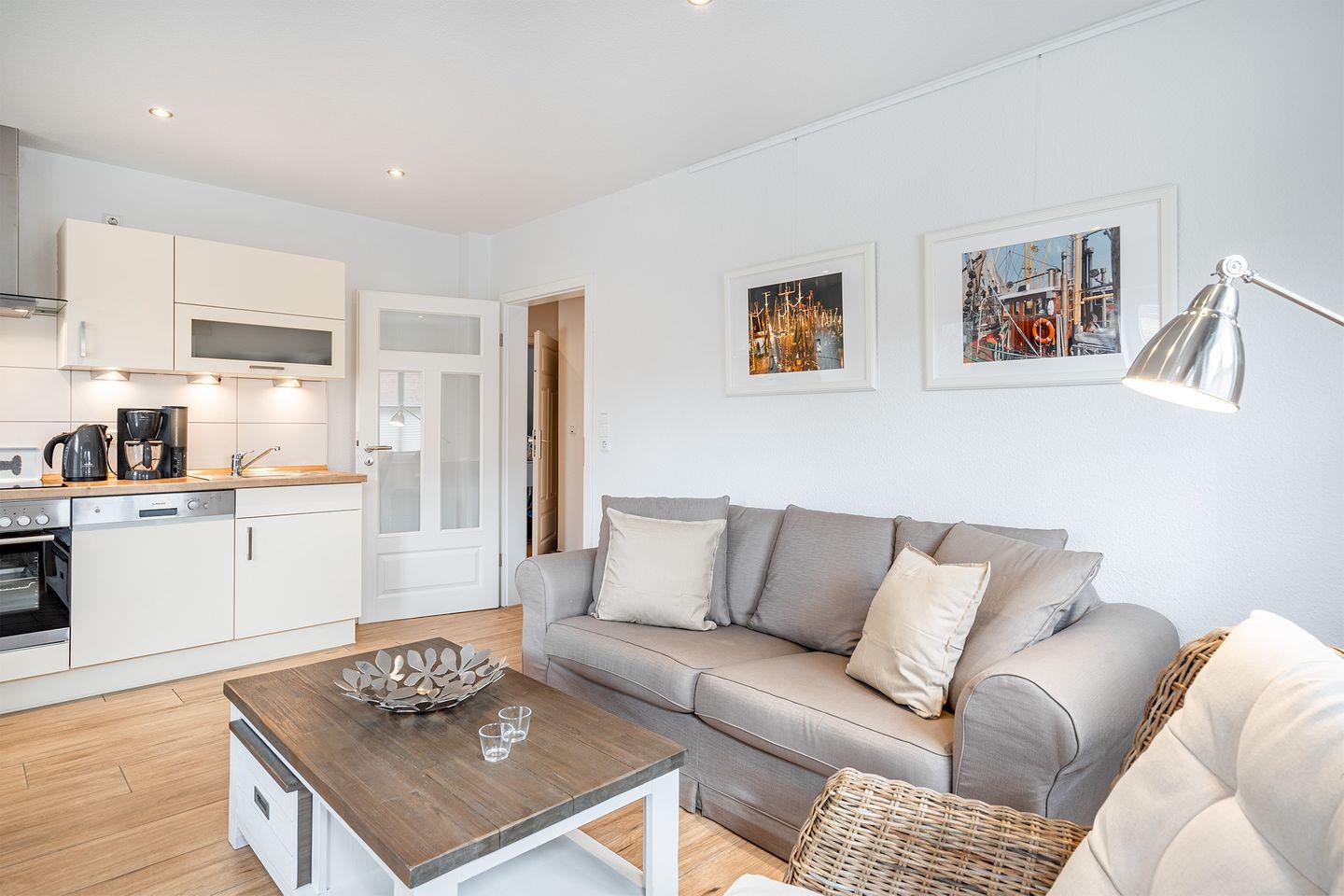 Der offene, gemütliche Wohn-Essbereich ist mit einer modernen Küche und einem TV ausgestattet. Hier finden Sie alles, was Sie für einen entspannten Urlaub benötigen. Durch die bodentiefen Fenster wird der Raum lichtdurchflutet und schafft eine angenehme Wohlfühlatmosphäre. Direkt vom Wohnbereich aus haben Sie Zugang zur Terrasse und dem kleinen Garten, der im Sommer zum Entspannen und Verweilen einlädt.
