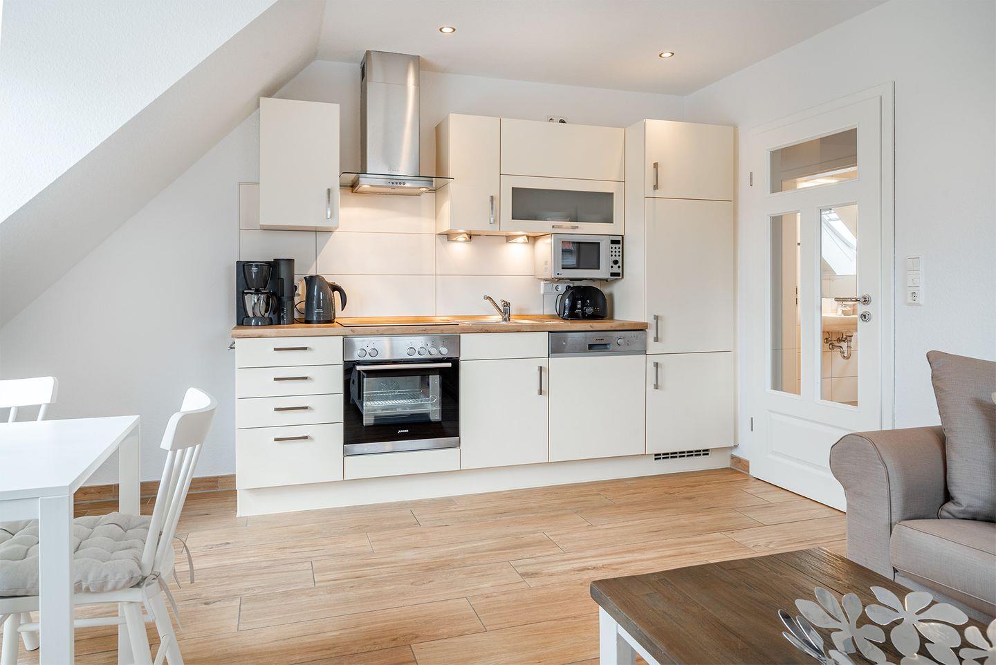 Die Ferienwohnungen 'An't Diekstreek' in Greetsiel bieten eine ideale Lage direkt am Hafen. Das Haus verfüget über insgesamt vier Wohnungen. Die Obergeschosswohnung 'An’t Diekstreek 04' hat einen gemütlichen Wohn-Essbereich mit moderner Küche, zwei Schlafzimmer mit Boxspringbetten, ein komfortables Bad und einen Balkon für gemütliche Stunden im Freien.