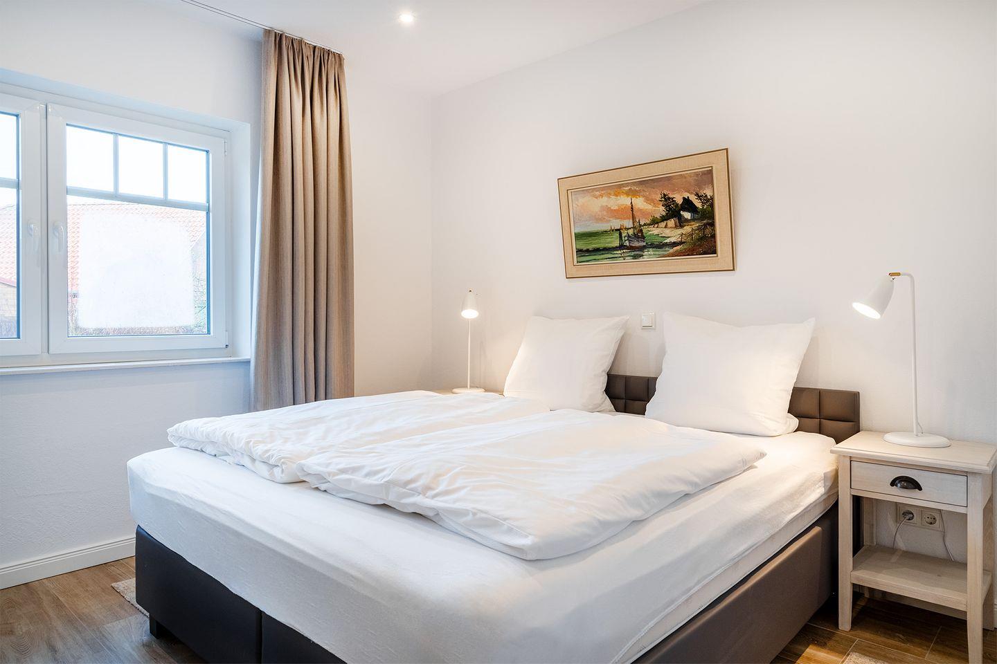 Das erste Schlafzimmer ist mit einem komfortablen 180x200 cm Boxspringbett ausgestattet.