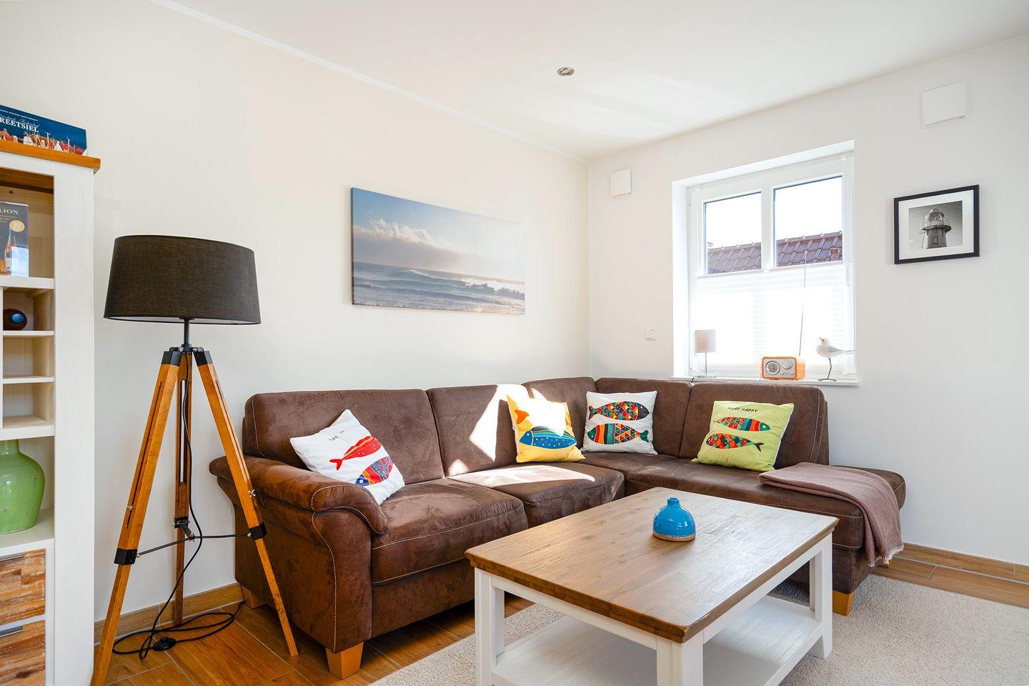 Die Ferienwohnung bietet einen Wohnraum mit voll ausgestatteter Küche, gemütlichem Essplatz und einem hellen Sitzbereich. Das geschmackvoll eingerichtete Duschbad und der geschützte Balkon mit Südwestlage laden zum Verweilen ein. Im Dachgeschoss befindet sich ein Studio mit Panoramafenster und zwei gemütlichen Kojen als zusätzliche Schlafmöglichkeit. Fußbodenheizung im gesamten Wohnbereich, Fliegengitter, ein PKW Stellplatz und eine abschließbare Fahrradbox machen es vollständig.