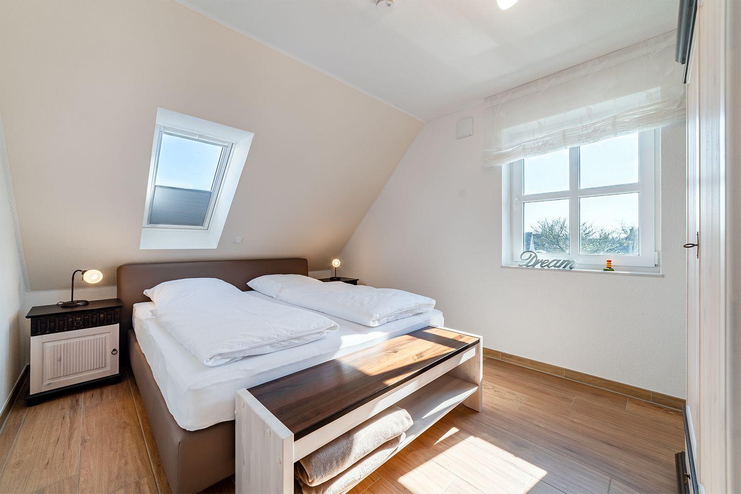 Das Schlafzimmer ist mit einem komfortablen Boxspringbett und einem zweiten TV ausgestattet