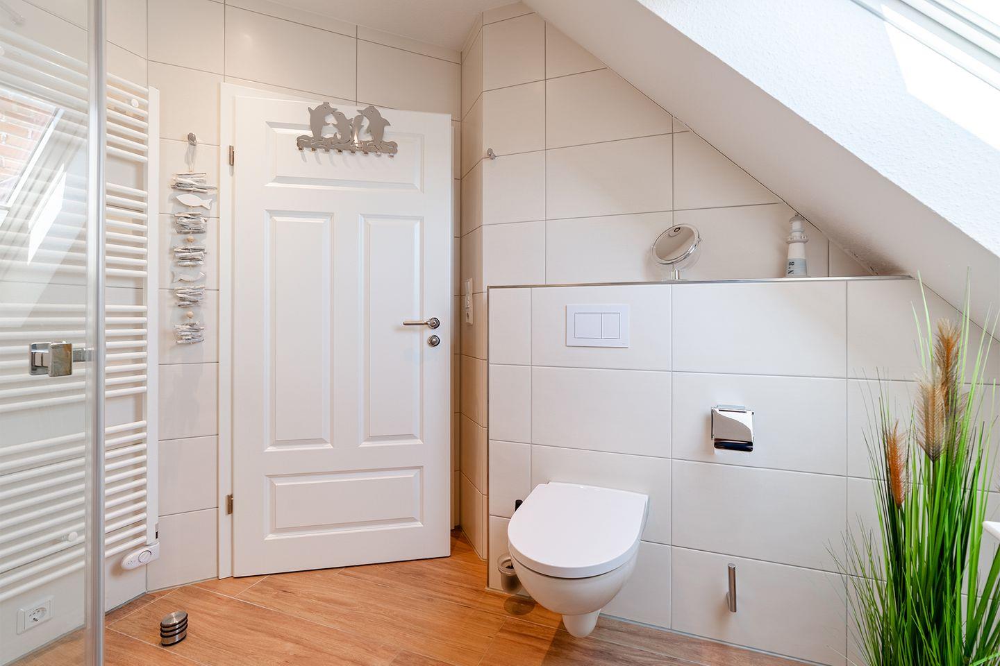 Das Bad bietet eine bodengleiche Dusche mit "Raindancer", WC, ein Fenster für ausreichend Tageslicht und ein festinstalliertes Radio