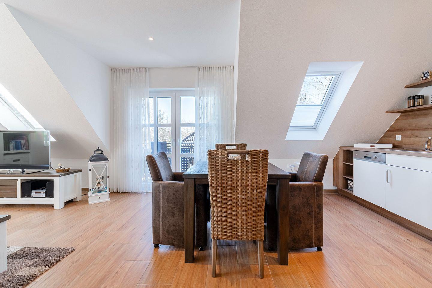 Großzügiger und heller Wohnraum mit integrierter Küche und einem schönen Essplatz