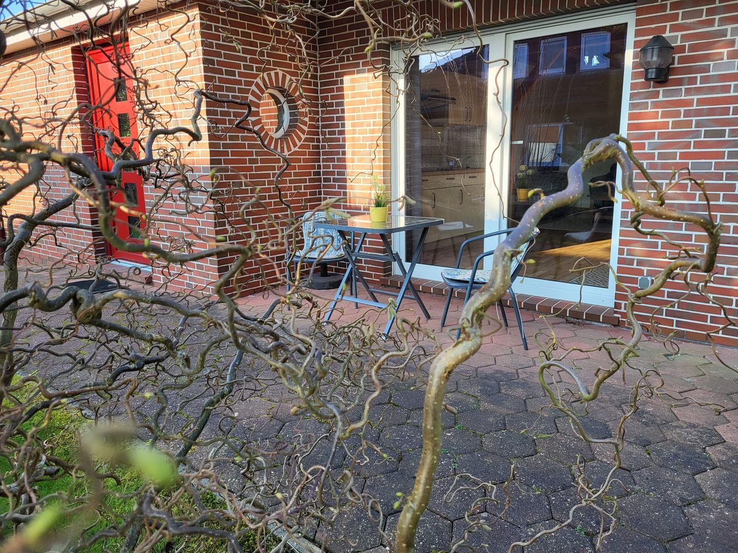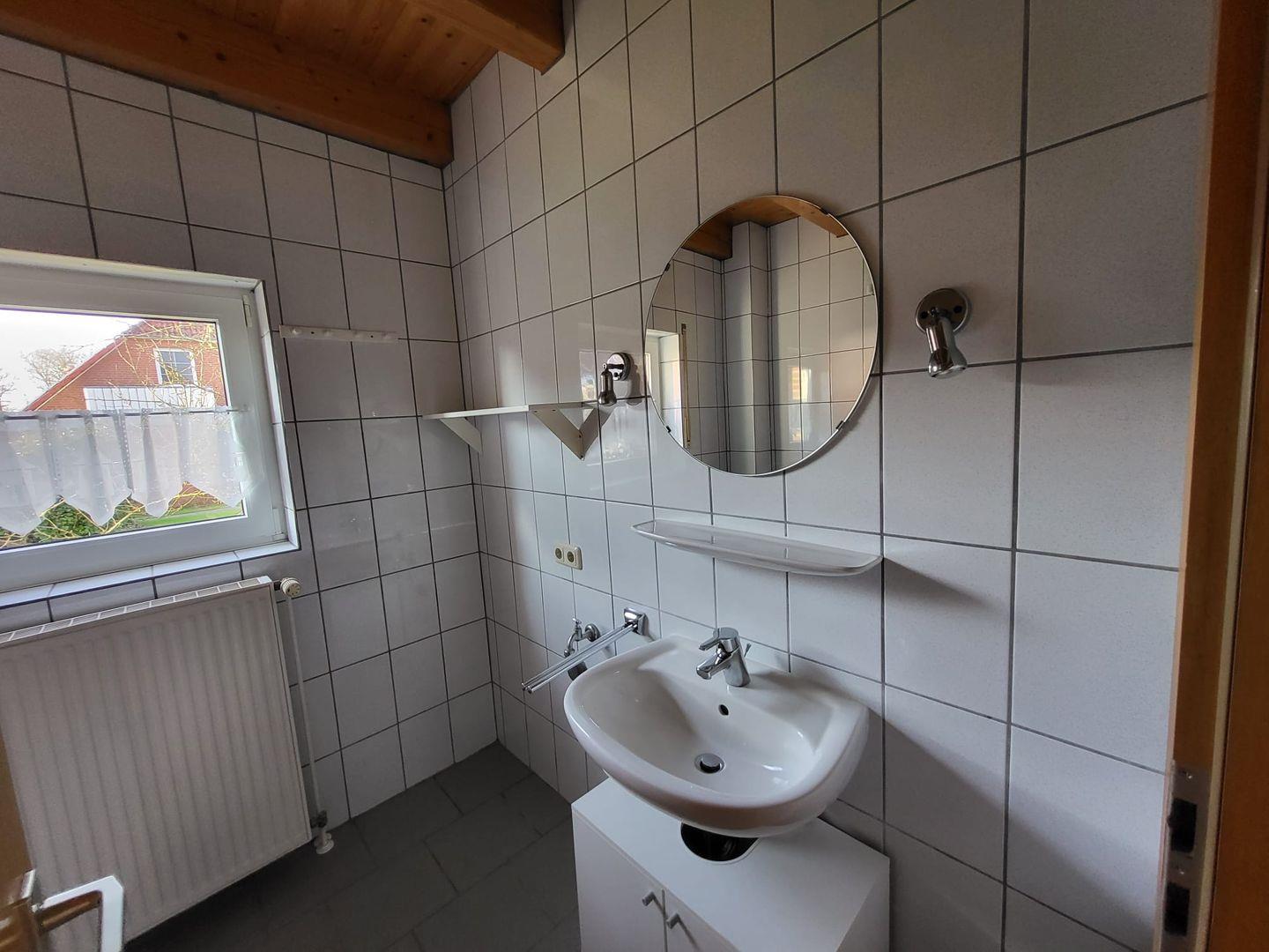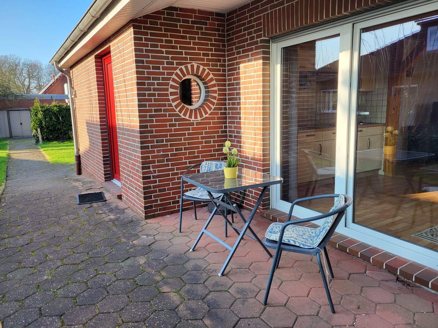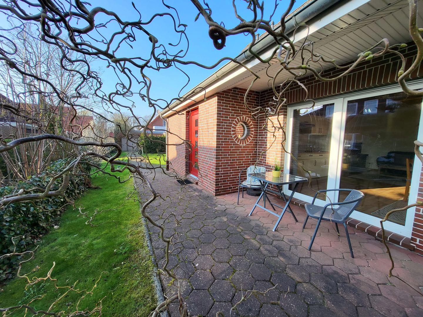 Vom Flur gelangen Sie in den Wohn-Essbereich mit Küche. Der großzügige Raum wirkt hell und freundlich. Die Balkenlage sorgt für Gemütlichkeit und Wärme. Genießen Sie auf dem Ledersofa und den 2 Sesseln gemütliche Abende, z. B. bei einem Fernsehabend mit einem Gläschen Wein. In der Küchenzeile steht alles bereit, um leckere Speisen zu kochen und dann am Esstisch mit der ganzen Familie oder mit Freunden zusammen zu essen. Klönen bei einer Tasse Ostfriesentee ist hier Pflicht. Vom Essbereich gelangen Sie auf die Terrasse, wo Sie die frische Nordseeluft und die Ruhe genießen können. Das Schlafzimmer im EG verfügt über ein Doppelbett und einen Kleiderschrank. Nebenan befindet sich das helle Duschbad. Ein kleiner Abstellraum rundet das Erdgeschoß ab. Die Treppe rauf finden Sie 2 weitere Schlafräume, eines mit Doppelbett und eines mit einem Einzelbett. Wenn Sie hier aus dem Fenster schauen, können Sie die Zwillingsmühlen entdecken. Auf dieser Etage finden Sie auch das zweite Duschbad. Alles Räume verfügen über Außenrollos. WLAN ist verfügbar! Ein Parkplatz gehört zum Haus. Das Ferienhaus Bella liegt sehr ruhig in einer Sackgasse. Es sind nur ca. 5 Gehminuten ins Zentrum.