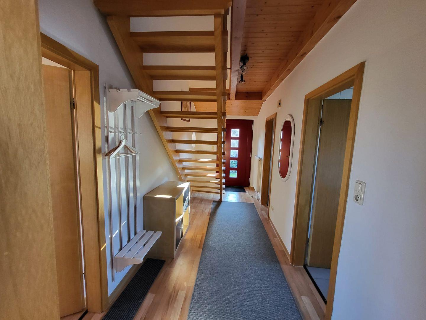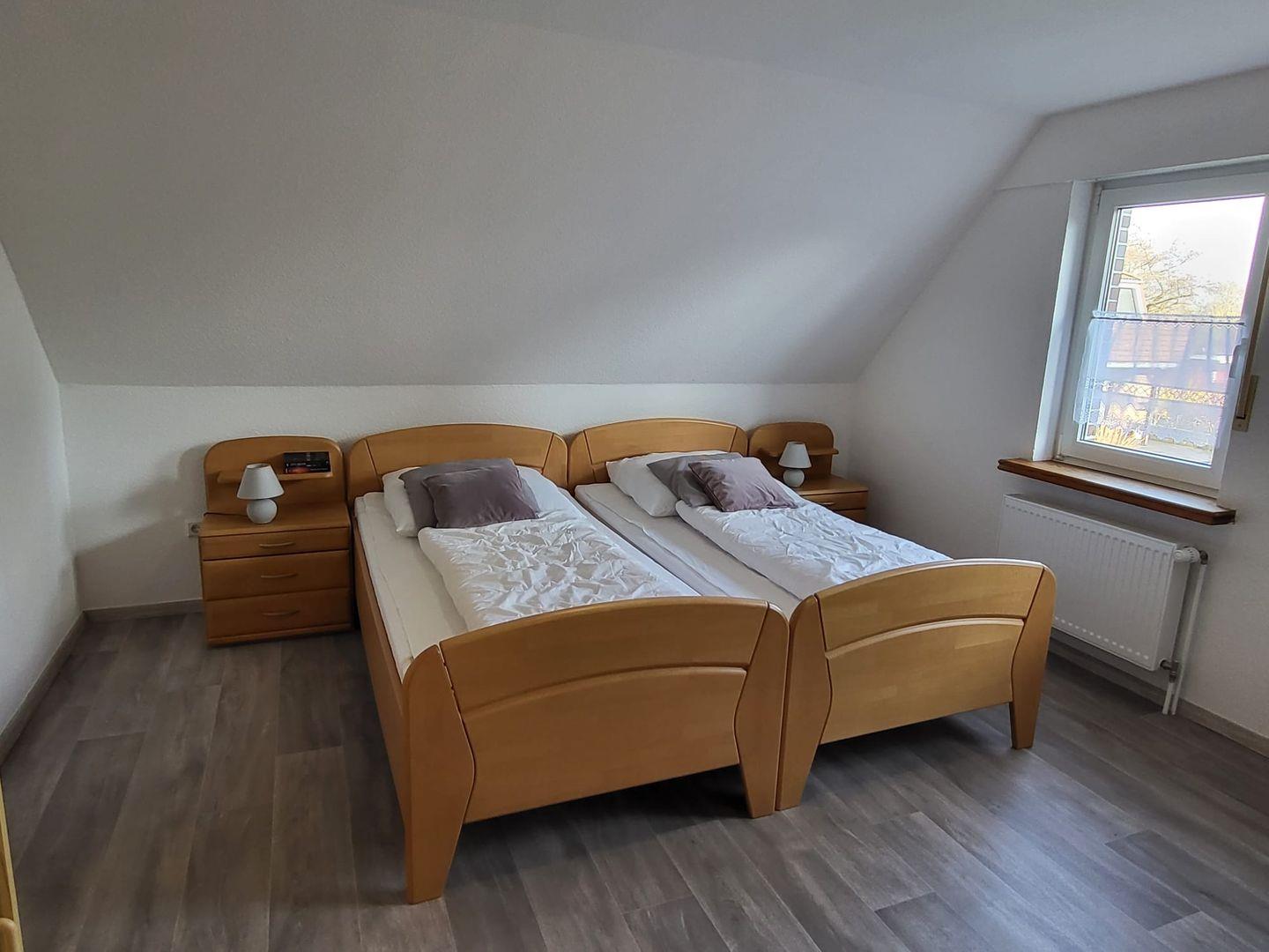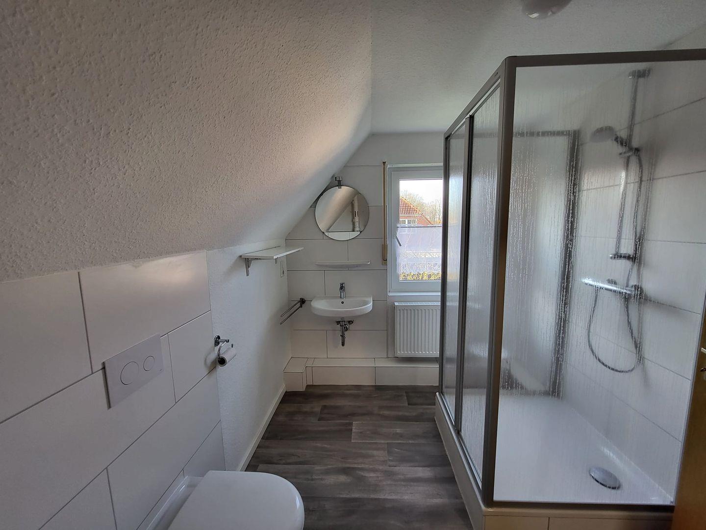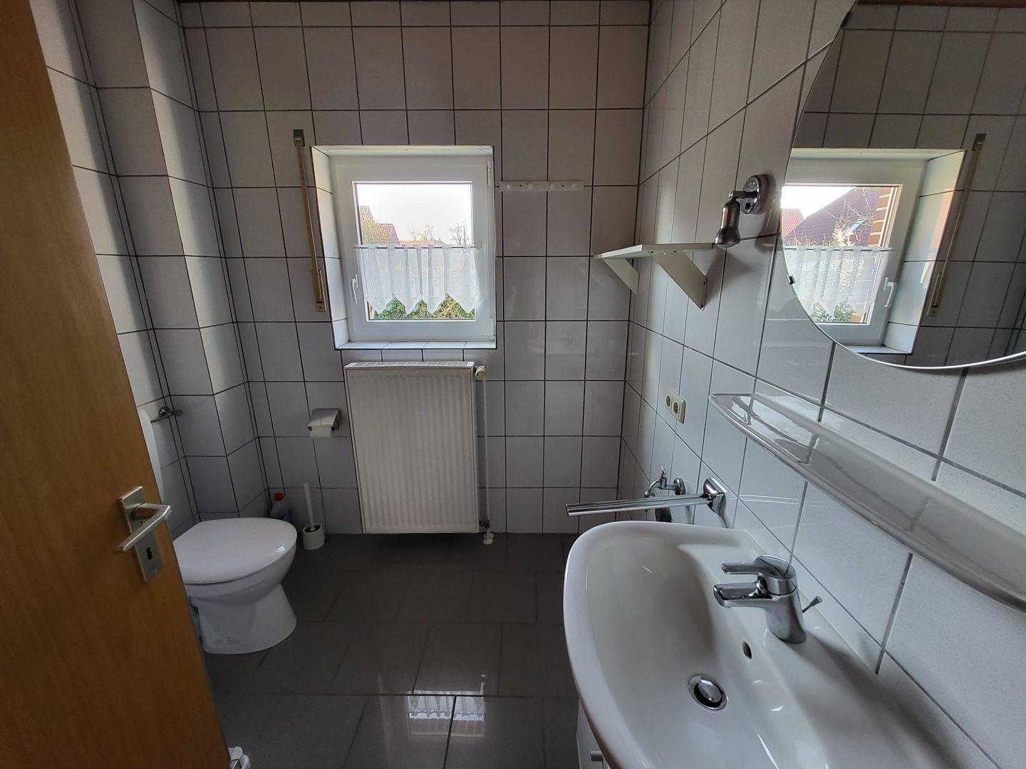 Vom Flur gelangen Sie in den Wohn-Essbereich mit Küche. Der großzügige Raum wirkt hell und freundlich. Die Balkenlage sorgt für Gemütlichkeit und Wärme. Genießen Sie auf dem Ledersofa und den 2 Sesseln gemütliche Abende, z. B. bei einem Fernsehabend mit einem Gläschen Wein. In der Küchenzeile steht alles bereit, um leckere Speisen zu kochen und dann am Esstisch mit der ganzen Familie oder mit Freunden zusammen zu essen. Klönen bei einer Tasse Ostfriesentee ist hier Pflicht. Vom Essbereich gelangen Sie auf die Terrasse, wo Sie die frische Nordseeluft und die Ruhe genießen können. Das Schlafzimmer im EG verfügt über ein Doppelbett und einen Kleiderschrank. Nebenan befindet sich das helle Duschbad. Ein kleiner Abstellraum rundet das Erdgeschoß ab. Die Treppe rauf finden Sie 2 weitere Schlafräume, eines mit Doppelbett und eines mit einem Einzelbett. Wenn Sie hier aus dem Fenster schauen, können Sie die Zwillingsmühlen entdecken. Auf dieser Etage finden Sie auch das zweite Duschbad. Alles Räume verfügen über Außenrollos. WLAN ist verfügbar! Ein Parkplatz gehört zum Haus. Das Ferienhaus Bella liegt sehr ruhig in einer Sackgasse. Es sind nur ca. 5 Gehminuten ins Zentrum.