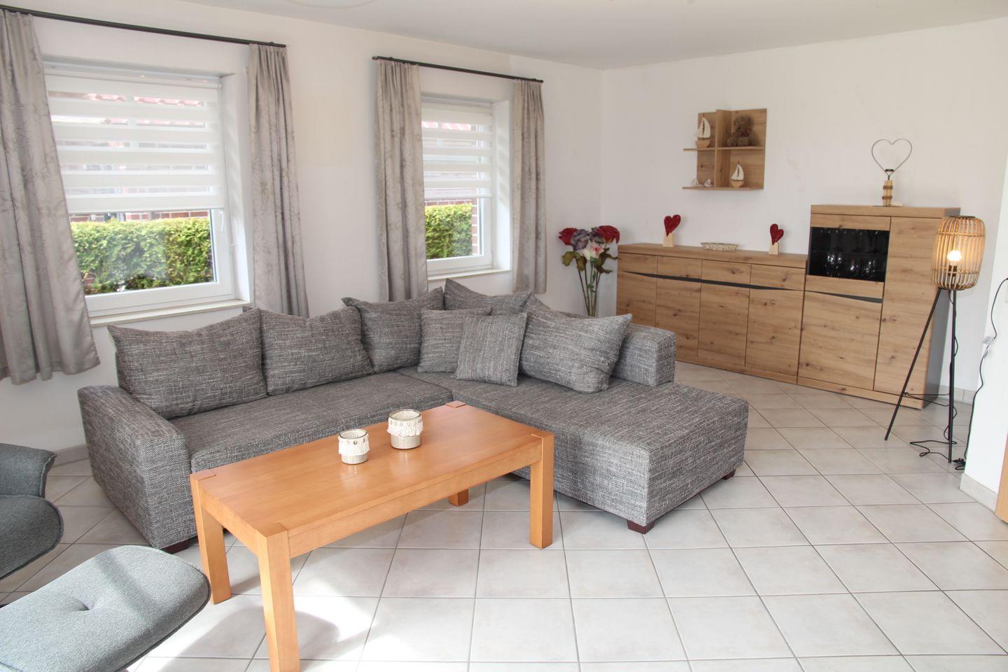 Das Wohnzimmer ist mit einem L-Sofa, einem Relax-Sessel, einem großen Samsung Smart-TV (55 Zoll/138 cm) und Stereo-Anlage ausgestattet. Gesellschaftsspiele und Bücher finden Sie in den Schränken / Boards.