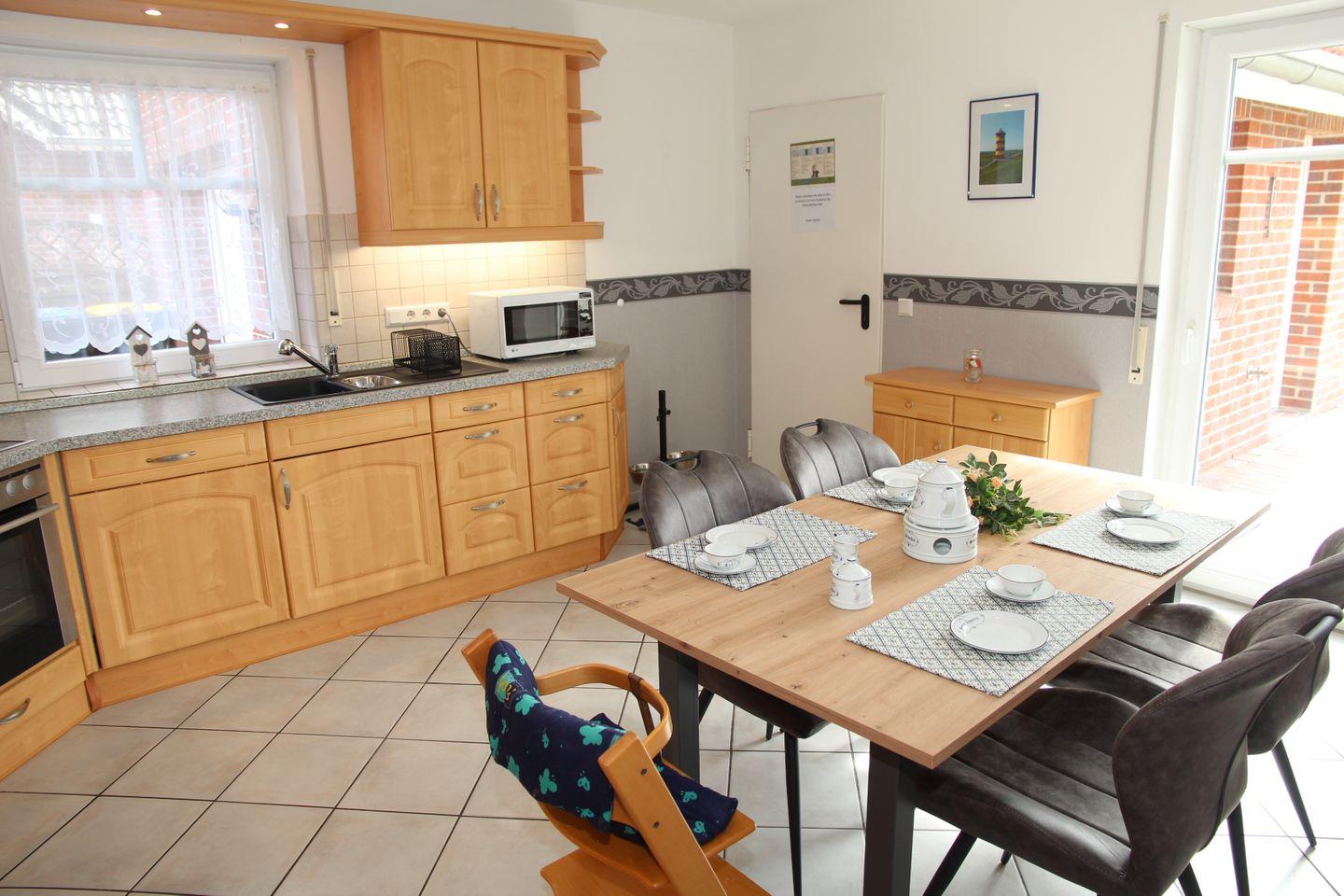 Die großzügig ausgestattete helle Einbauküche mit Kühlschrank, Backofen, Ceranfeld, Geschirrspüler, Kaffeemaschine, Mikrowelle, Eierkocher, Toaster, Wasserkocher und vielen weiteren Extras macht das Kochen im Urlaub zu einem Erlebnis. Ein ostfriesisches Teeservice lädt Sie zu einem gemütlichen ostfriesischen 'Koppke Tee' ein. Ein großer Esstisch mit vier Sitzplätzen bietet ausreichend Platz für gemütliches Beisammensein.