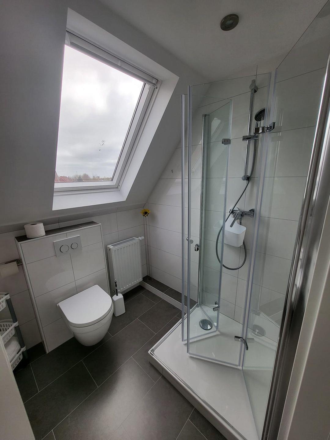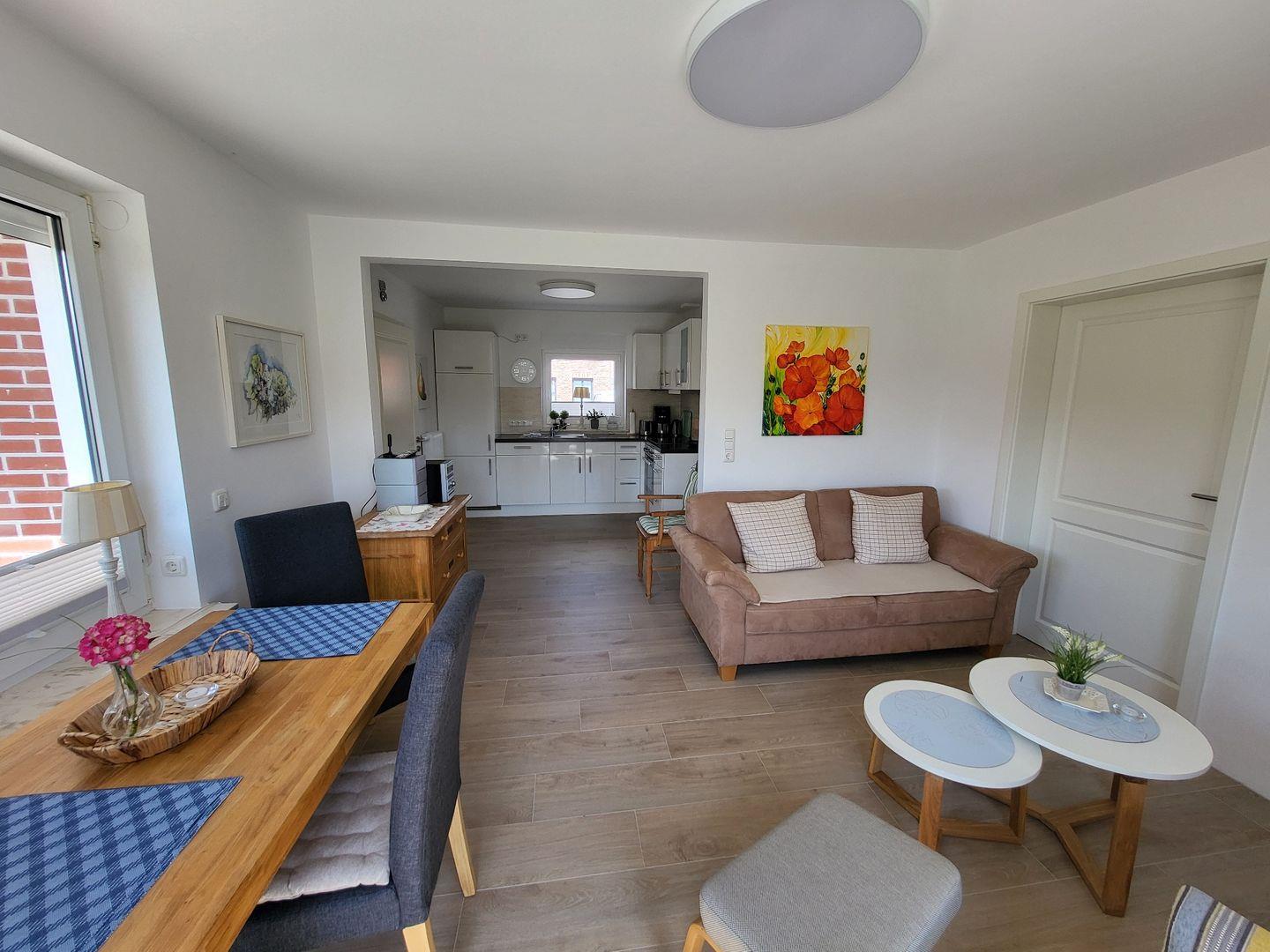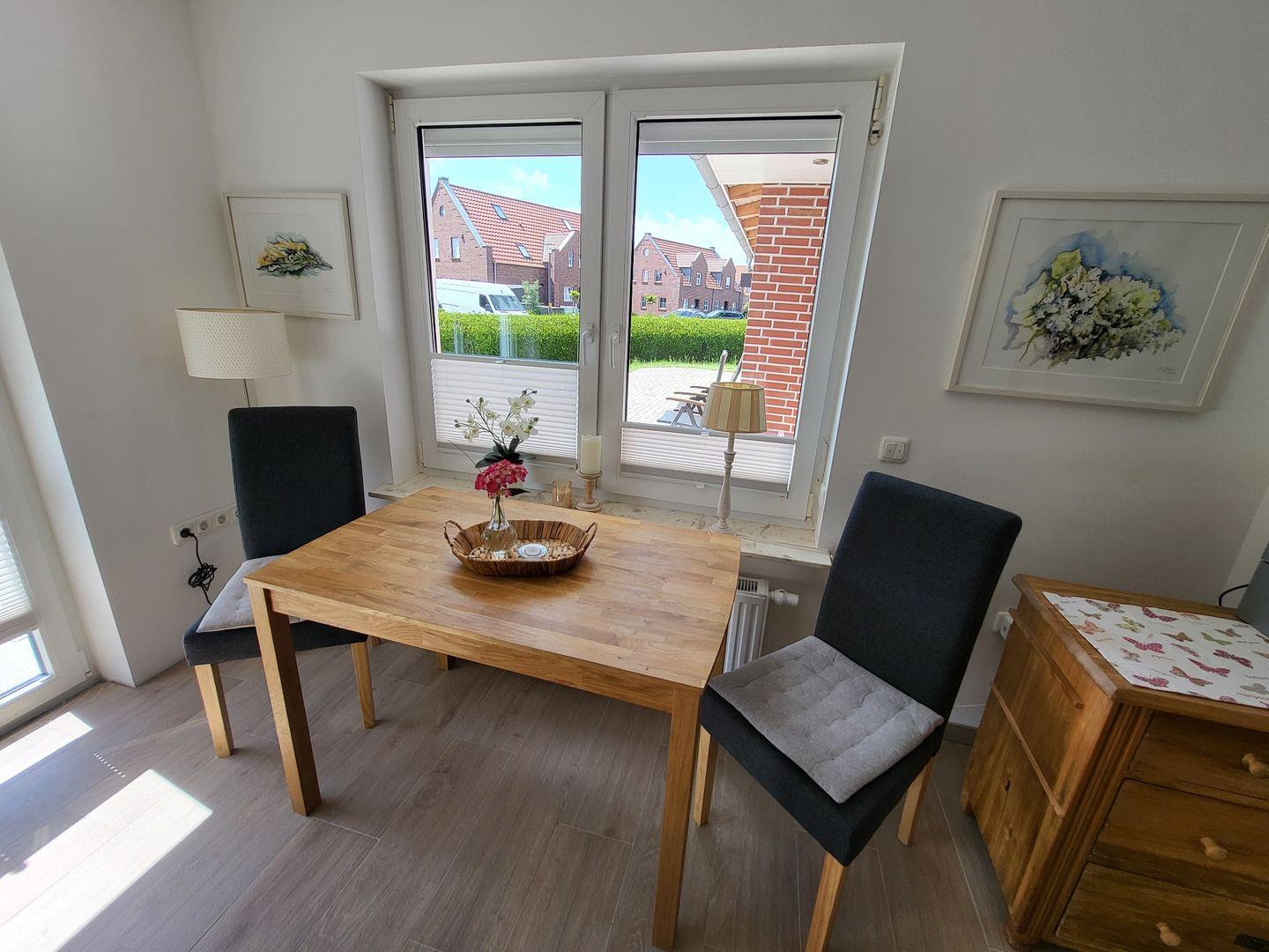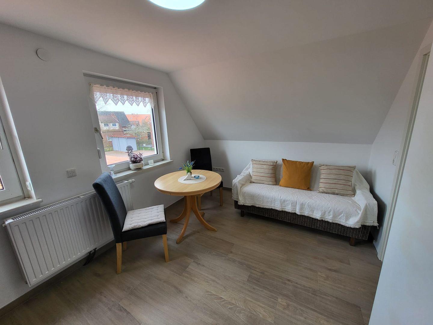Im Obergeschoss finden Sie das zweite gemütliche Schlafzimmer, ein modernes Duschbad und eine Wohnküche mit neuer Küchenzeile, Sitzgruppe und einem ausklappbarem Sofa. Hier kann man sich wunderbar zurückziehen, einen Kaffee auf dem Sofa trinken und die Aussicht auf den Pilsumer Weg genießen.