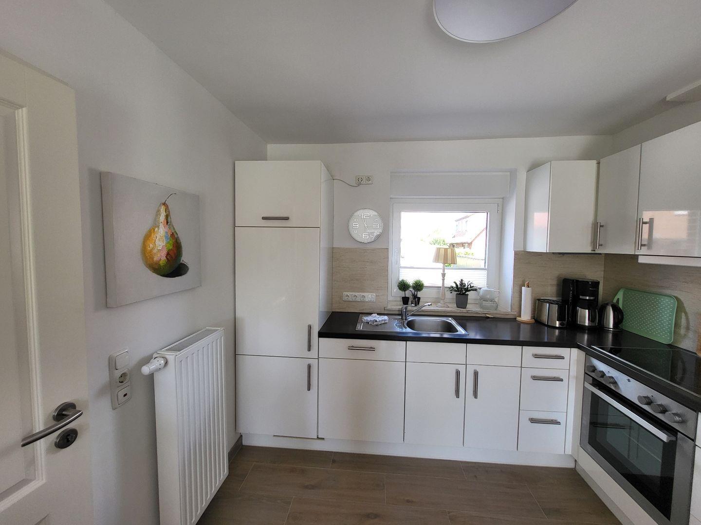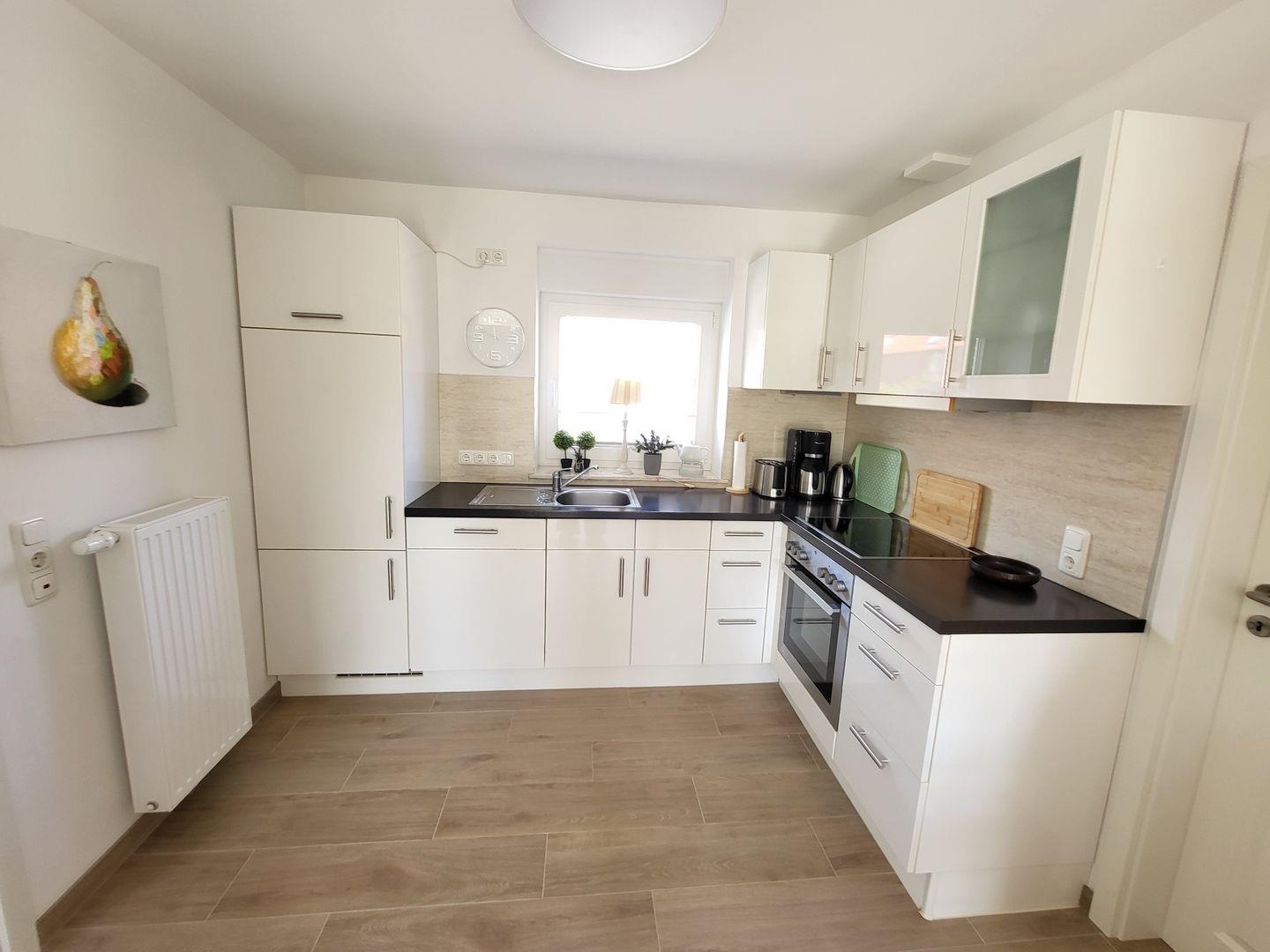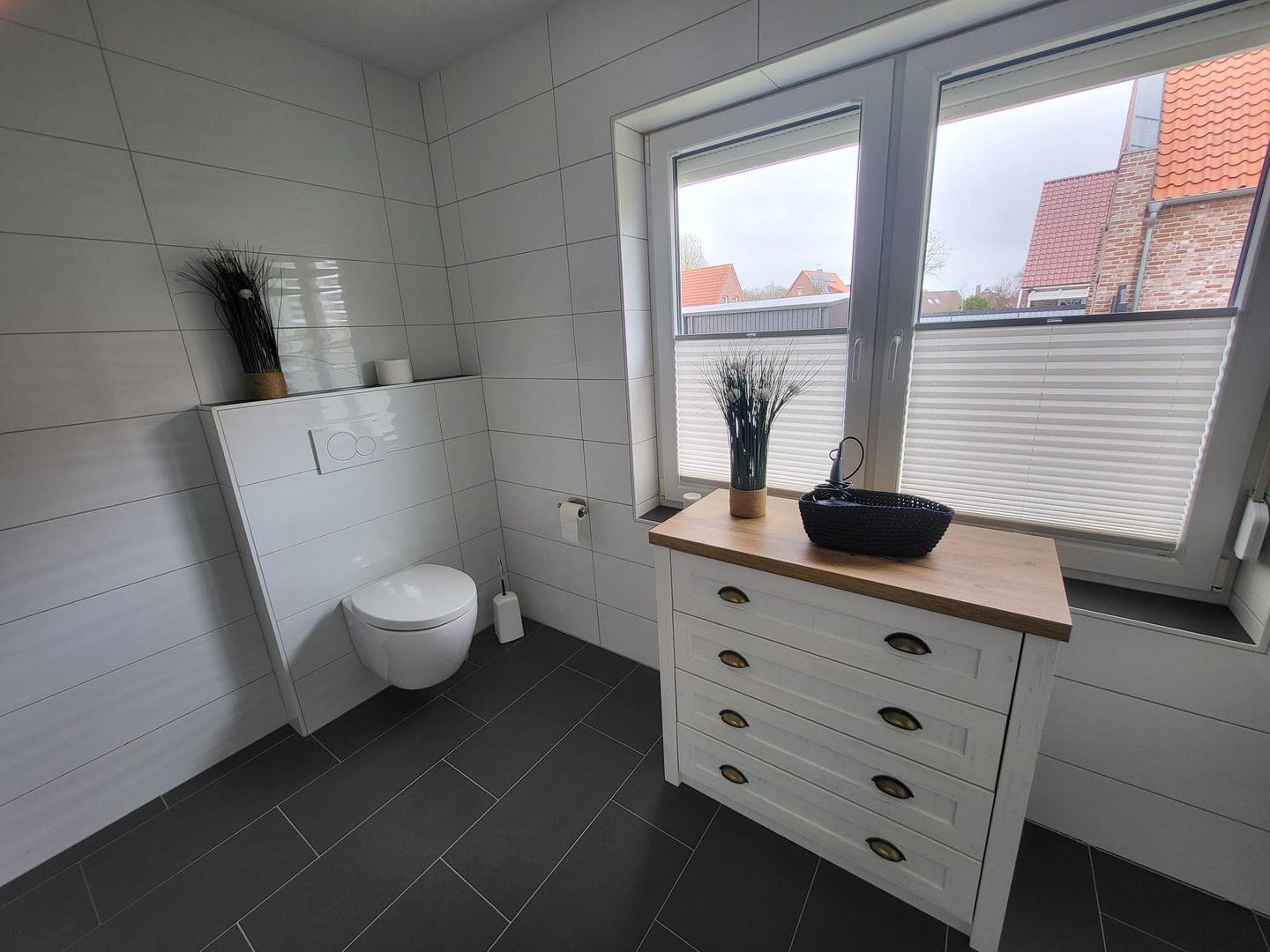 Im Obergeschoss finden Sie das zweite gemütliche Schlafzimmer, ein modernes Duschbad und eine Wohnküche mit neuer Küchenzeile, Sitzgruppe und einem ausklappbarem Sofa. Hier kann man sich wunderbar zurückziehen, einen Kaffee auf dem Sofa trinken und die Aussicht auf den Pilsumer Weg genießen.