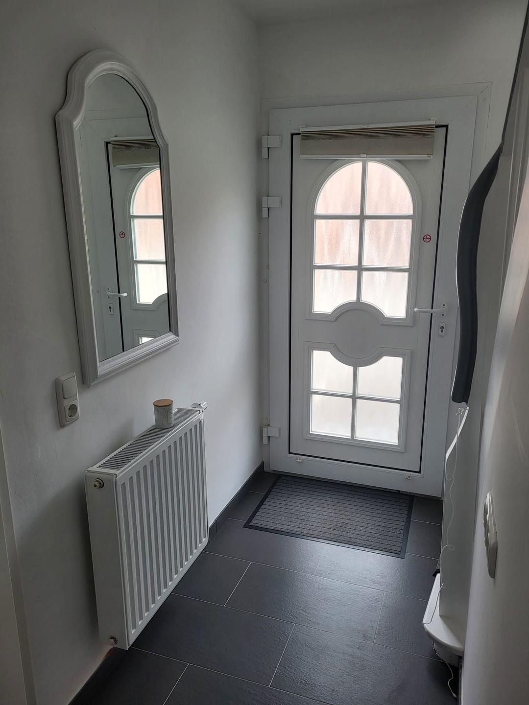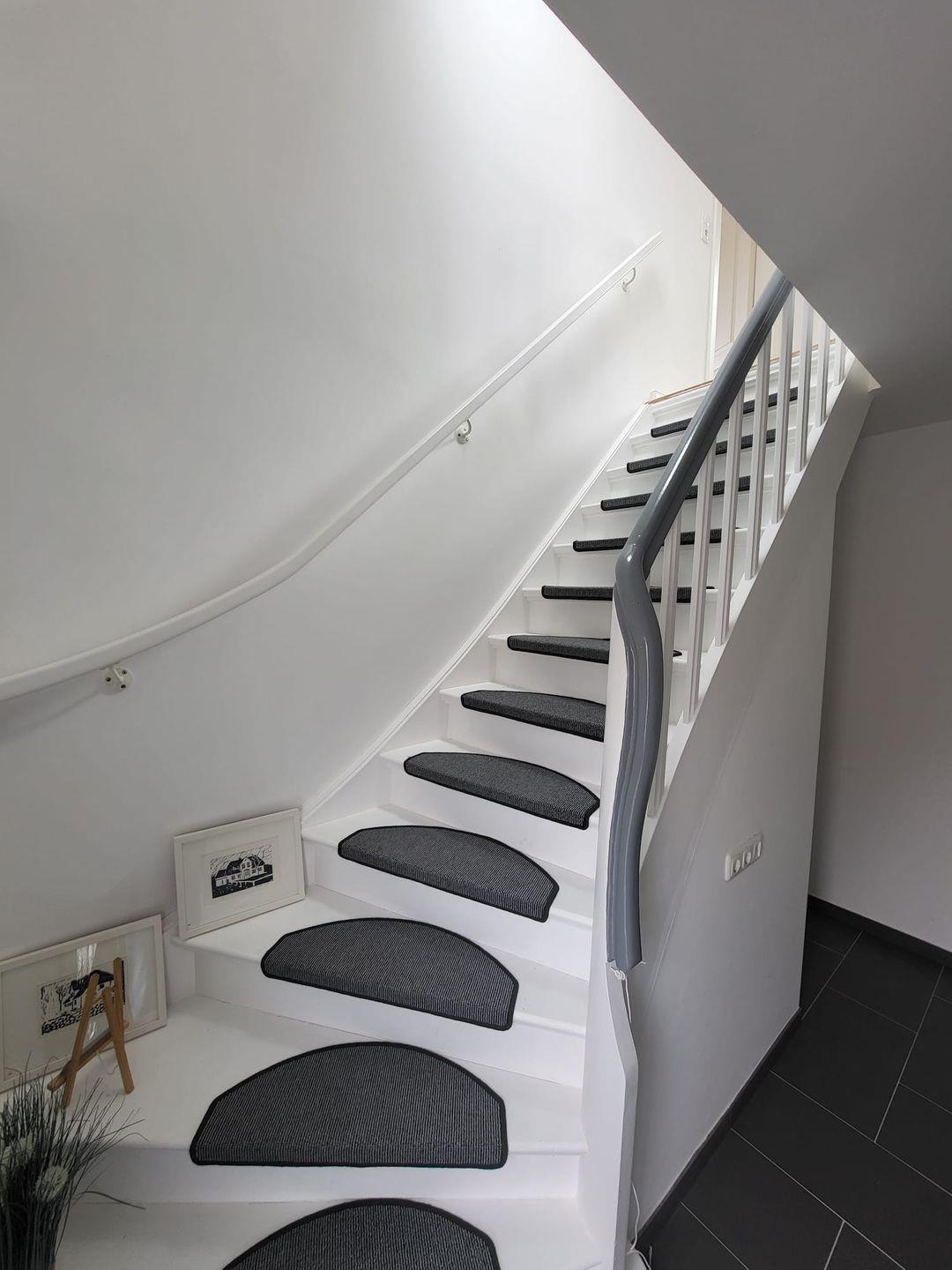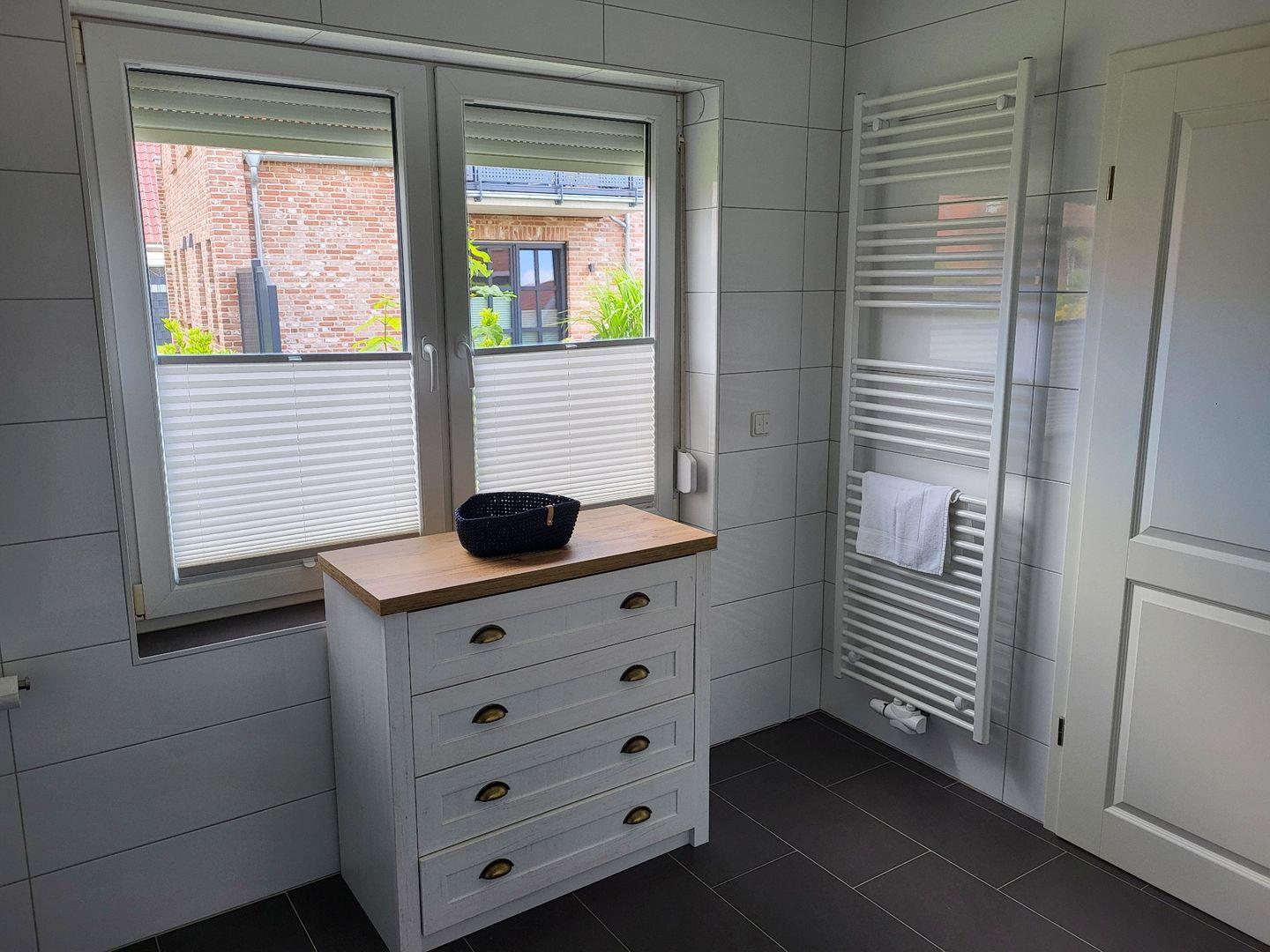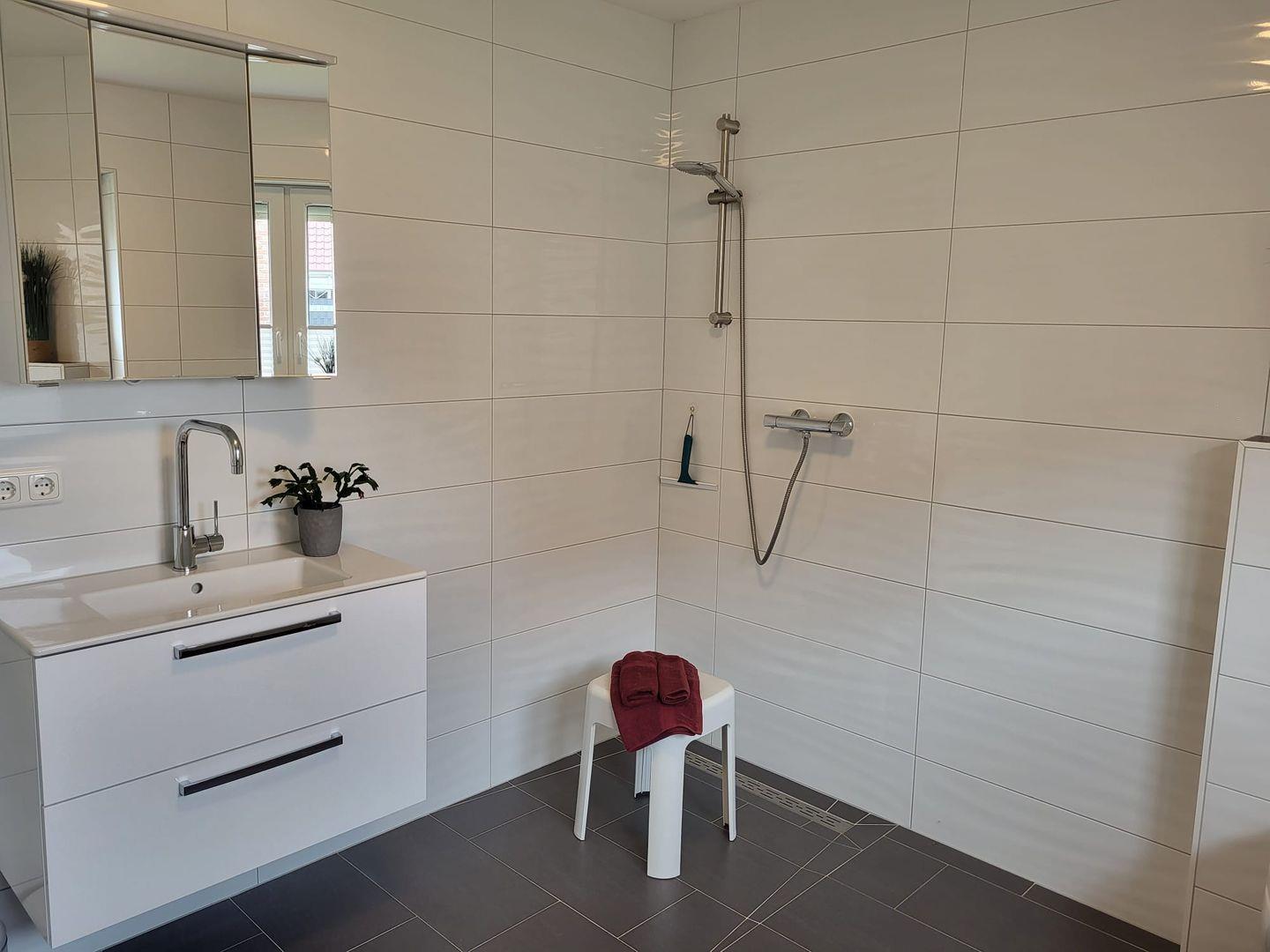 Im Obergeschoss finden Sie das zweite gemütliche Schlafzimmer, ein modernes Duschbad und eine Wohnküche mit neuer Küchenzeile, Sitzgruppe und einem ausklappbarem Sofa. Hier kann man sich wunderbar zurückziehen, einen Kaffee auf dem Sofa trinken und die Aussicht auf den Pilsumer Weg genießen.