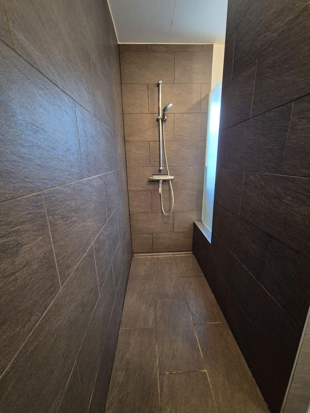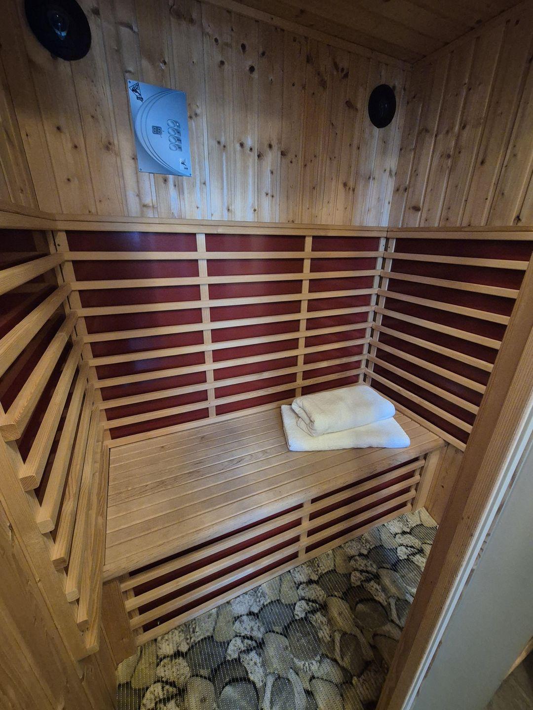 Zwei moderne Badezimmer – eines mit bodengleicher Duschen, Waschbecken, Fenster und Spiegel – bieten ausreichend Raum und Privatsphäre. Für ein zusätzliches Wellness-Highlight sorgt die eigene Infrarotkabine.
