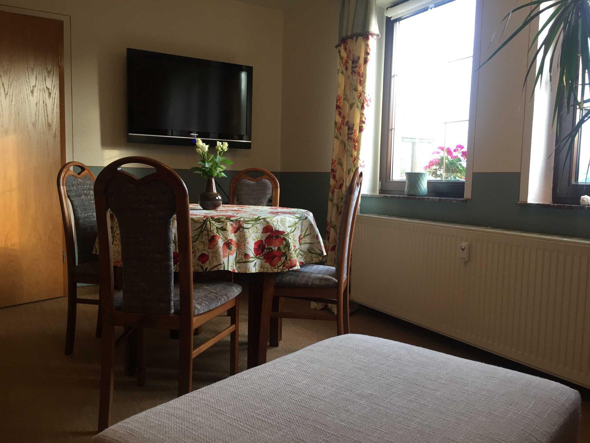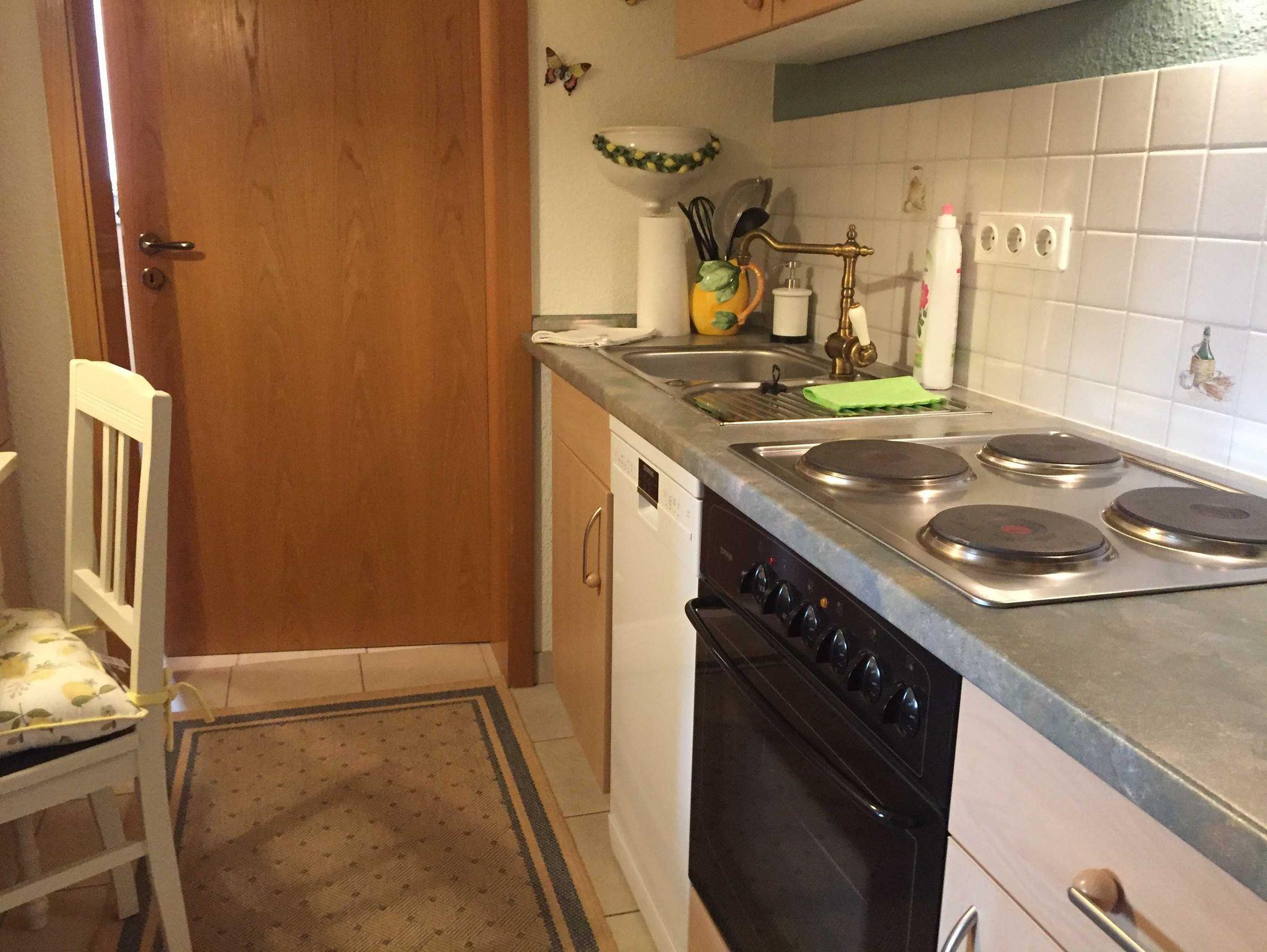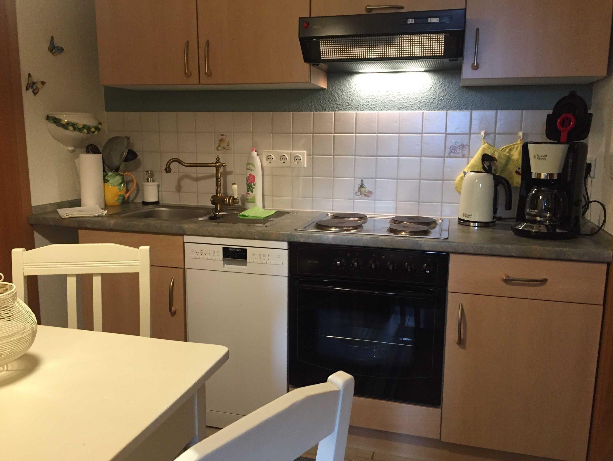 • Die Ferienwohnung besteht aus einem Schlafzimmer, einem Wohnzimmer, einer kleinen Küche und einem Bad mit Dusche und WC. Das Schlafzimmer hat ein großes Doppelbett mit zwei Nachttischchen und einem dreitürigen Kleiderschrank sowie einer Kommode. Das Wohnzimmer ist ausgestattet mit einem Schlafsofa, einer Anrichte, einer Vitrine und einem runden Eßtisch aus schlichtem Stilholzmöbeln sowe einem großer Flachbildschirm. In der Küchenzeile ist ein Elektroherd mit Backröhre, ein Geschirrspühler und ein Kühlschrank integriert. Ein Wasserkocher, Kaffeemaschine und ein Toaster sind vorhanden. Ein kleiner Tisch mit zwei Stühlen findet ebenfalls dort Platz. Im Badezimmer mit Dusche, Waschbecken und WC ist ein Haarföhn, ein Kosmetikspiegel und ein Abfalleimer vorhanden. Handtücher, Geschirrtücher und Handseife liegen für Sie bereit.