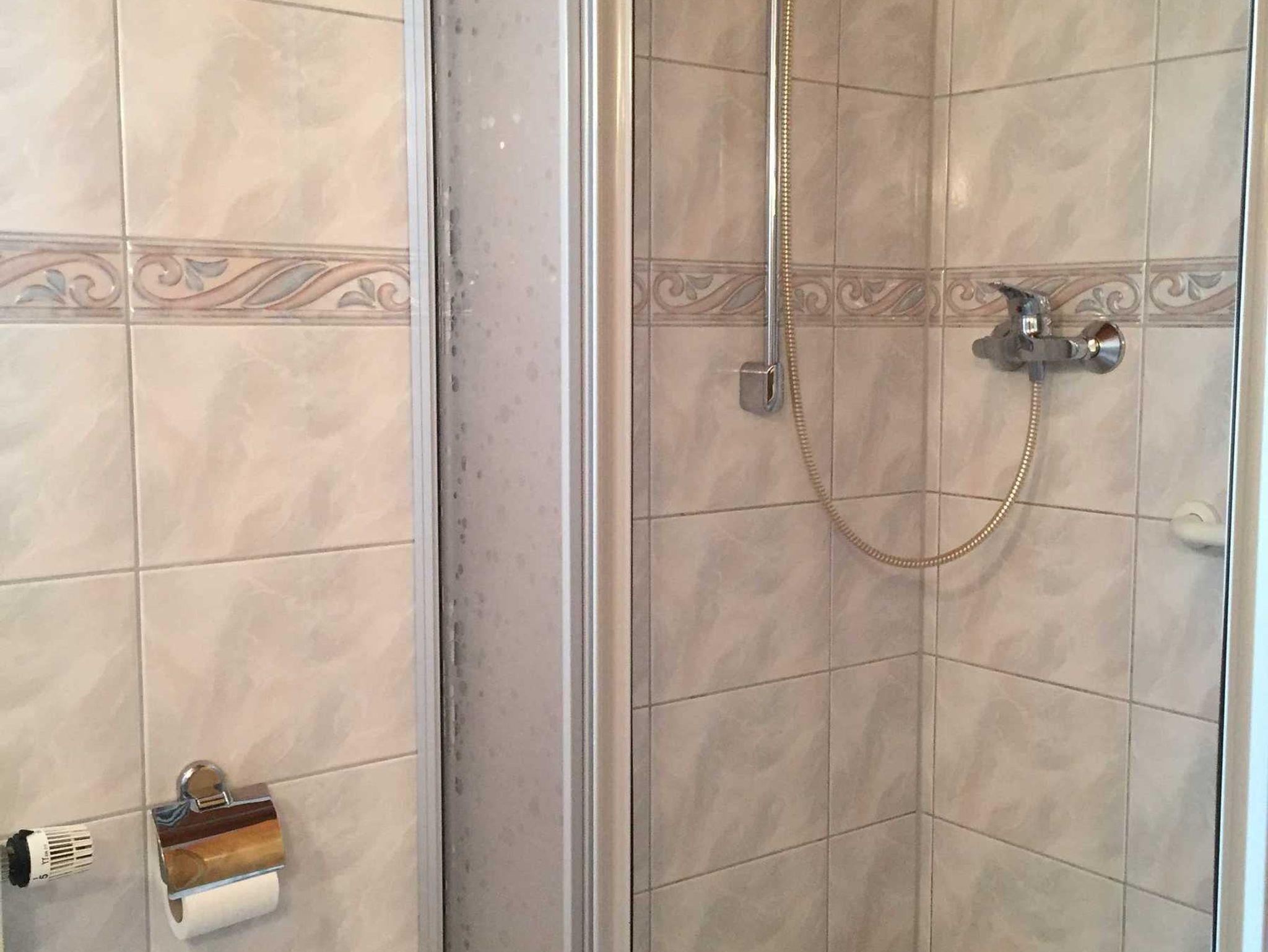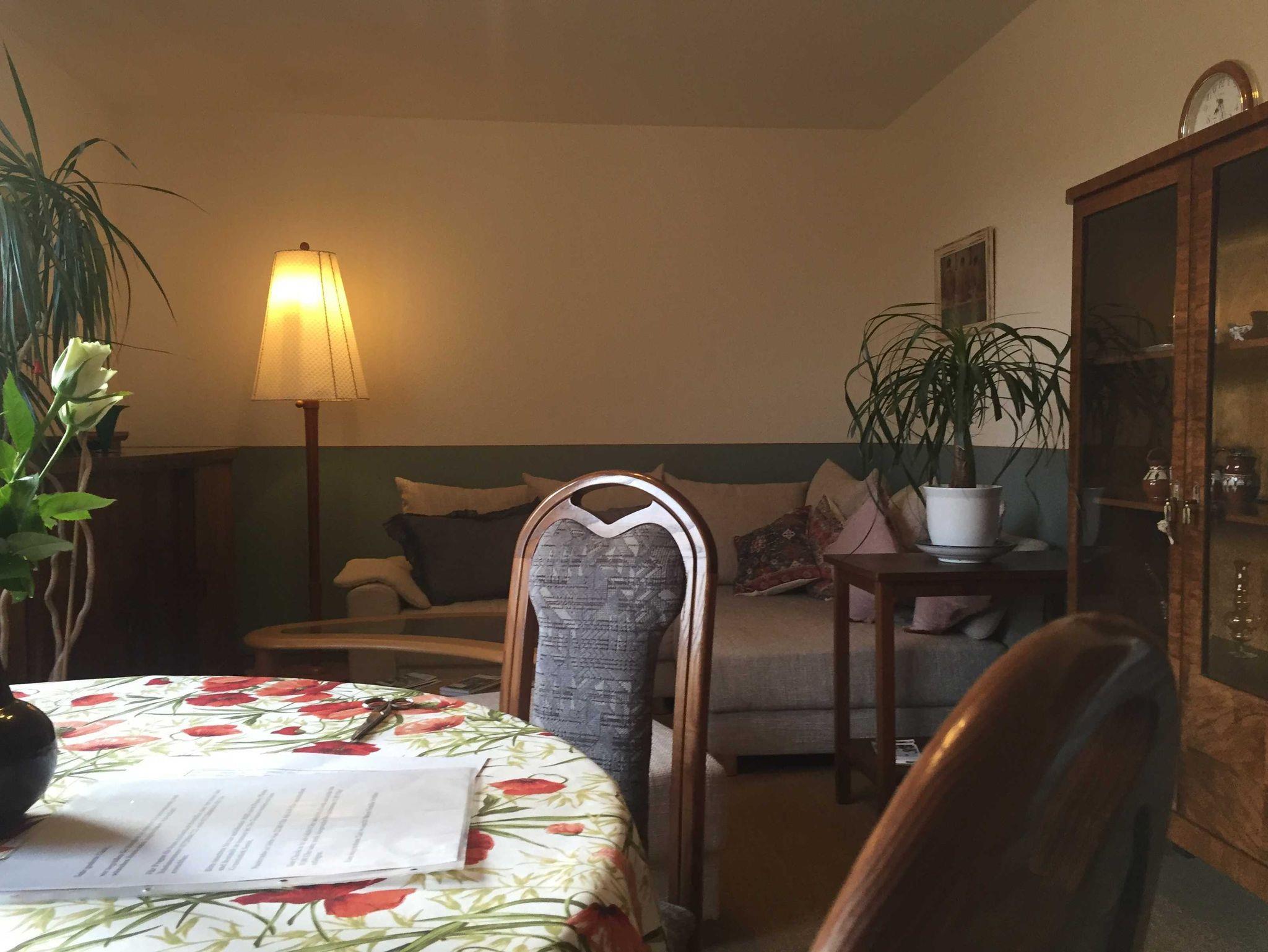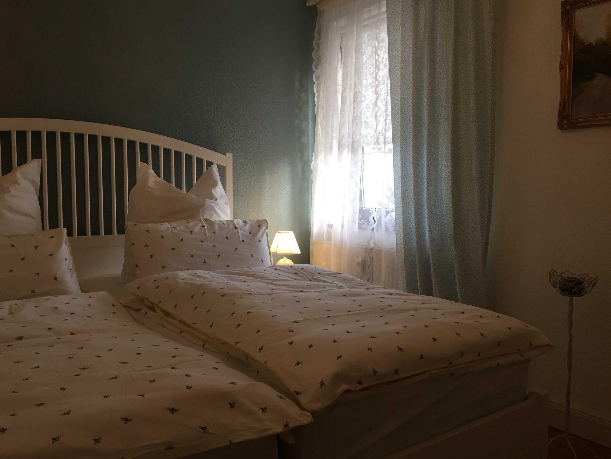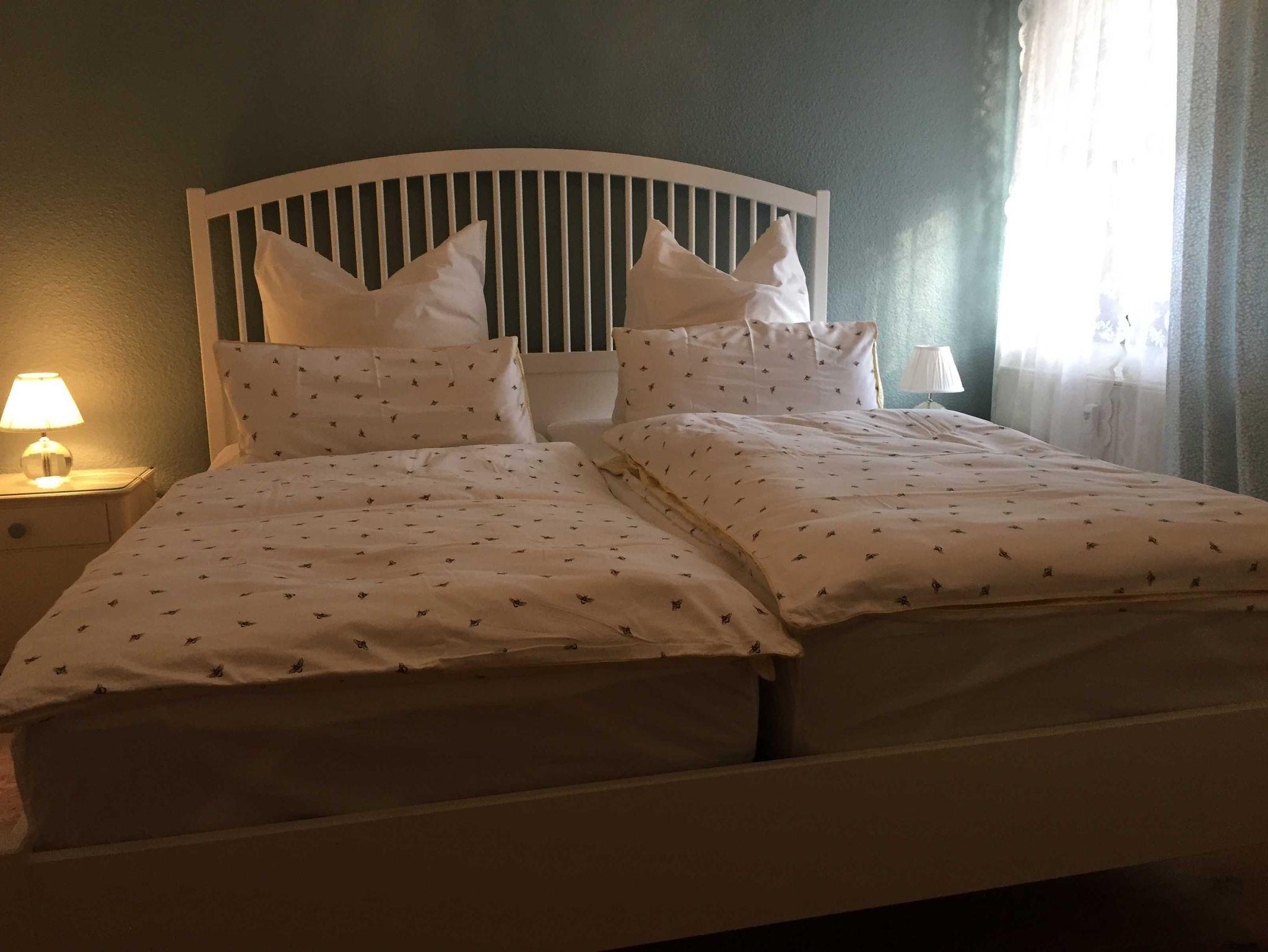 • Die Ferienwohnung besteht aus einem Schlafzimmer, einem Wohnzimmer, einer kleinen Küche und einem Bad mit Dusche und WC. Das Schlafzimmer hat ein großes Doppelbett mit zwei Nachttischchen und einem dreitürigen Kleiderschrank sowie einer Kommode. Das Wohnzimmer ist ausgestattet mit einem Schlafsofa, einer Anrichte, einer Vitrine und einem runden Eßtisch aus schlichtem Stilholzmöbeln sowe einem großer Flachbildschirm. In der Küchenzeile ist ein Elektroherd mit Backröhre, ein Geschirrspühler und ein Kühlschrank integriert. Ein Wasserkocher, Kaffeemaschine und ein Toaster sind vorhanden. Ein kleiner Tisch mit zwei Stühlen findet ebenfalls dort Platz. Im Badezimmer mit Dusche, Waschbecken und WC ist ein Haarföhn, ein Kosmetikspiegel und ein Abfalleimer vorhanden. Handtücher, Geschirrtücher und Handseife liegen für Sie bereit.