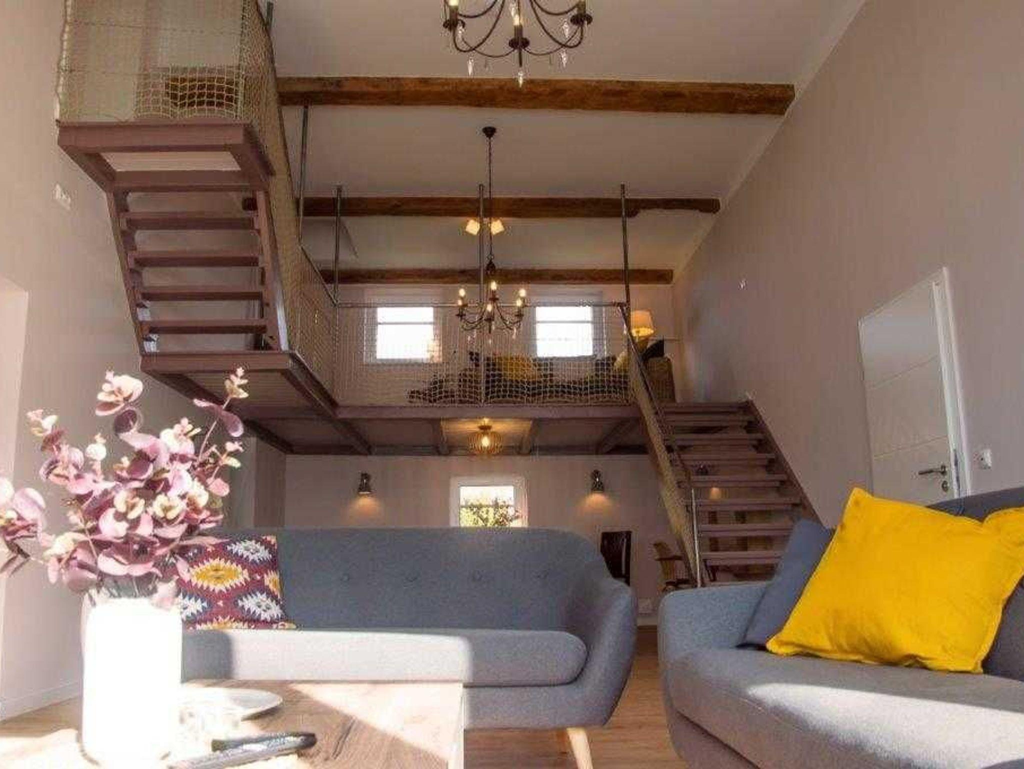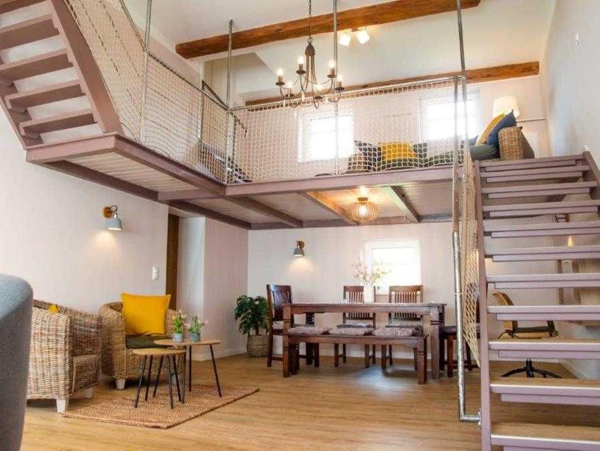 Die Wohnung wurde in einem alten landwirtschaftlichen Gebäude errichtet. Hierbei wurden die ursprünglichen Wohnräume für Landarbeiter und die Scheunendurchfahrt für die Heuernte vergangener Tage vereint und so eine Wohnung in mehreren Ebenen und einem zentralem Wohnzimmer mit einer Deckenhöhe von 4 Metern geschaffen.