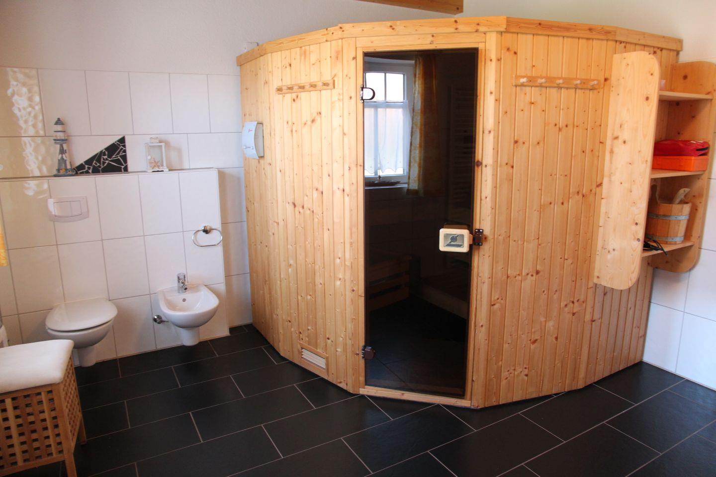 Im direkt angrenzenden Abstellraum sind Waschmaschine und Trockner untergebracht. Im EG-Bad findet sich neben der Dusche und dem WC ein Bidet und auch die Sauna.