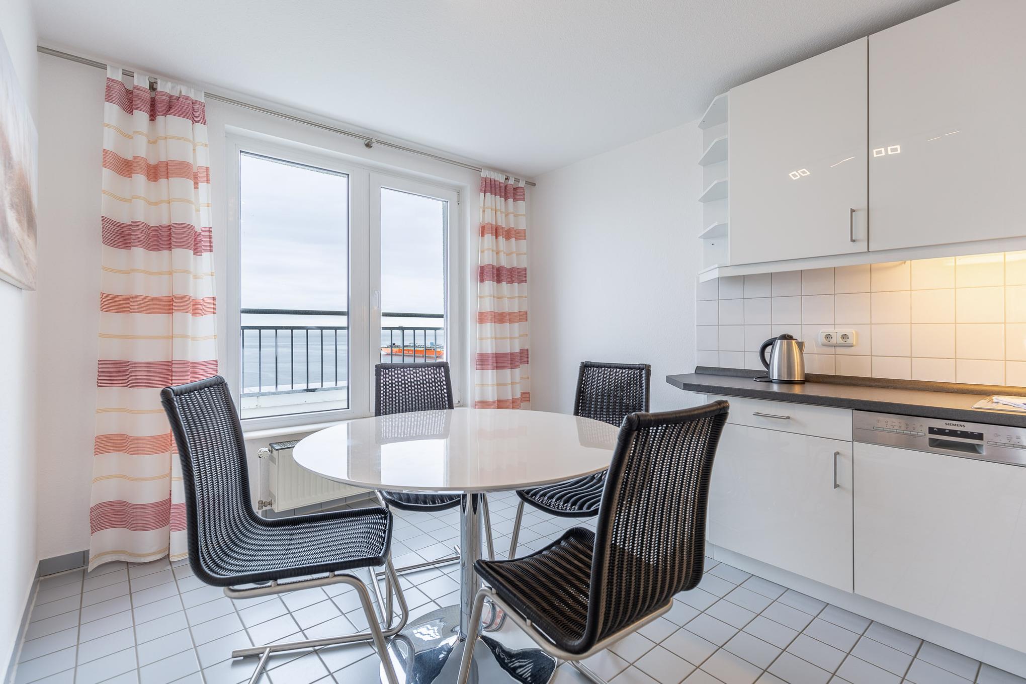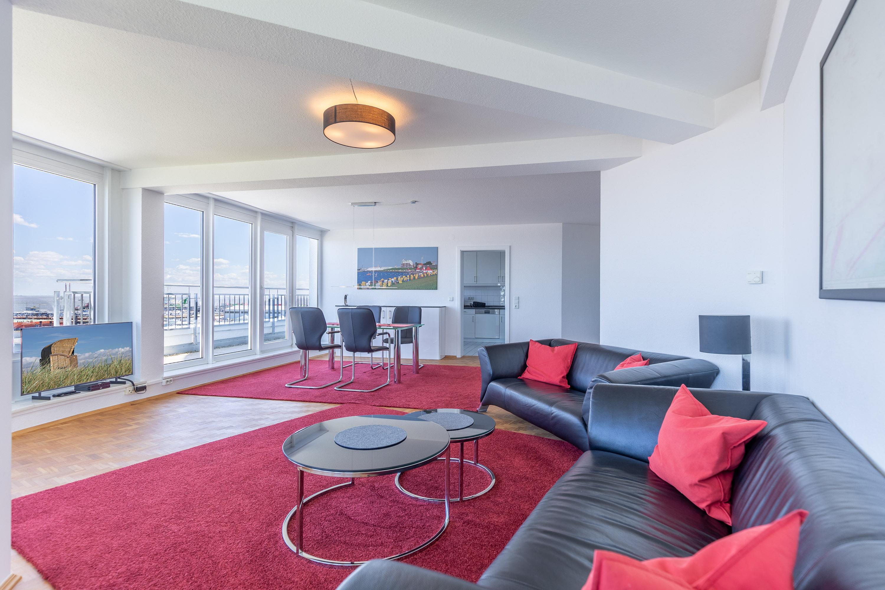 Der großzügige und lichtdurchflutete Wohnbereich besticht durch eine moderne und hochwertige Luxus-Ausstattung. Genießen Sie den Blick auf den Weltschifffahrtsweg, die Kugelbake und den Fährhafen. Der Ausblick bietet Erholung und Erlebnis zugleich. Auf 120 m² bietet Ihnen die 2-Zimmer-Ferienwohnung zwei separate Schlafzimmer. Ein Schlafzimmer mit Doppelbett in Komfortliegehöhe und weiteres Schlafzimmer mit zwei Einzelbetten. Die komfortablen Betten sorgen für einen erholsamen Schlaf. Neben dem Wohnbereich verfügt auch jedes Schlafzimmer über einen Fernseher. Auch von der separaten Küche mit Backofen, Geschirrspüler, Mikrowelle sowie Kühlschrank mit Gefrierfach genießen Sie den atemberaubenden Meerblick. Des Weiteren gehören zwei moderne Bäder mit Dusche und WC zum Standard dieser einzigartigen Ferienwohnung.