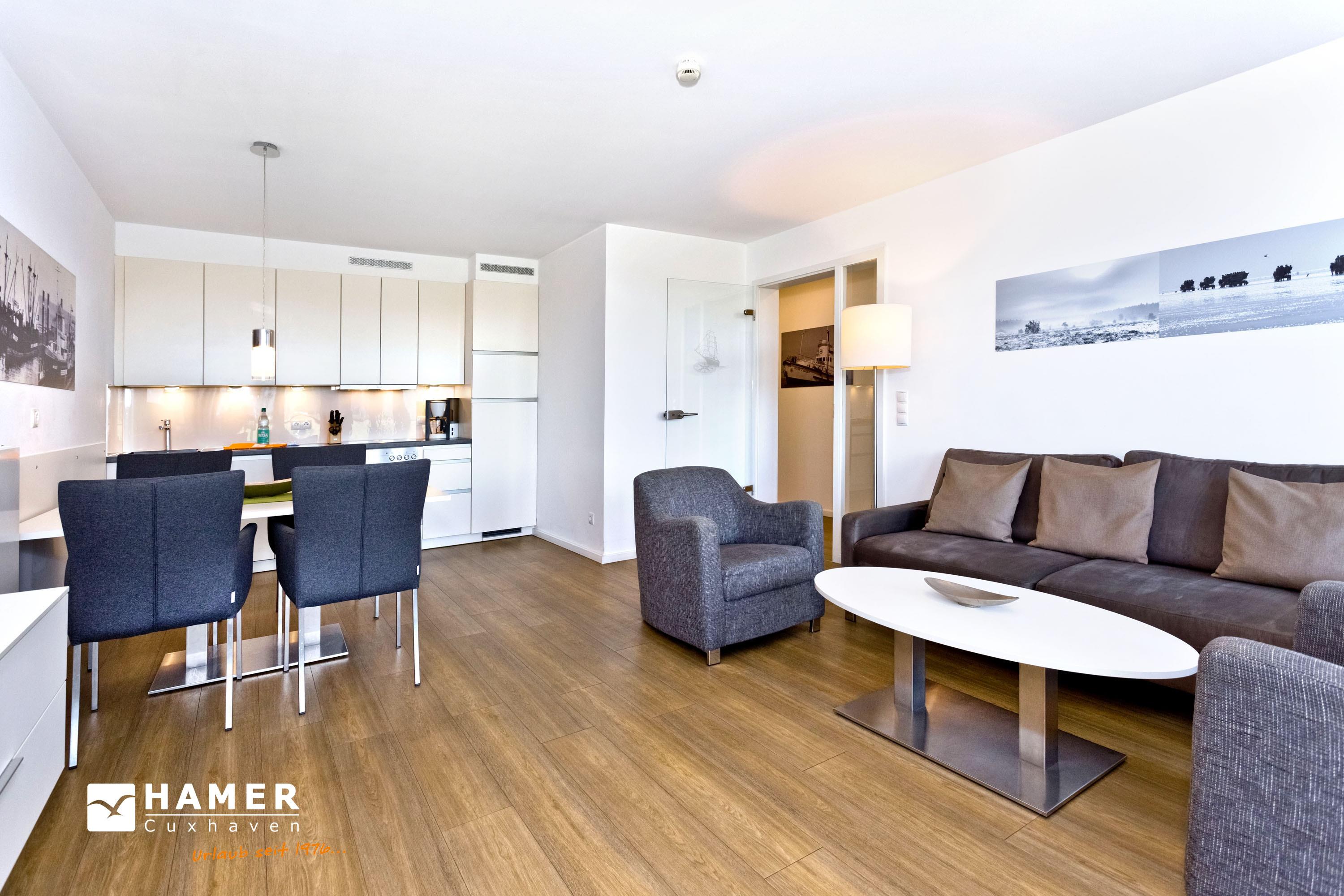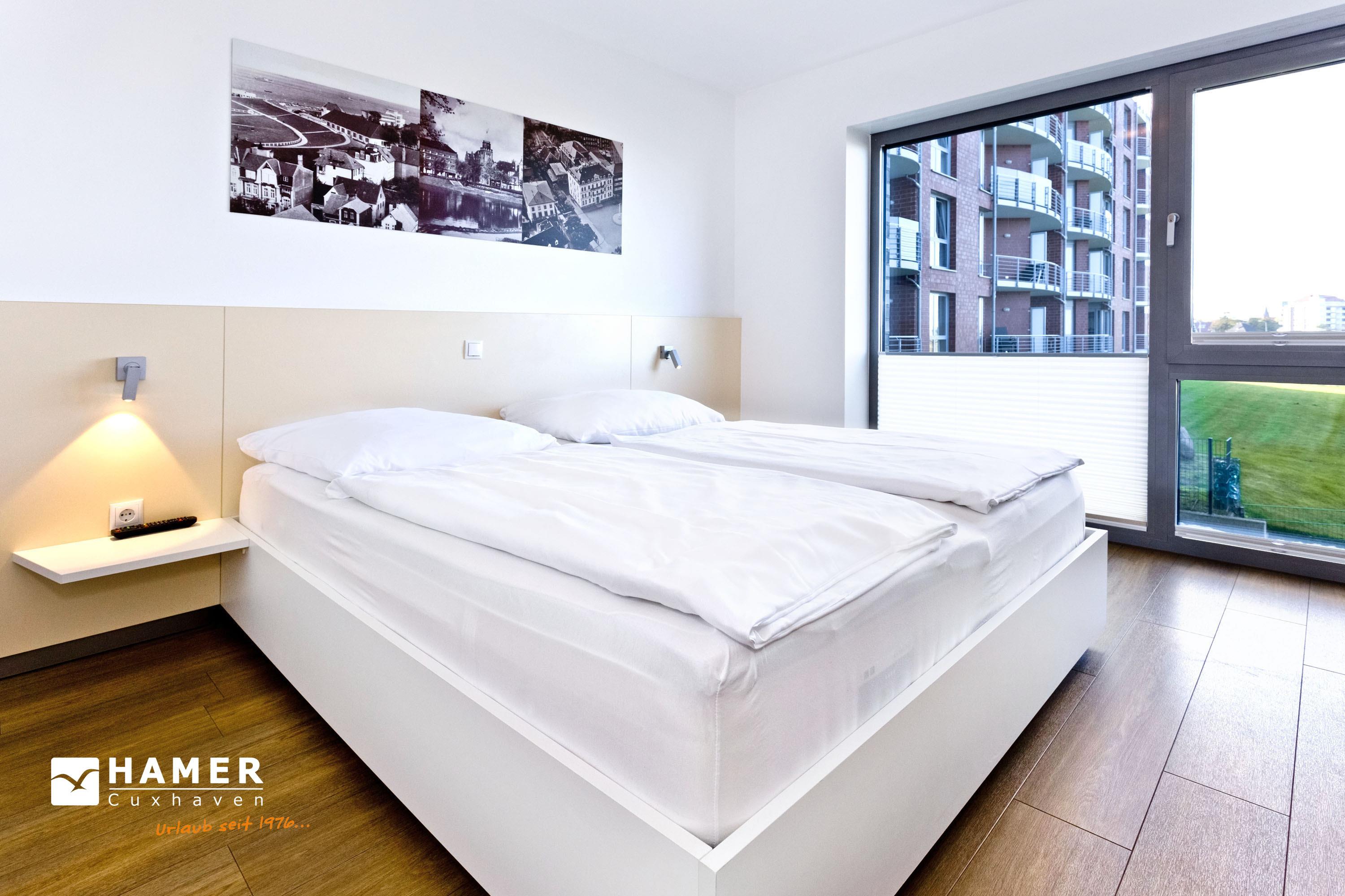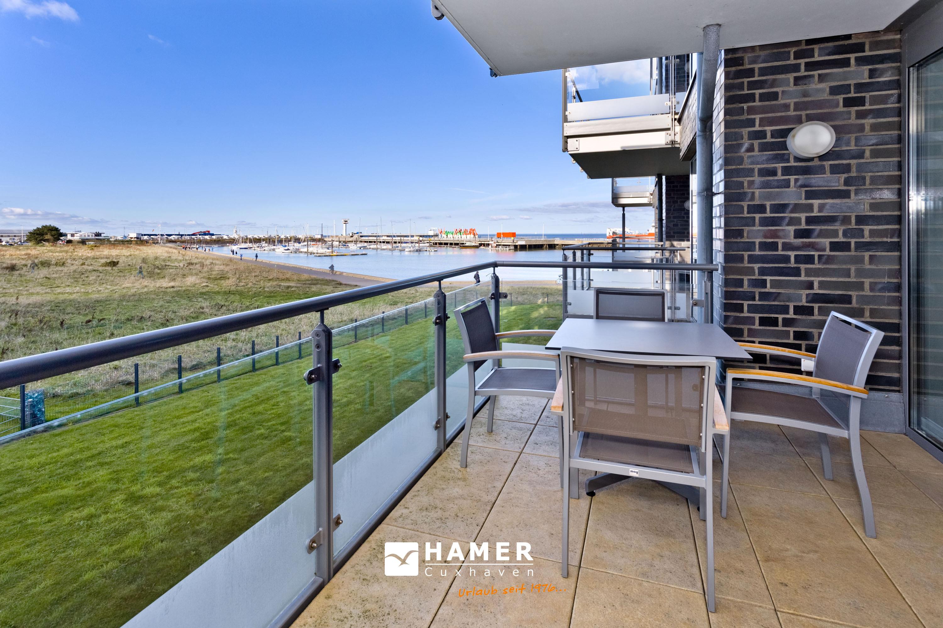 Mit Blick auf den Yachthafen erleben Sie hier einen der schönsten Ausblicke Cuxhavens. Komfortable 3 Zi. Luxus-Wohnung über 78m² bis 4 Pers., 1. Etage, großzügiges Wohnzimmer mit großem Balkon (west), vollständig ausgestattete Küchenzeile, 2 Schlafzimmer mit Doppelbetten und Außenjalousien, 2xTV, DVD, Radio/CD, kostenloses W-Lan-Internet, 1xDu/WC, 1x Gäste-WC, reservierter Außenstellplatz, freie Saunanutzung, Nichtraucher, keine Haustiere.