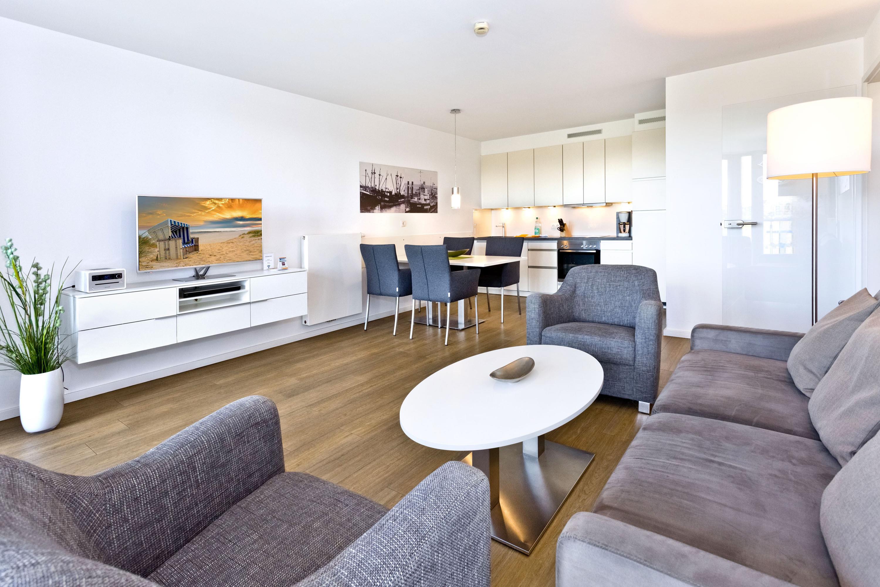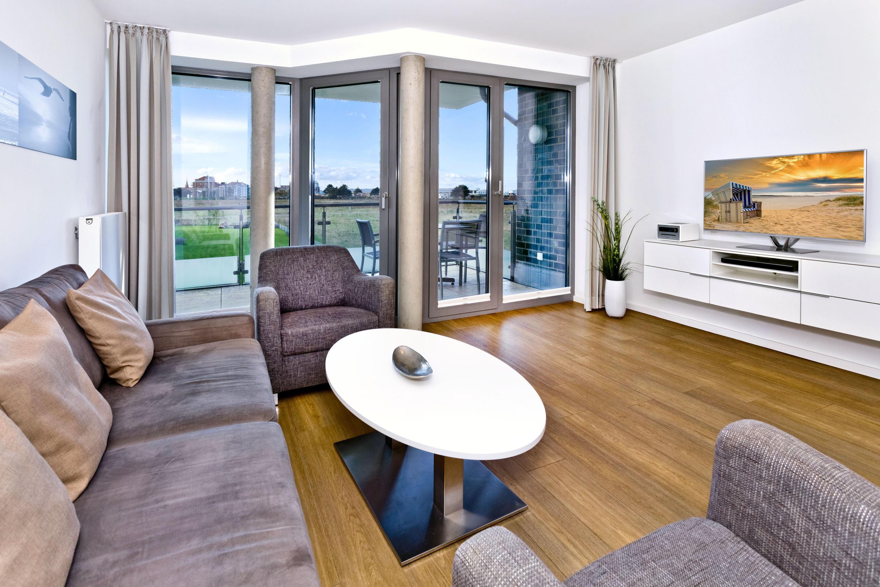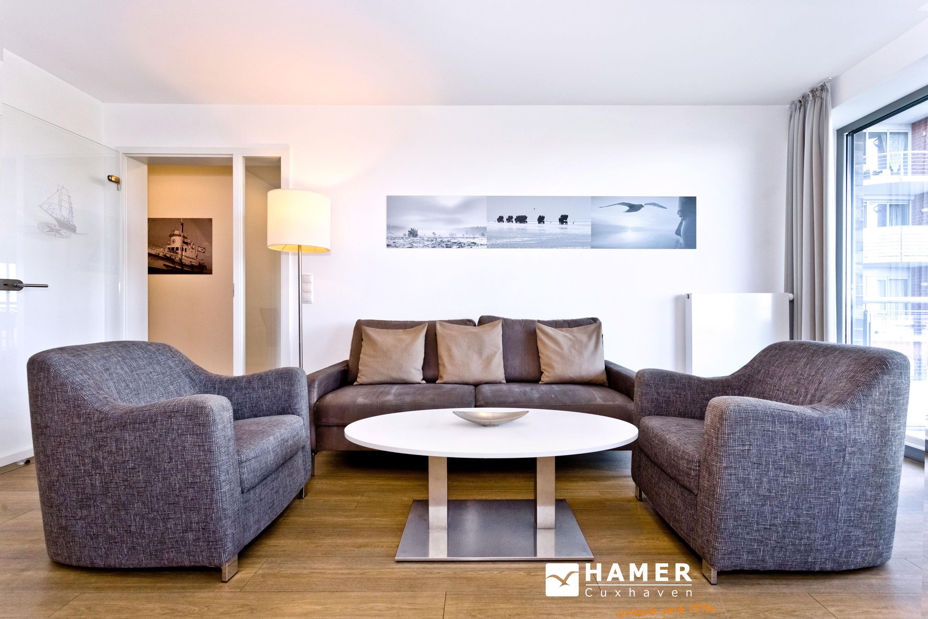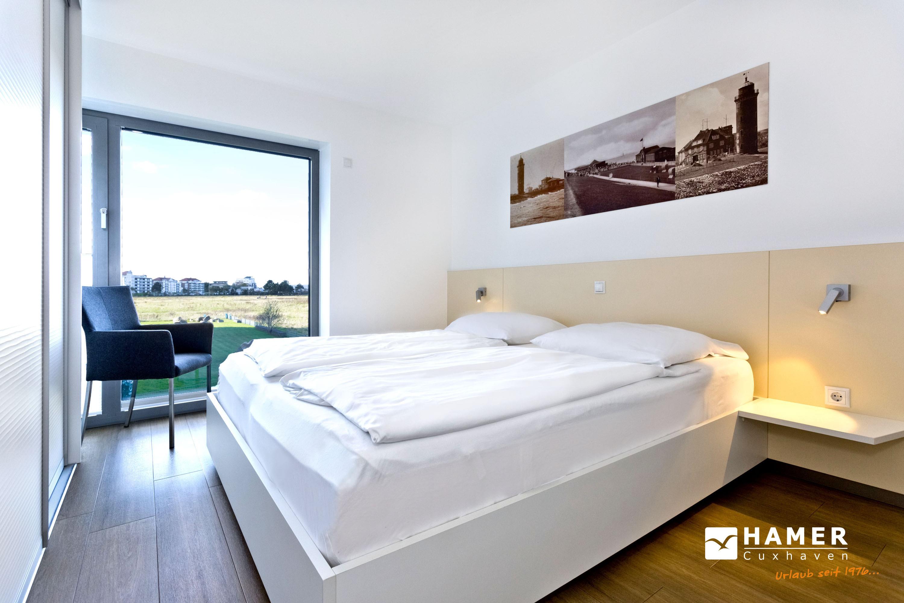 Mit Blick auf den Yachthafen erleben Sie hier einen der schönsten Ausblicke Cuxhavens. Komfortable 3 Zi. Luxus-Wohnung über 78m² bis 4 Pers., 1. Etage, großzügiges Wohnzimmer mit großem Balkon (west), vollständig ausgestattete Küchenzeile, 2 Schlafzimmer mit Doppelbetten und Außenjalousien, 2xTV, DVD, Radio/CD, kostenloses W-Lan-Internet, 1xDu/WC, 1x Gäste-WC, reservierter Außenstellplatz, freie Saunanutzung, Nichtraucher, keine Haustiere.