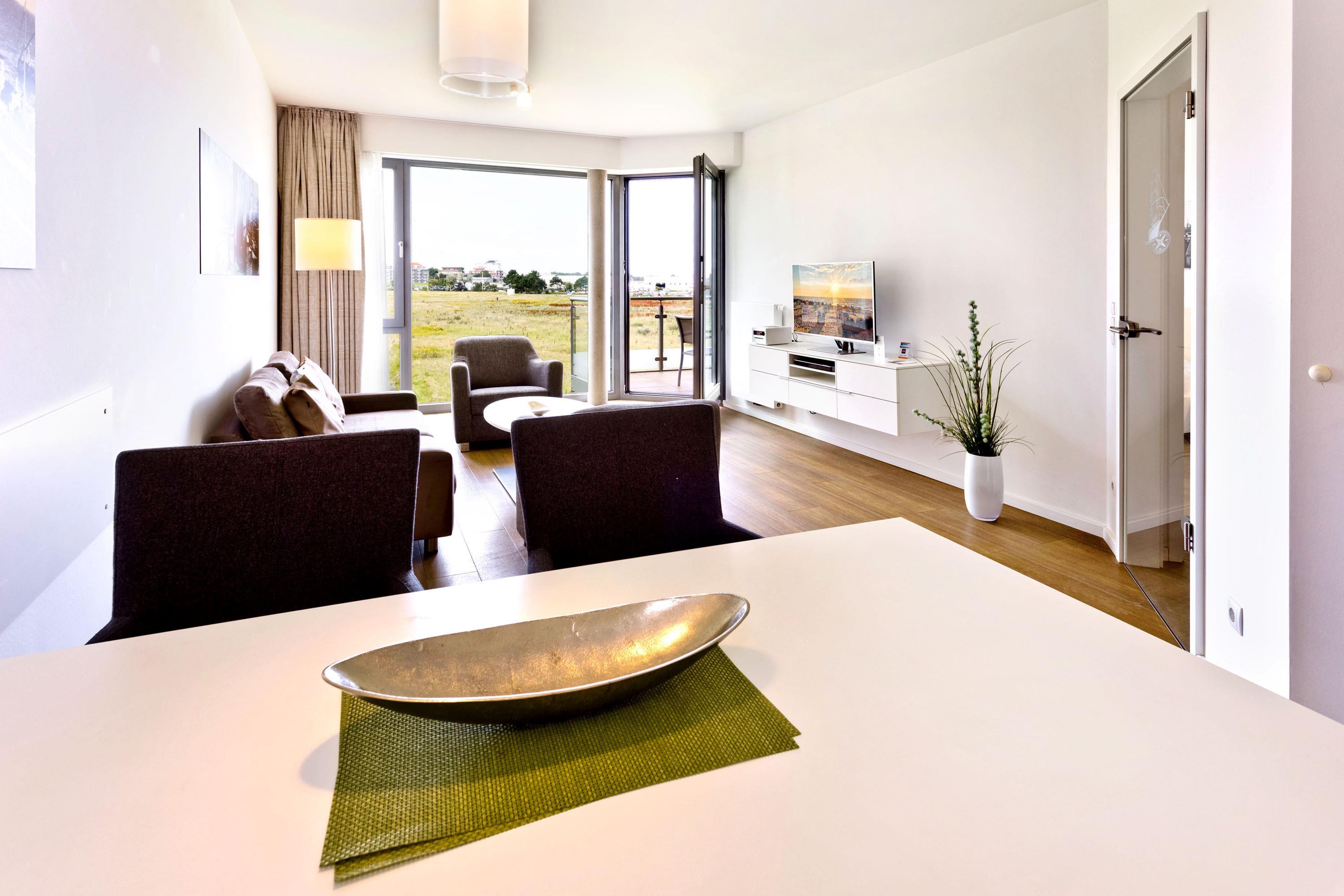 Traumhafte 2-Raum-Wohnung mit voller Seesicht in der 2.Etage mit großem Balkon (nord/west). Die vollständige Küchenzeile mit Mikro, Back., Geschirrsp. etc. garantiert höchsten Komfort. 3D-SAT-TV, Blue-Ray-DVD, Kompaktanlage, kostenloses W-Lan-Internet, separates Schlafzimmer mit Außenjalousien und hochwertigem Doppelbett, allergikerfreundlich, ebenerdige Dusche/WC, Föhn, freie Saunanutzung, reservierter Tiefgaragenstellplatz, keine Haustiere und natürlich Nichtraucher.
