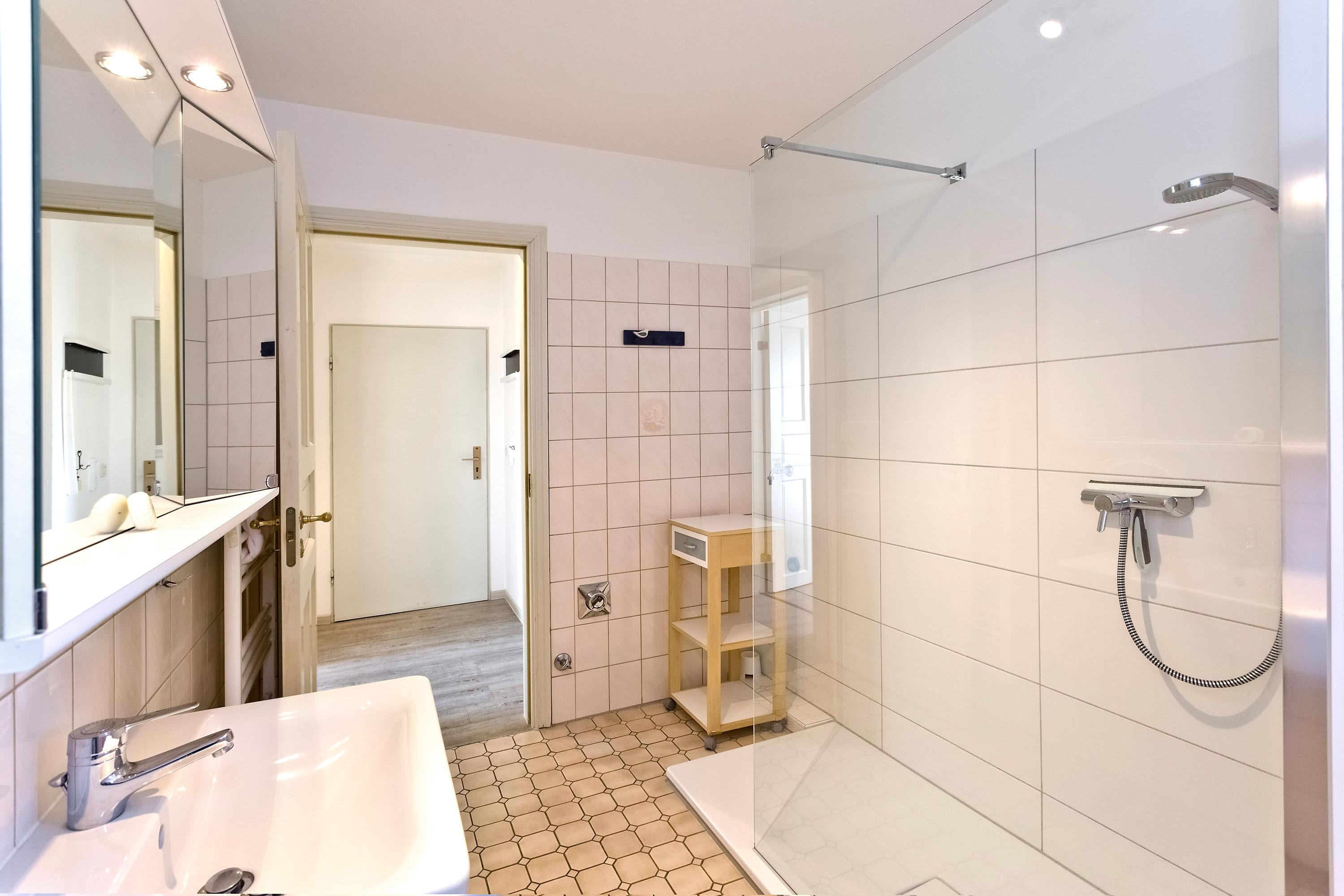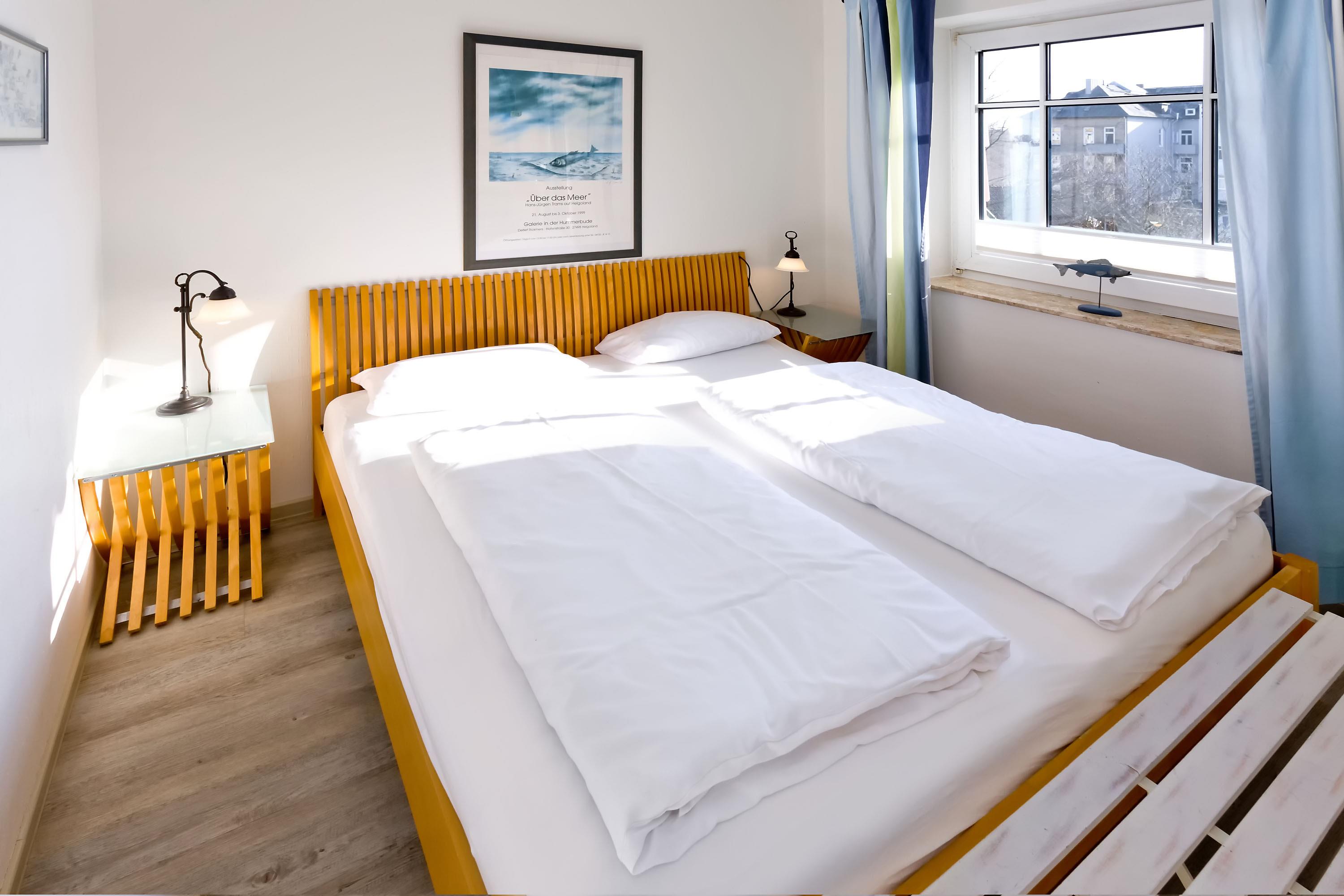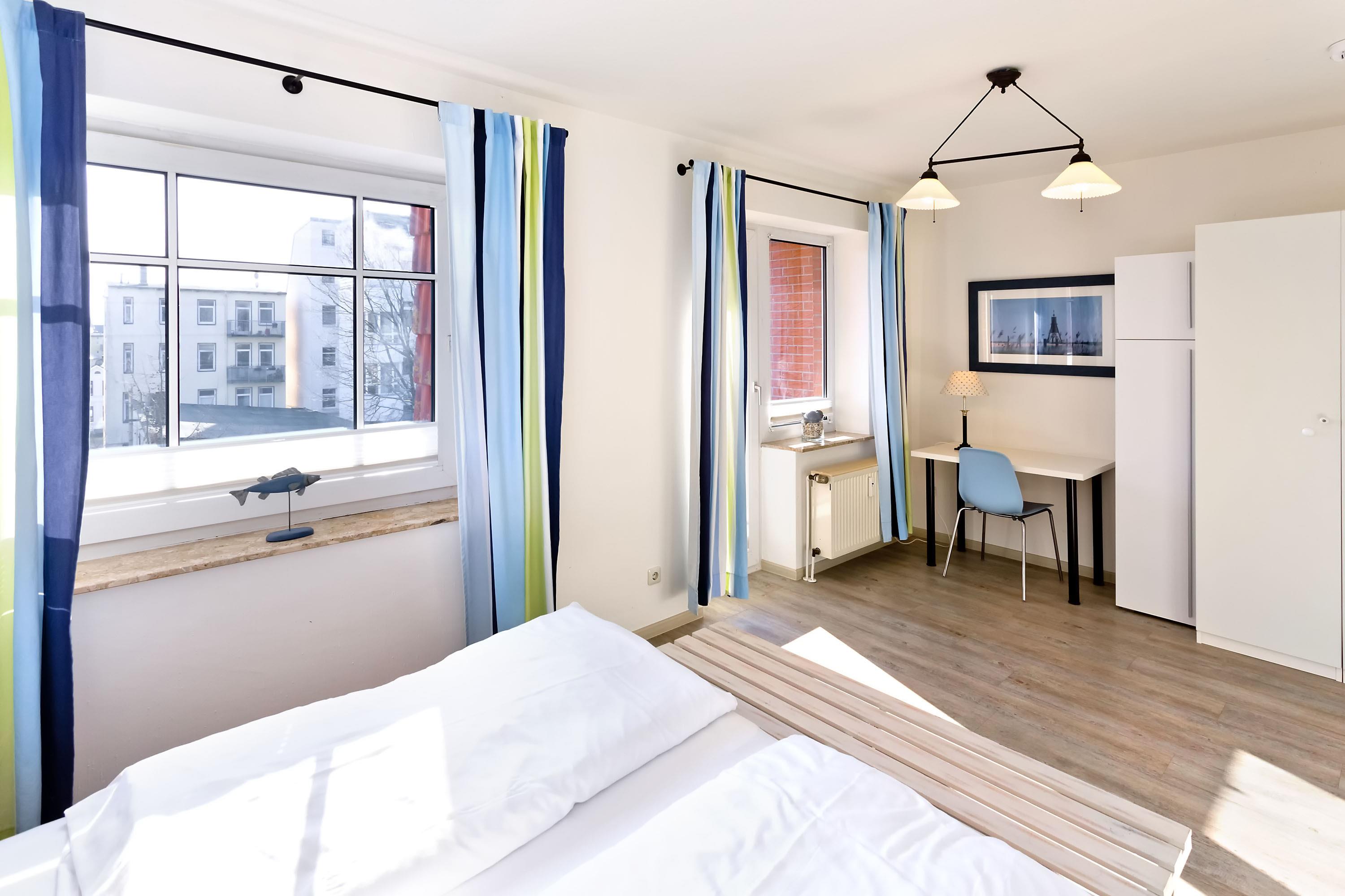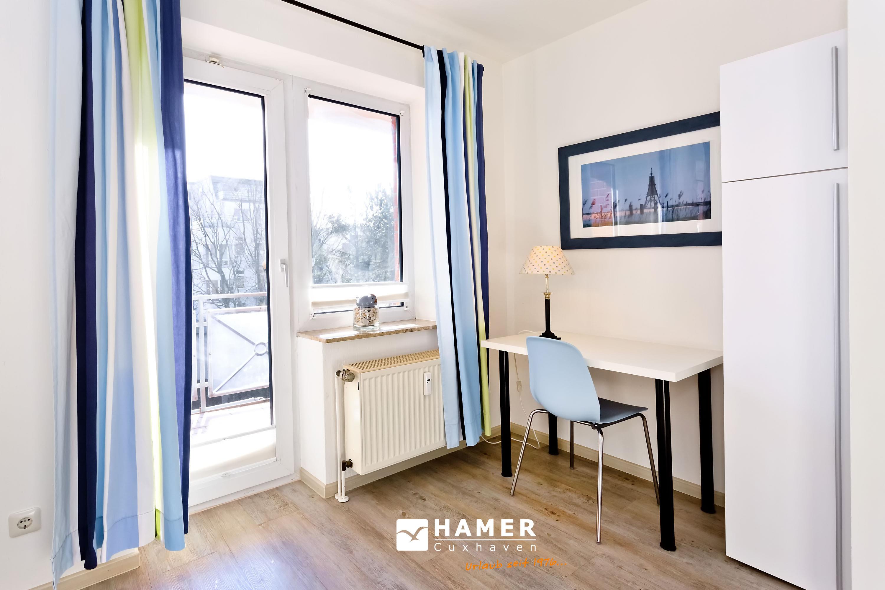 Schöne 2-Raum-Wohung mit Seesicht auf den Weltschifffahrtsweg für max. 2 Personen auf der 3. Etage ohne Aufzug. Wohnzimmer mit vollausgestatteter Küchenzeile ( Geschirrspüler, Mikrowelle mit Backfunktion, 2-Platten-Ceranfeld), Kabel-TV, kostenfreies W-Lan, ebenerdige Dusche, WC [&] Bidet, Schlafzimmer mit Doppelbett und Zugang zum sonnigen Südbalkon. PKW-Stellplatz #7 im Innenhof (Durchfahrtshöhe ca. 1,85m).