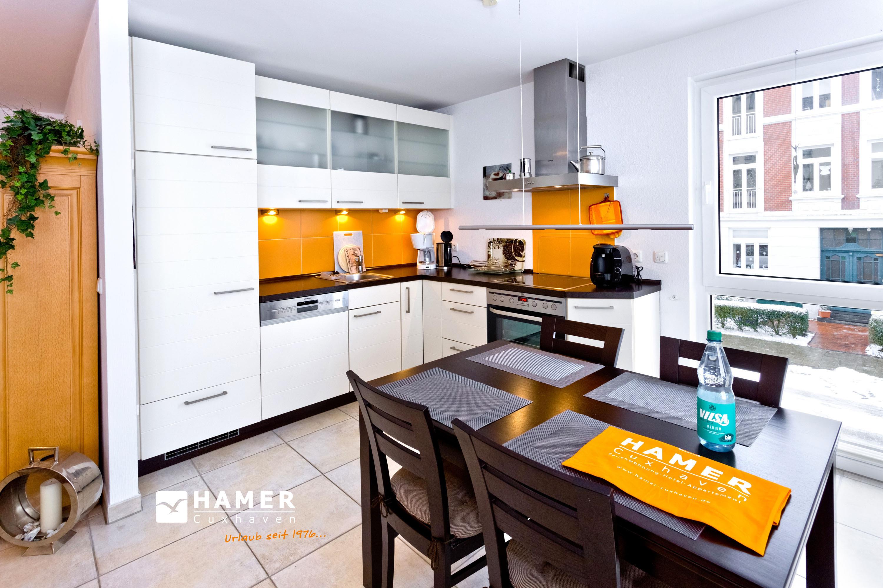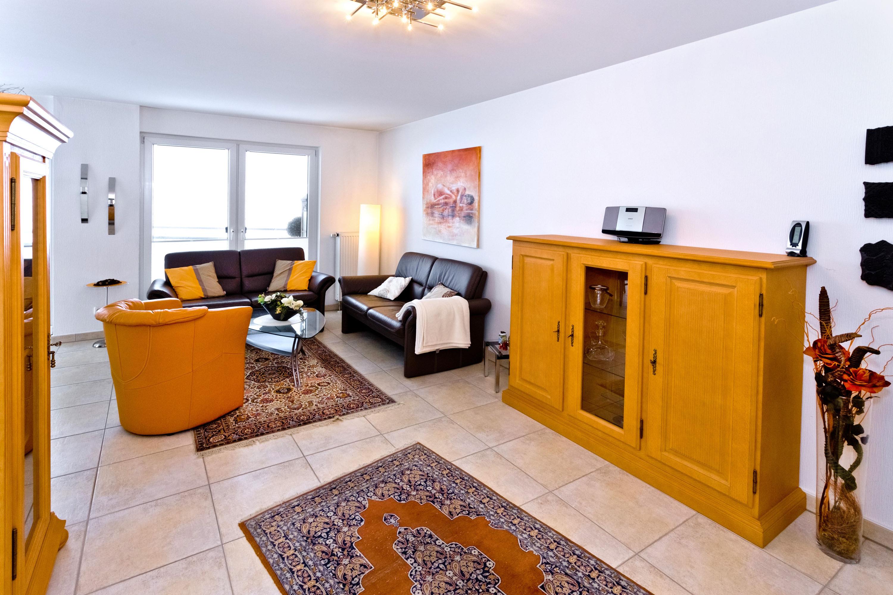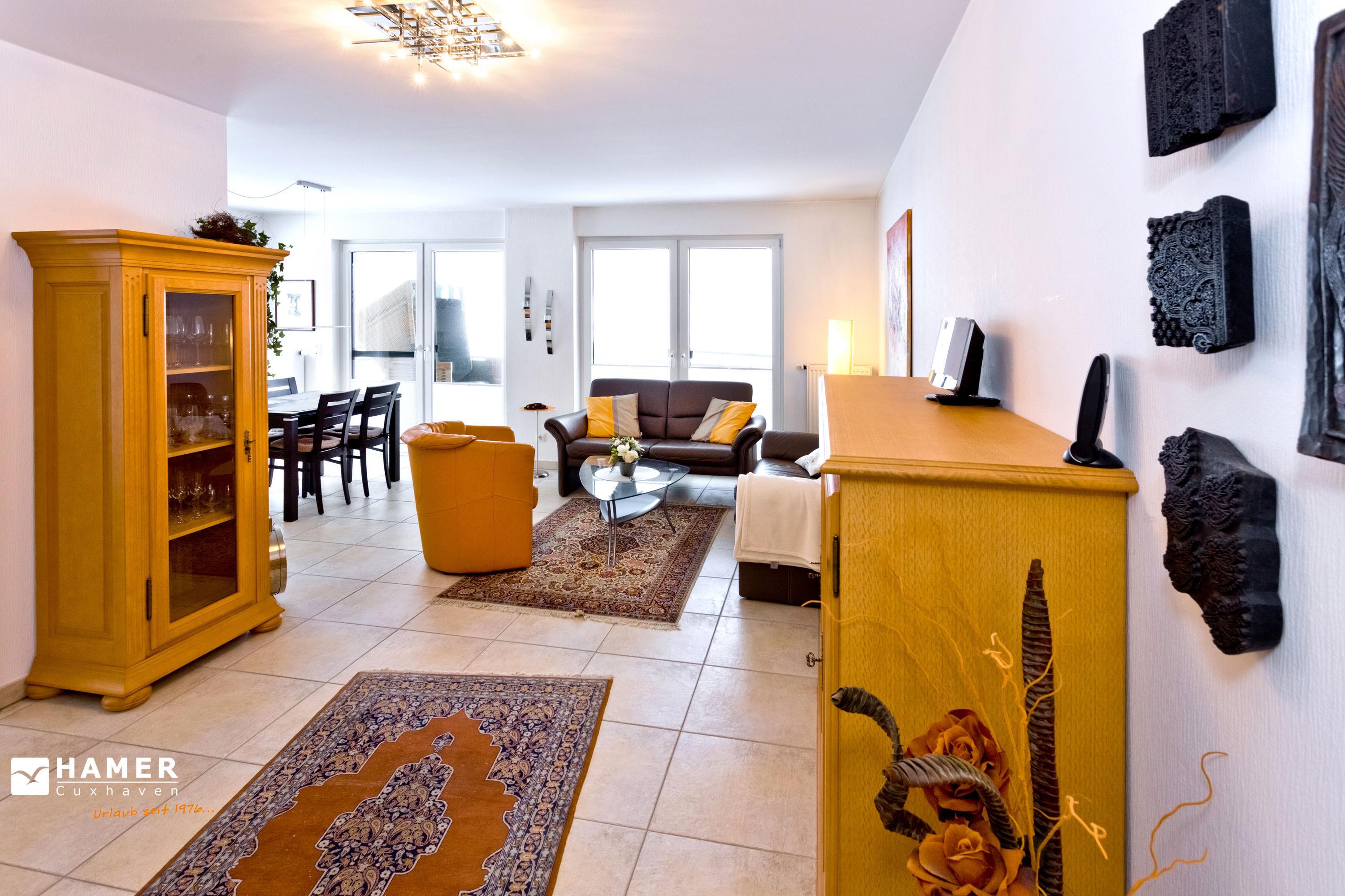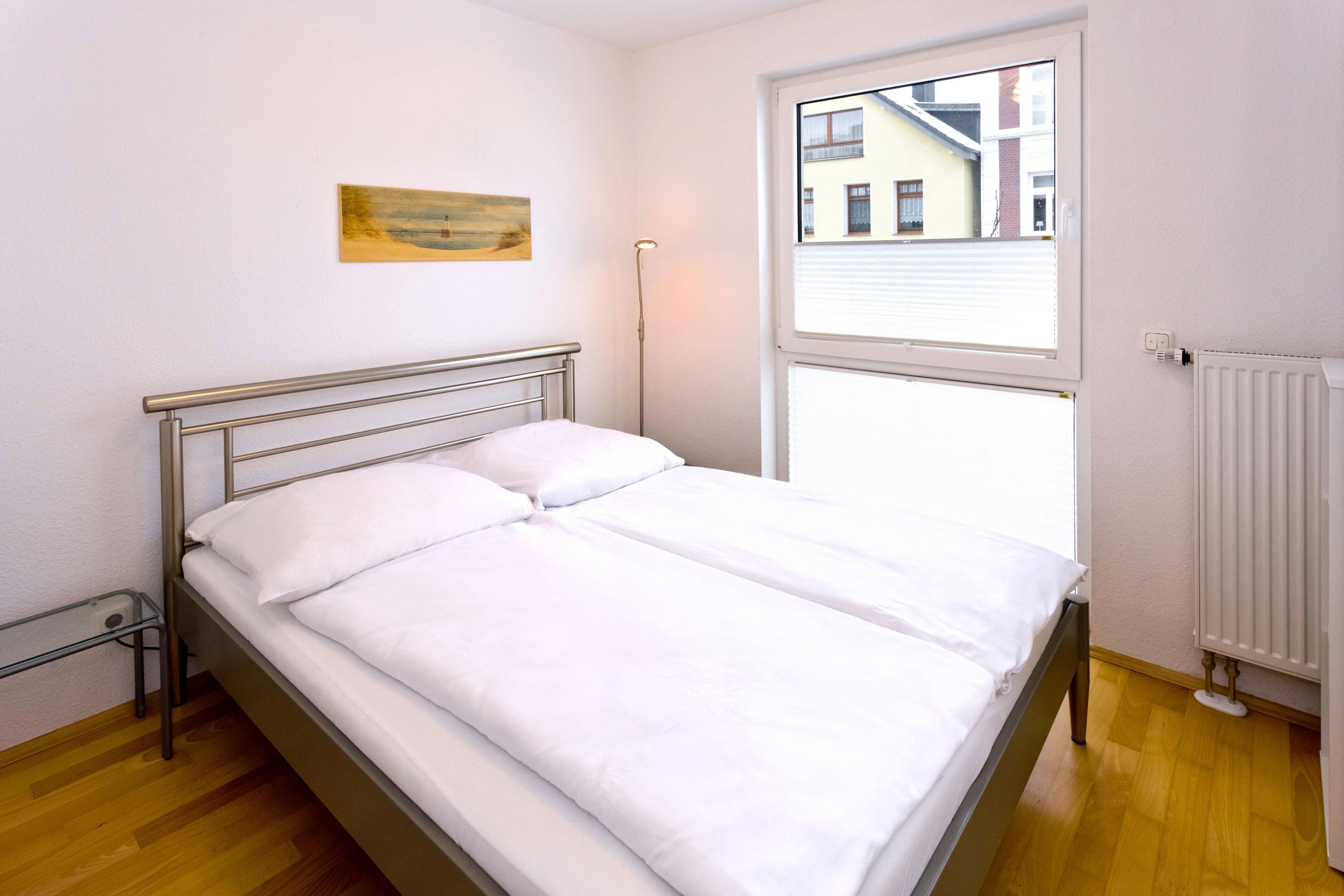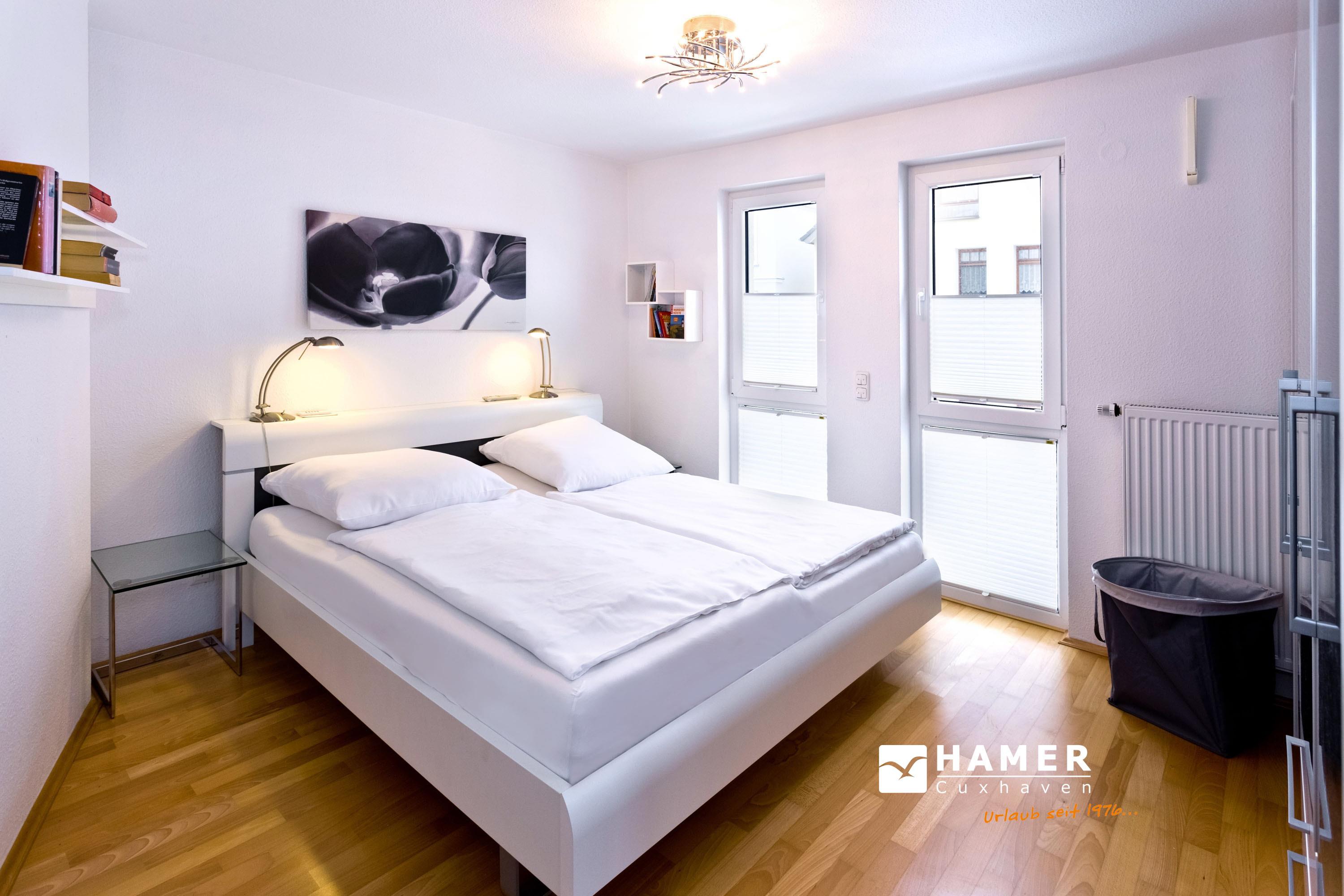 Schöne 3-Zimmer-Wohnung auf der 1.Etage in der Grimmershörnbucht für bis zu 4 Pers., 1 Schlafzimmer mit Doppelbett und TV, 1 Schlafzimmer mit franz. Doppelbett (1,40m x 1,90m). Bad mit ebenerdiger Dusche und WC. Wohnzimmer mit vollausgestatteter Küchenzeile (Backofen, Geschirrspüler), Sat-TV, kostenloses W-Lan (offenes Netzwerk), großer Balkon (nord) mit Strandkorb, Einzelgarage #4 im Innenhof mit elektr. Tor, kostenfreie Waschmaschine/Trockner im Erdgeschoss, keine Haustiere erlaubt, Nichtraucher.