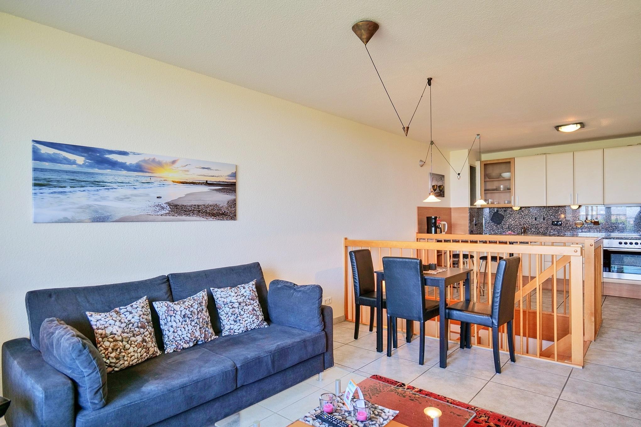 Schöne 2-Raum Wohnung über zwei Etagen auf ca. 60m² für 2 Personen. Das Schlafzimmer im EG mit Doppelbett Kabel-TV. Du/WC. Im 1. OG befindet sich das Wohnzimmer mit Kabel-TV und offener Küchenzeile mit Vollausstattung (Geschirrsp. Mikrow, Back,) Balkon zur Wasserseite mit dem einmaligen Blick auf die Elbmündung. W-Lan kostenfrei. Die Wohnung ist komplett gefliest, verfügt über Fußbodenheizung und ist allergikergerecht ausgestattet. Tiefgaragenstellplatz #3, Keine Haustiere erlaubt. Nichtraucher