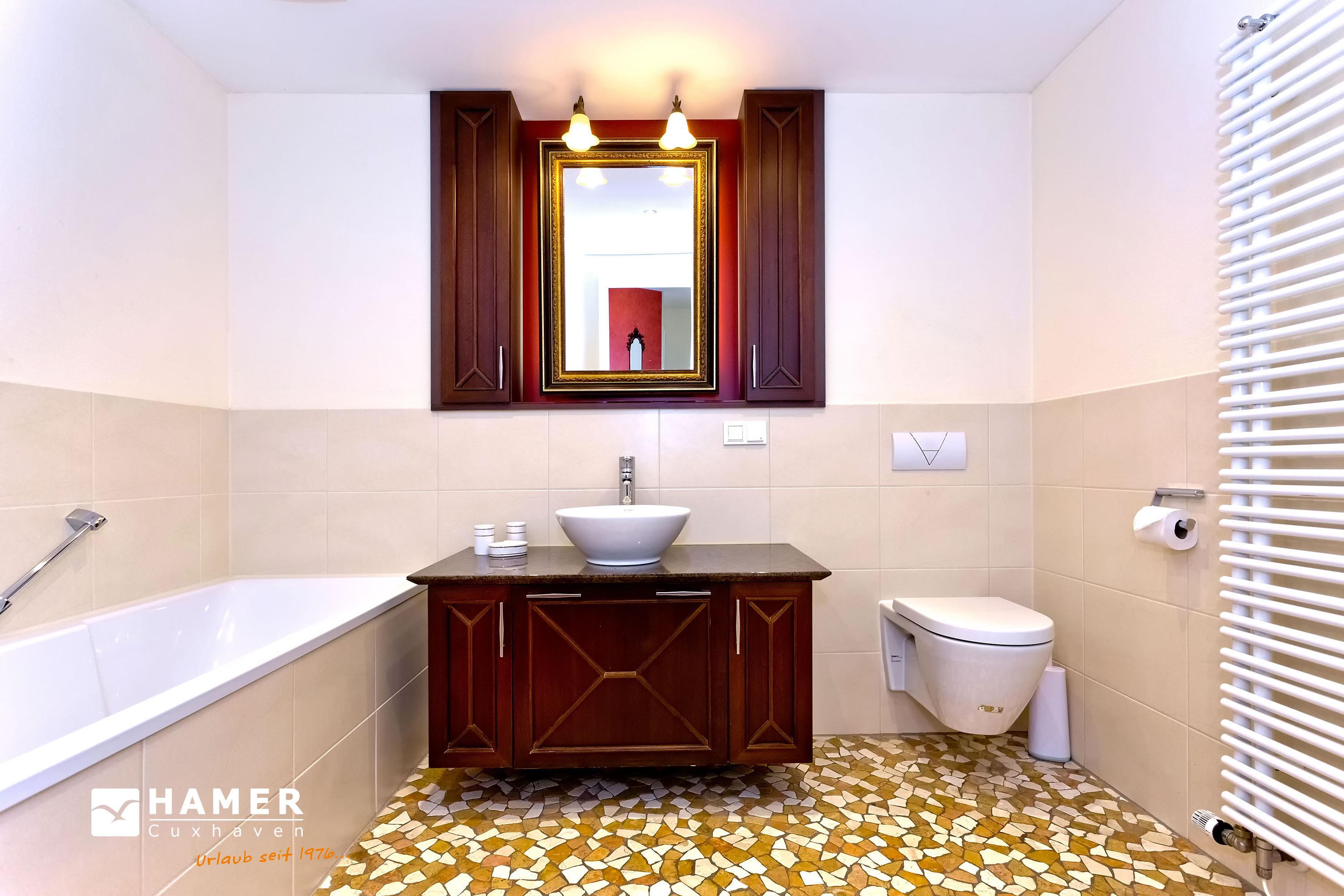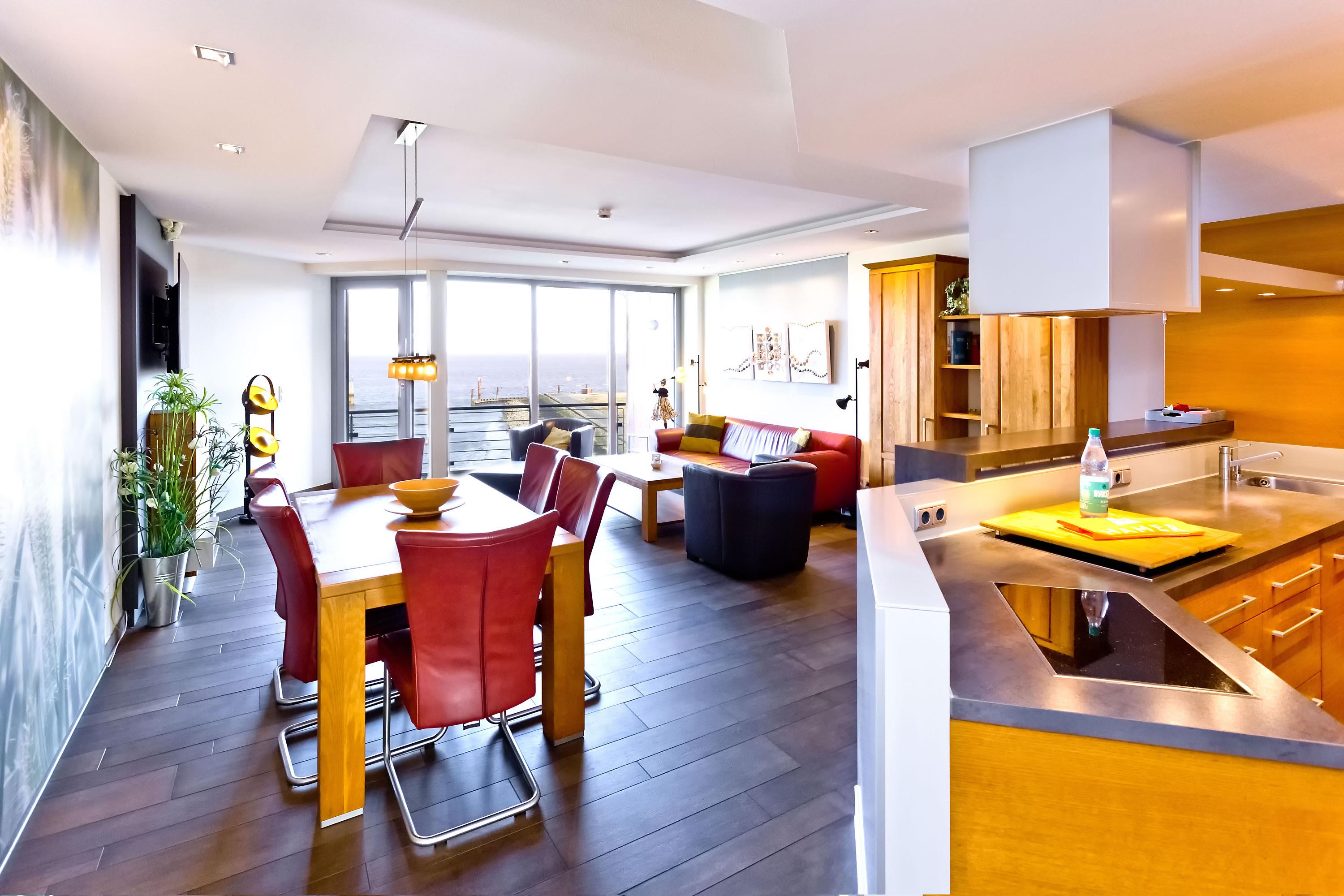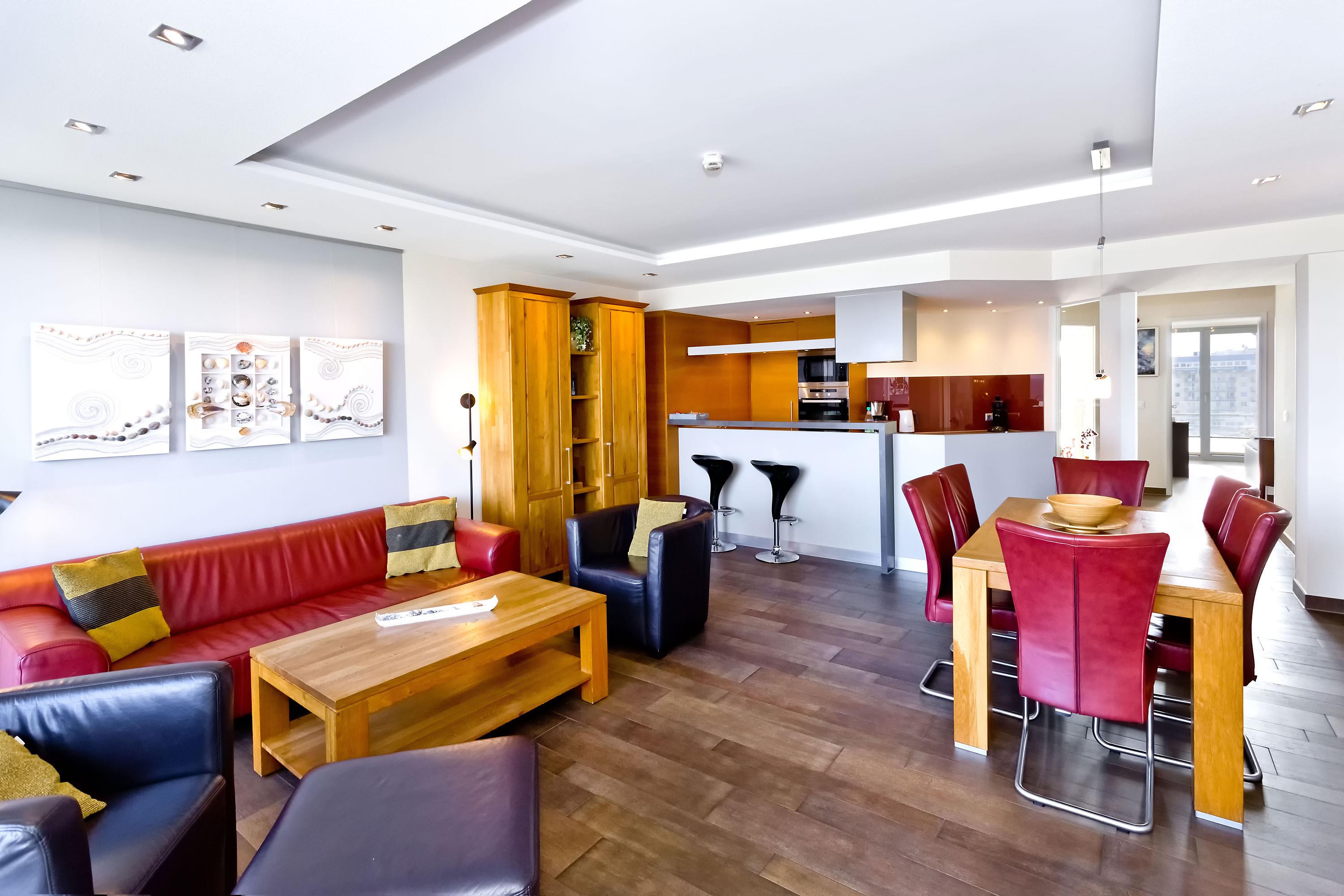 Sehr geschmackvolle, tolle Wohnung in der 3.Etage über 102m². Hier haben Sie den Traumseeblick auf die vorbeiziehenden Schiffe. 1 Schlafzimmer mit Doppelbett TV, 1 Schlafzimmer mit Einzelbetten, beide Schlafzimmer mit Rollladen, Du/Wc, Bad//Wc, großes Wohnzimmer TV/DVD, offene u. vollständige Miele-Küche, 1 Balkon (nord) mit Blick auf die Elbe, 1 Balkon (süd) mit Blick auf den Hafen, alle Räume sind hochwertig gefliest. Zur Wohnung gehört je ein reservierter Stellplatz in der Tiefgarage und auf dem Außengelände. Nichtraucher, keine Haustiere.