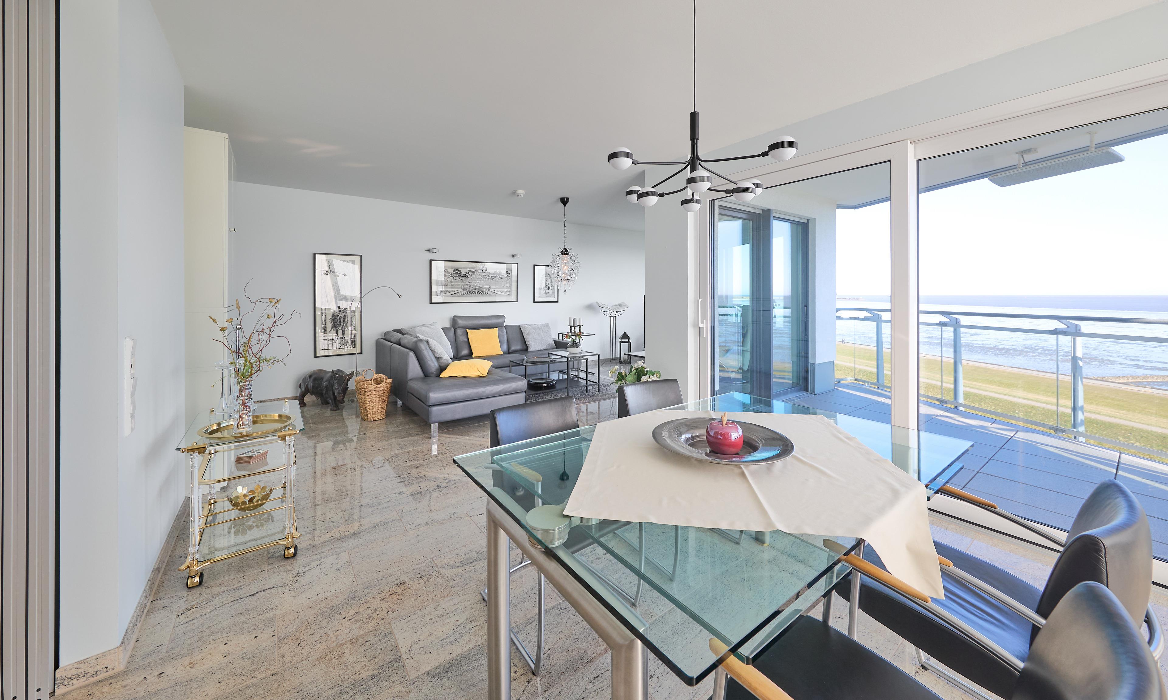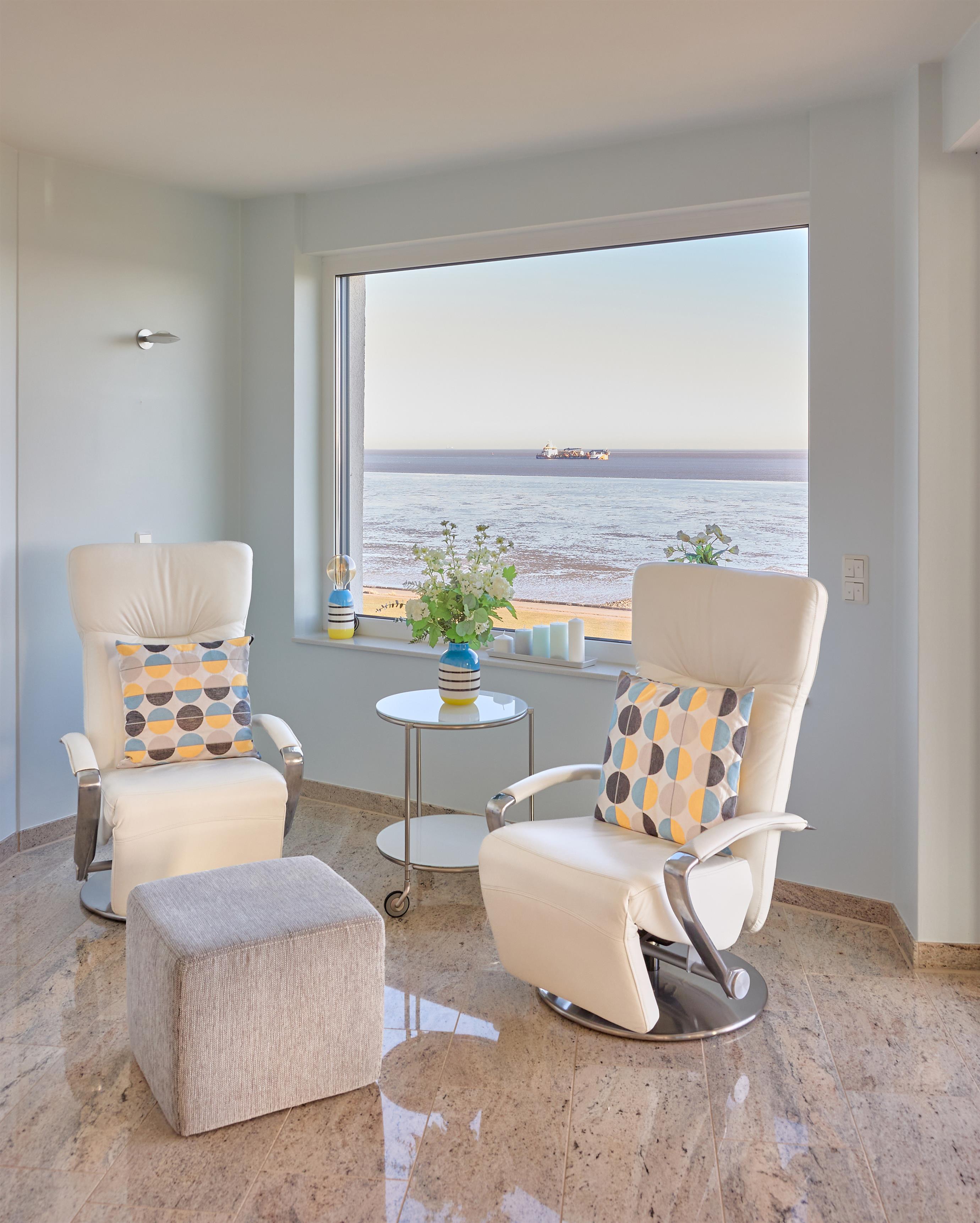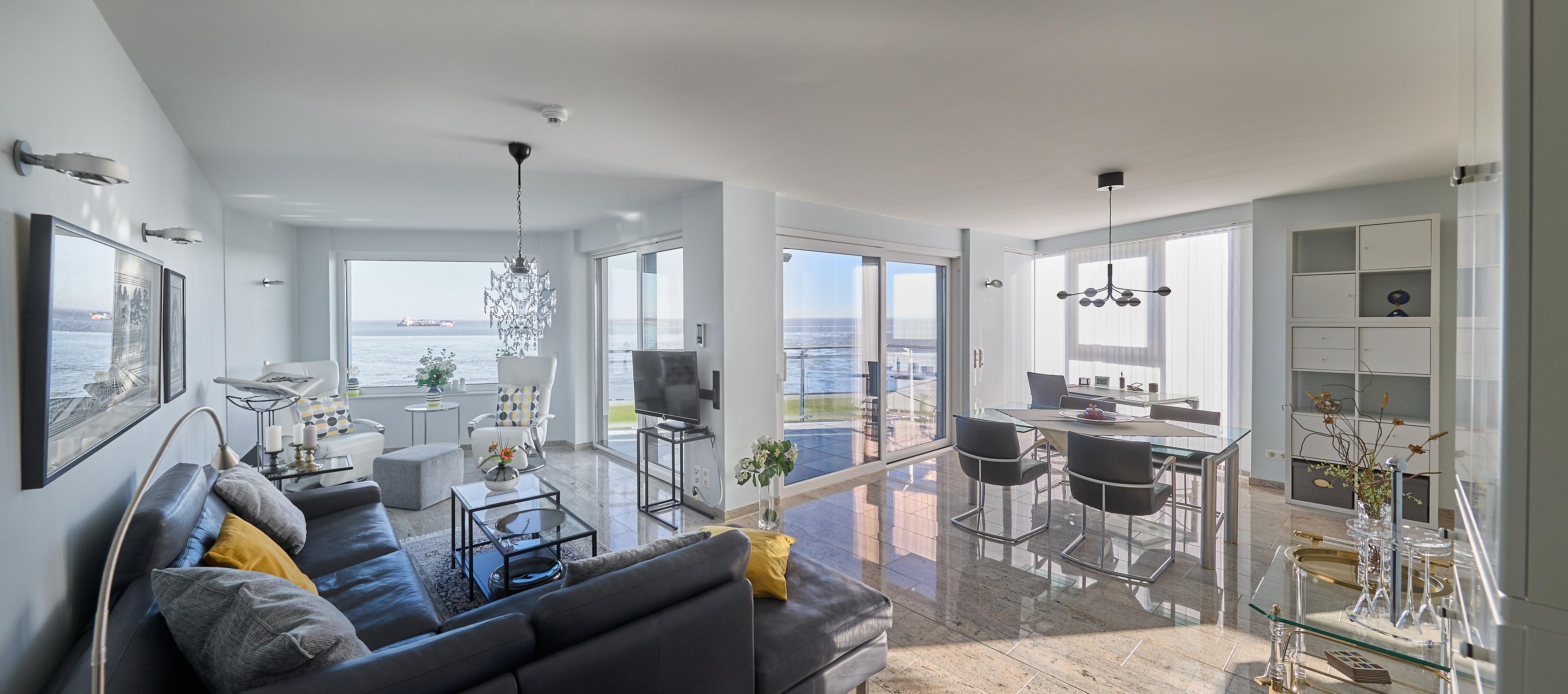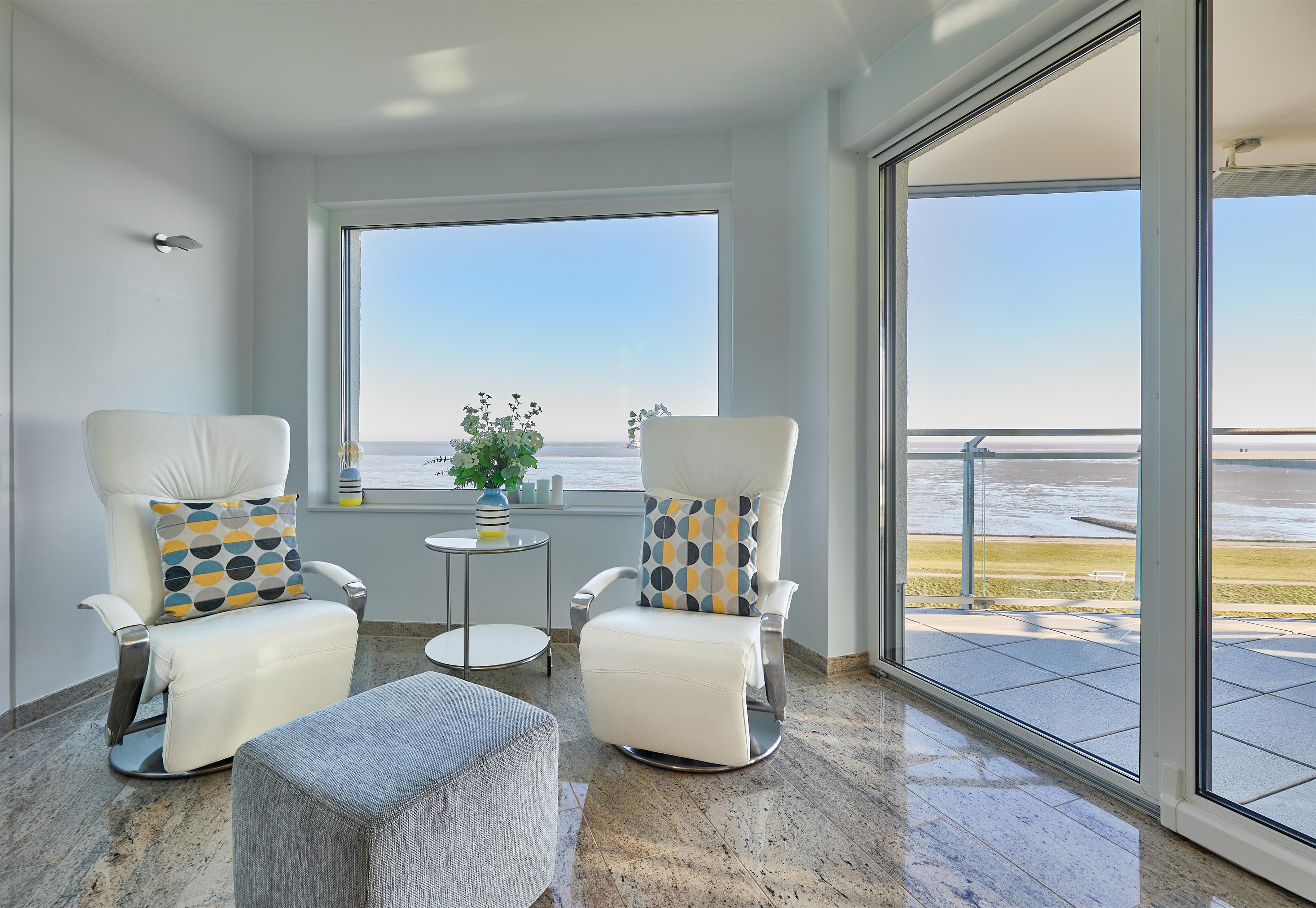 Im Wohnbereich sorgen eine hochwertige Eck-Ledercouch und zwei Sessel, die zum Fenster ausgerichtet sind, für eine gemütliche Atmosphäre. Hier können Sie entspannen und den Blick auf die Elbmündung oder die vorbeiziehenden Schiffe genießen. Der Balkon bietet einen geschützten Platz, um die frische Meeresluft zu genießen – selbst bei kühleren Brisen. Die gesamte Wohnung ist mit hochwertiger Beleuchtung und zur zusätzlichen Komfortverbesserung auch mit Lichtbewegungsmeldern, z.B. im Flur ausgestattet. Im Flur finden Sie neben der offenen Garderobe auch einen großen Garderobenschrank vor.