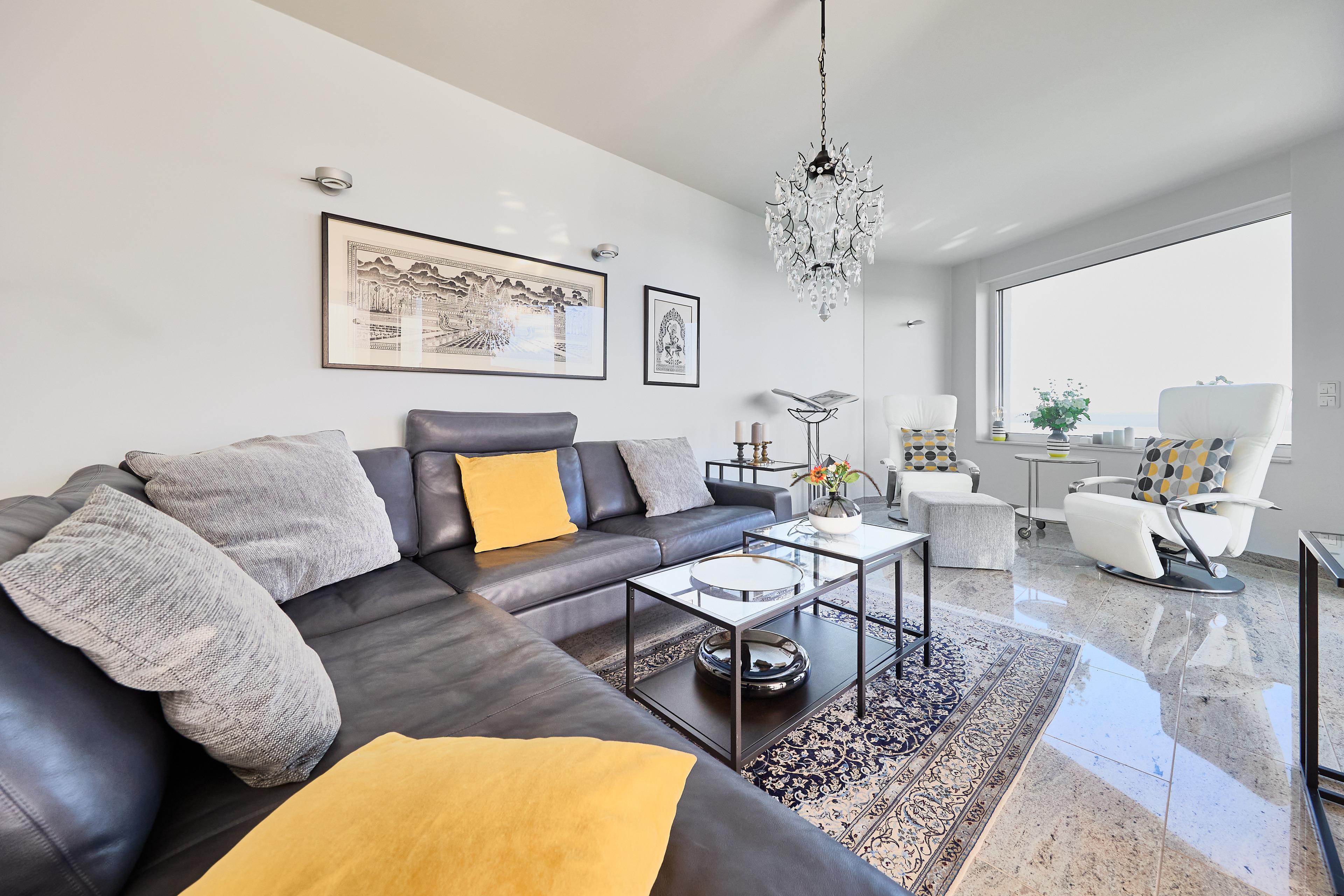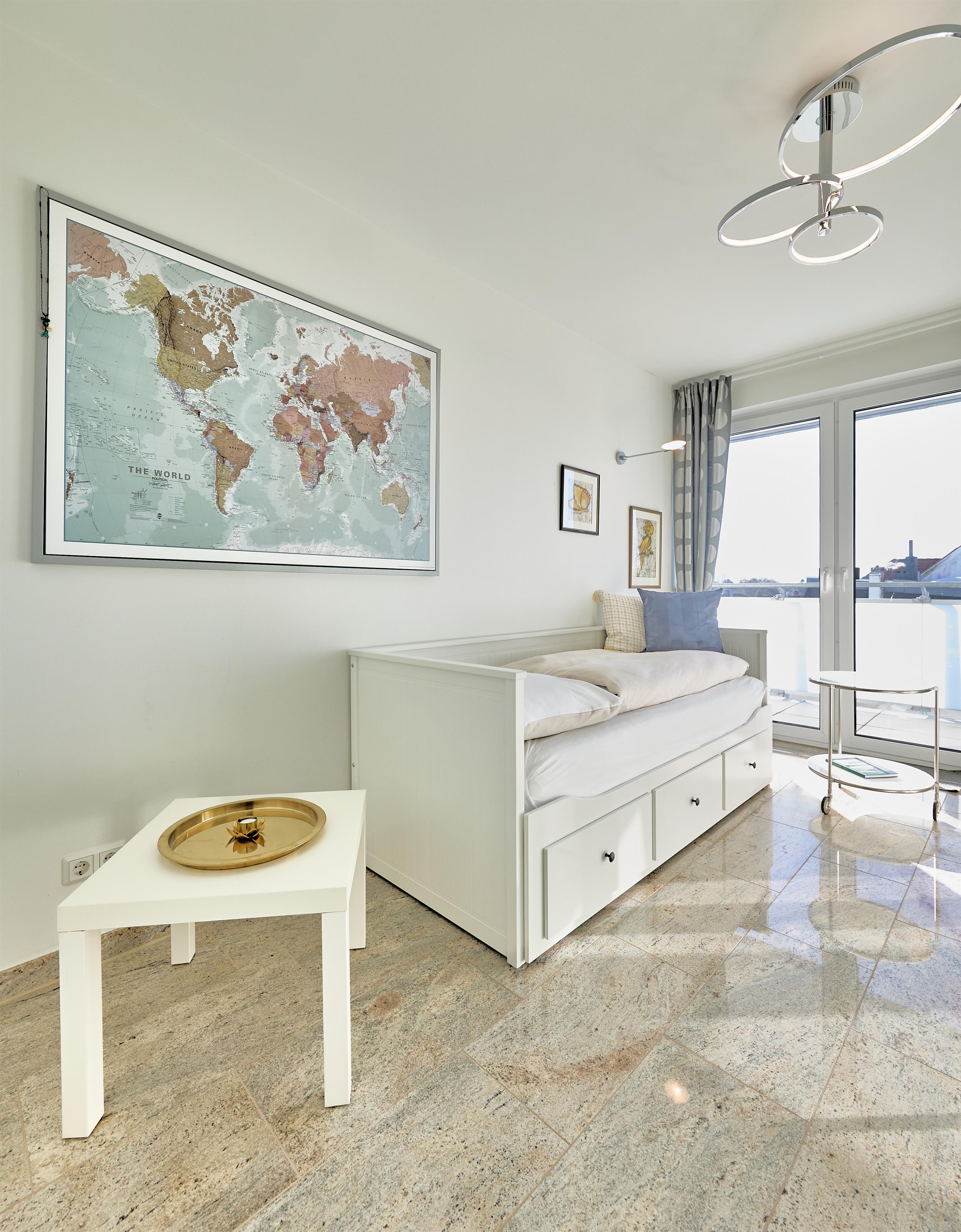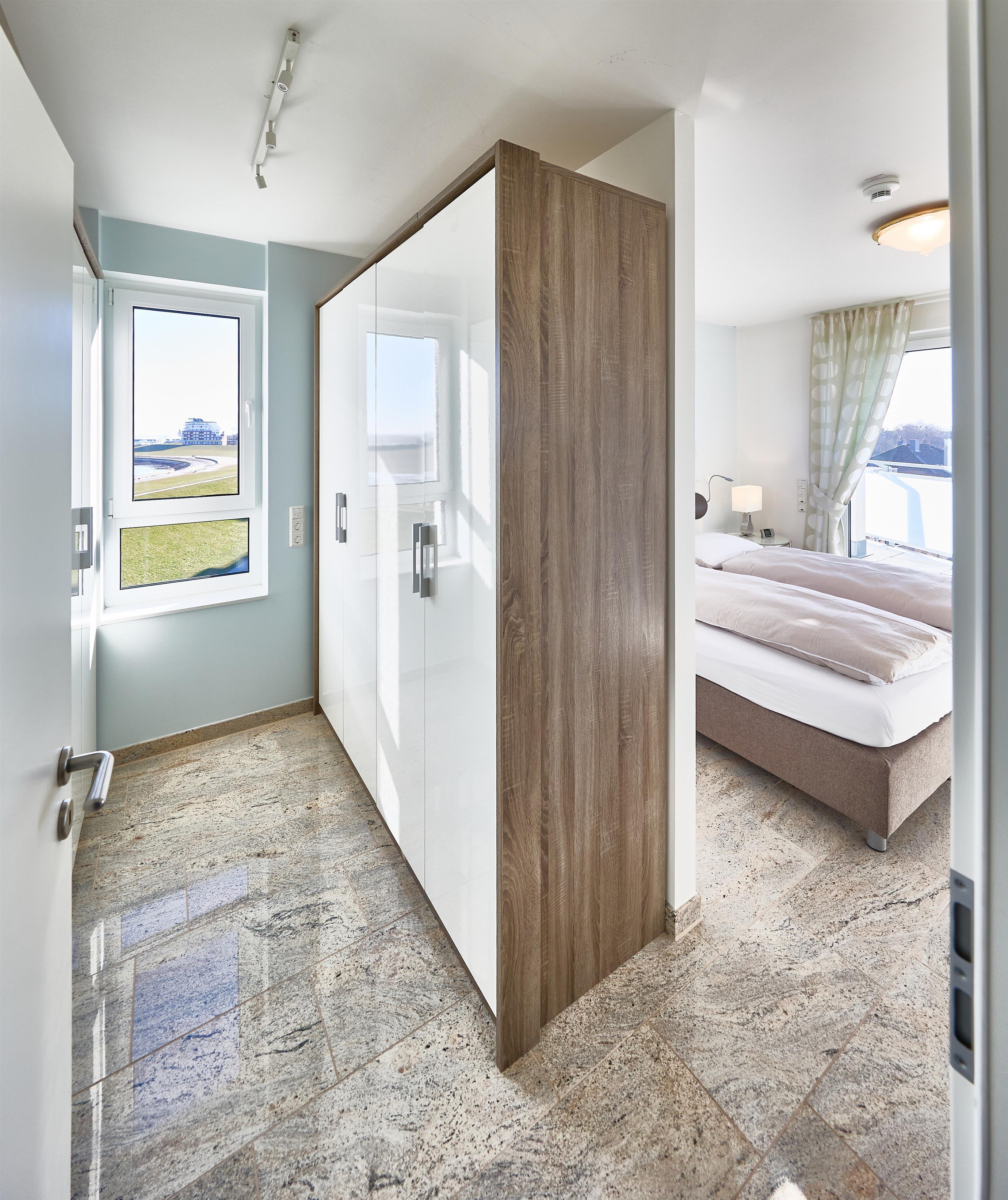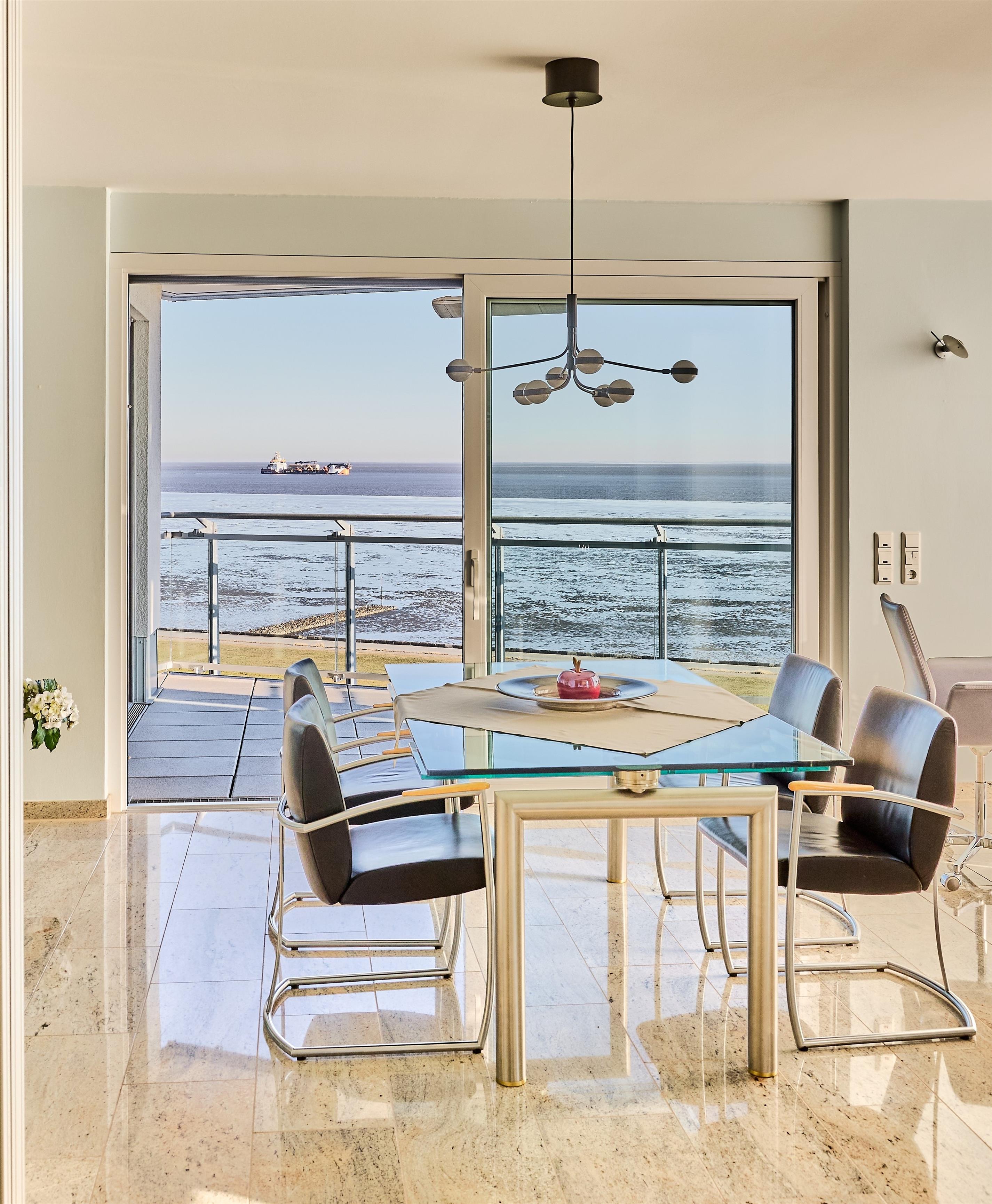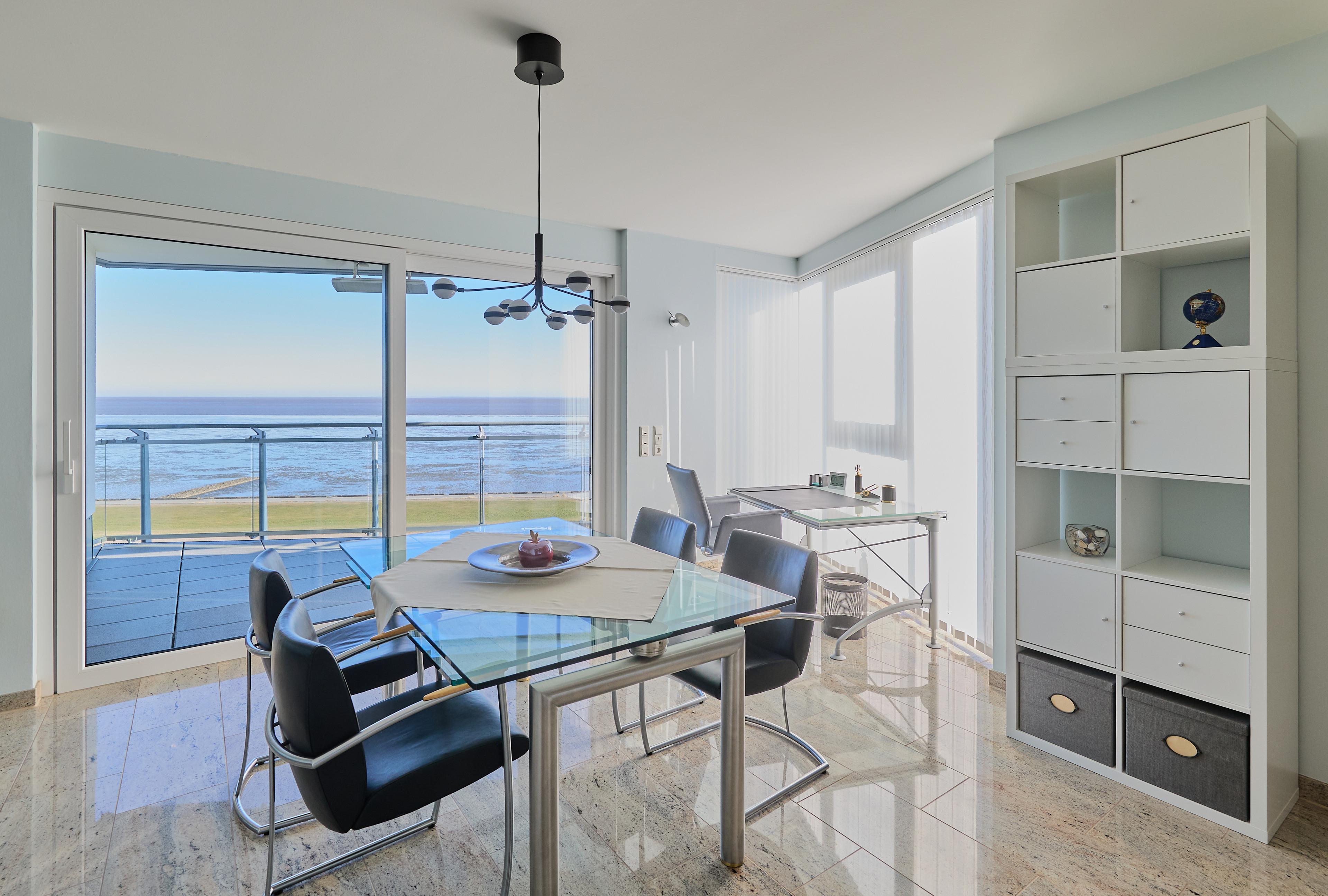 Im Wohnbereich sorgen eine hochwertige Eck-Ledercouch und zwei Sessel, die zum Fenster ausgerichtet sind, für eine gemütliche Atmosphäre. Hier können Sie entspannen und den Blick auf die Elbmündung oder die vorbeiziehenden Schiffe genießen. Der Balkon bietet einen geschützten Platz, um die frische Meeresluft zu genießen – selbst bei kühleren Brisen. Die gesamte Wohnung ist mit hochwertiger Beleuchtung und zur zusätzlichen Komfortverbesserung auch mit Lichtbewegungsmeldern, z.B. im Flur ausgestattet. Im Flur finden Sie neben der offenen Garderobe auch einen großen Garderobenschrank vor.