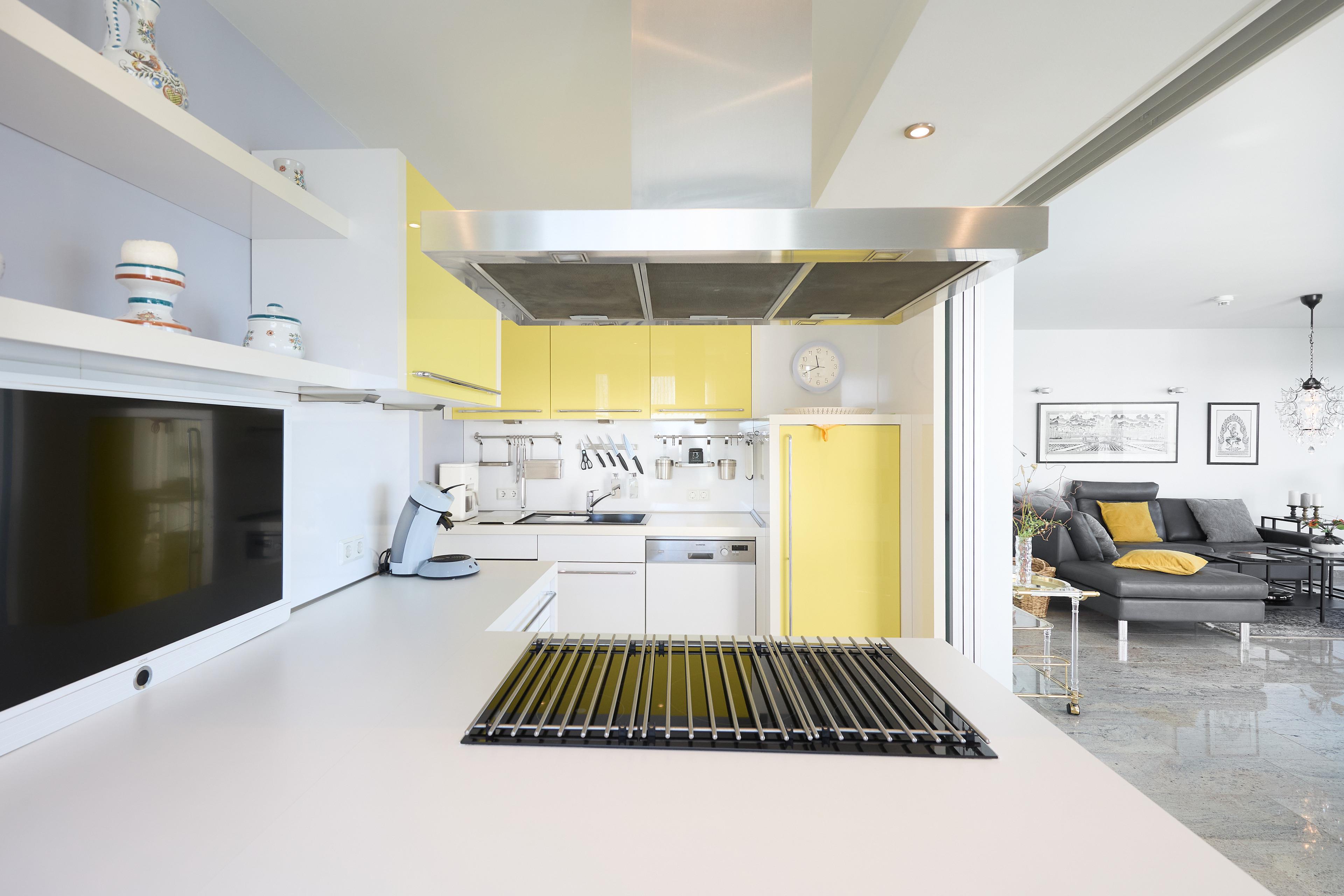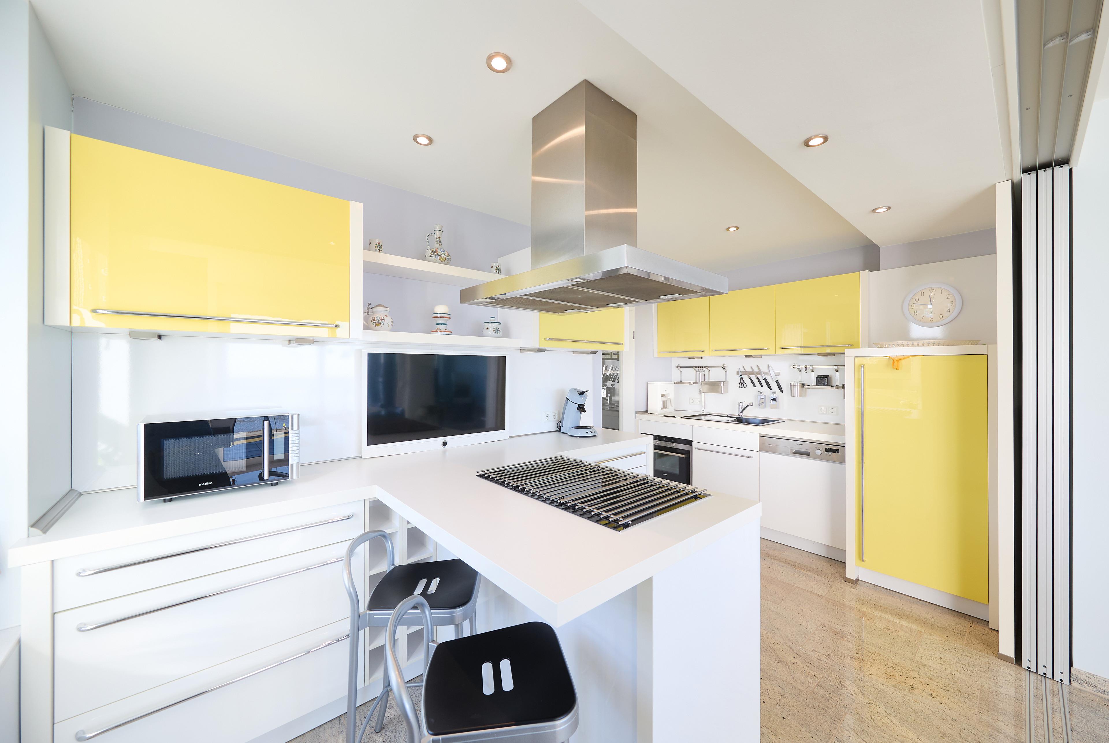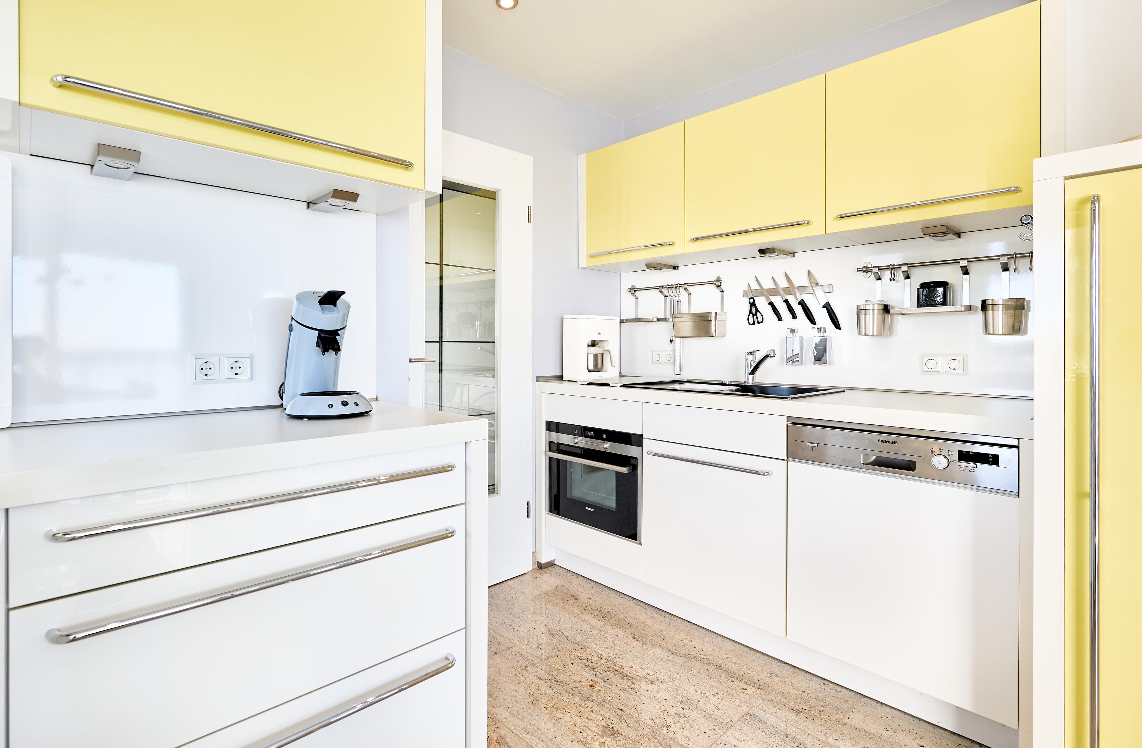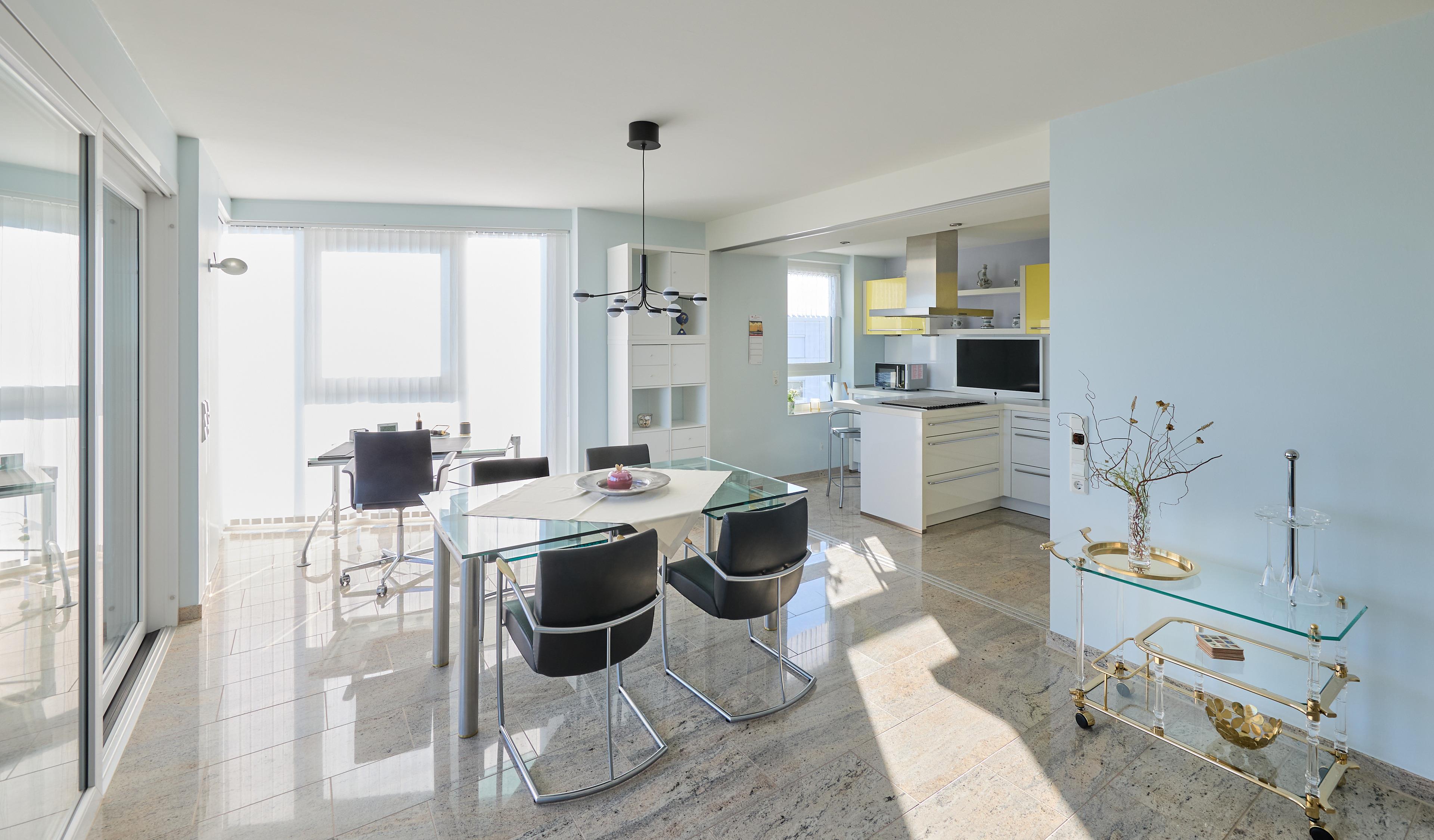 Die offene Einbauküche, die von 2 Seiten begehbar ist, ist ein Paradies für Hobbyköche und bietet alles, was Sie brauchen: einen Geschirrspüler, ein Cerankochfeld, einen Kühlschrank mit Gefrierfach sowie ein Weinregal. Ein zusätzlicher Fernseher sorgt dafür, dass Sie auch vom Essbereich aus bequem fernsehen können. Am Küchentresen mit zwei Stühlen können Sie entspannt frühstücken und sich aus der zusätzlichen Kaffeepadmaschine ein Kaffee zubereiten, bevor Sie gemeinsam am Esstisch Platz nehmen, der bis zu vier Personen bequem Platz bietet und einen wunderbaren Panoramablick, wie aus dem gesamten Wohn- Ess- und Küchenbereich in Richtung Seeseite bietet.